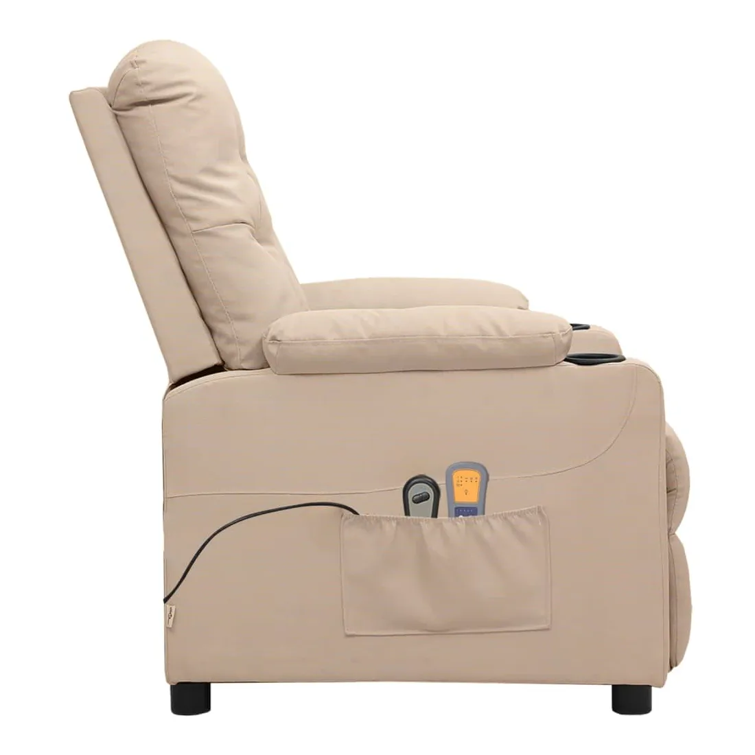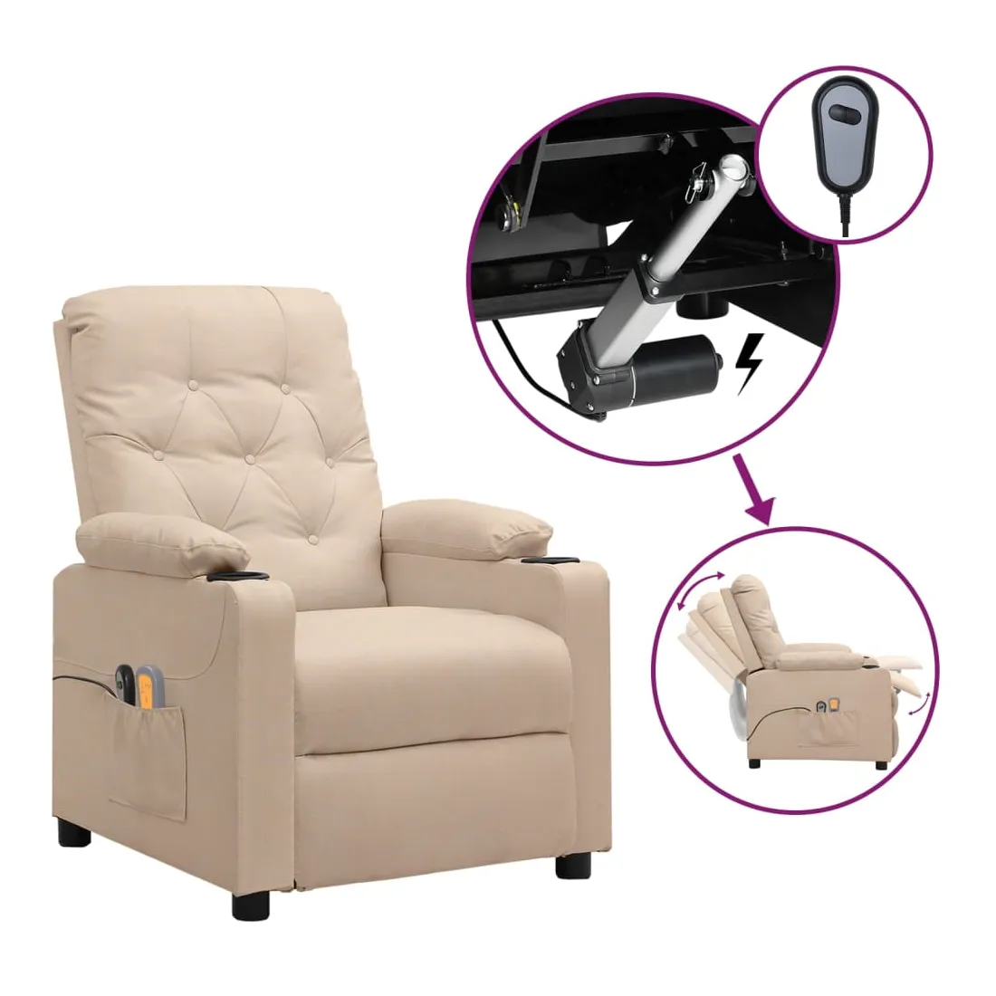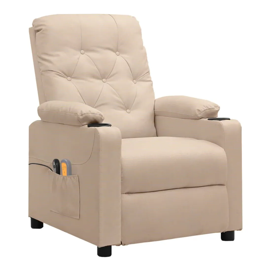 Asseyez-vous et détendez-vous dans ce fauteuil de massage électrique très confortable ! Fonction d'inclinaison électrique : le fauteuil inclinable est équipé d'un moteur électrique pour la fonction d'inclinaison. Il offre 3 positions d'inclinaison et vous pouvez facilement régler le dossier et le repose-pied à l'aide de la commande manuelle à 2 boutons incluse, en fonction de votre confort.Fonction de vibration : les 6 points de massage vous permettent de faire l'expérience d'un massage mieux ciblé. De plus, la télécommande incluse vous permet de choisir différents programmes de massage. La fonction de massage est alimentée par le connecteur USB, mais la source d'alimentation USB 5V certifiée n'est pas incluse.Expérience d'assise confortable : le siège, le dossier et les larges accoudoirs rembourrés épais recouverts de tissu procurent une sensation confortable et chaleureuse, vous permettant de vous sentir enveloppé lorsque vous êtes assis. Le tissu présente un aspect simple et épuré, et est respirant et durable.Cadre solide et stable : le cadre en bois et en métal offre une structure solide et une grande stabilité. Ce fauteuil inclinable est confortable et durable.