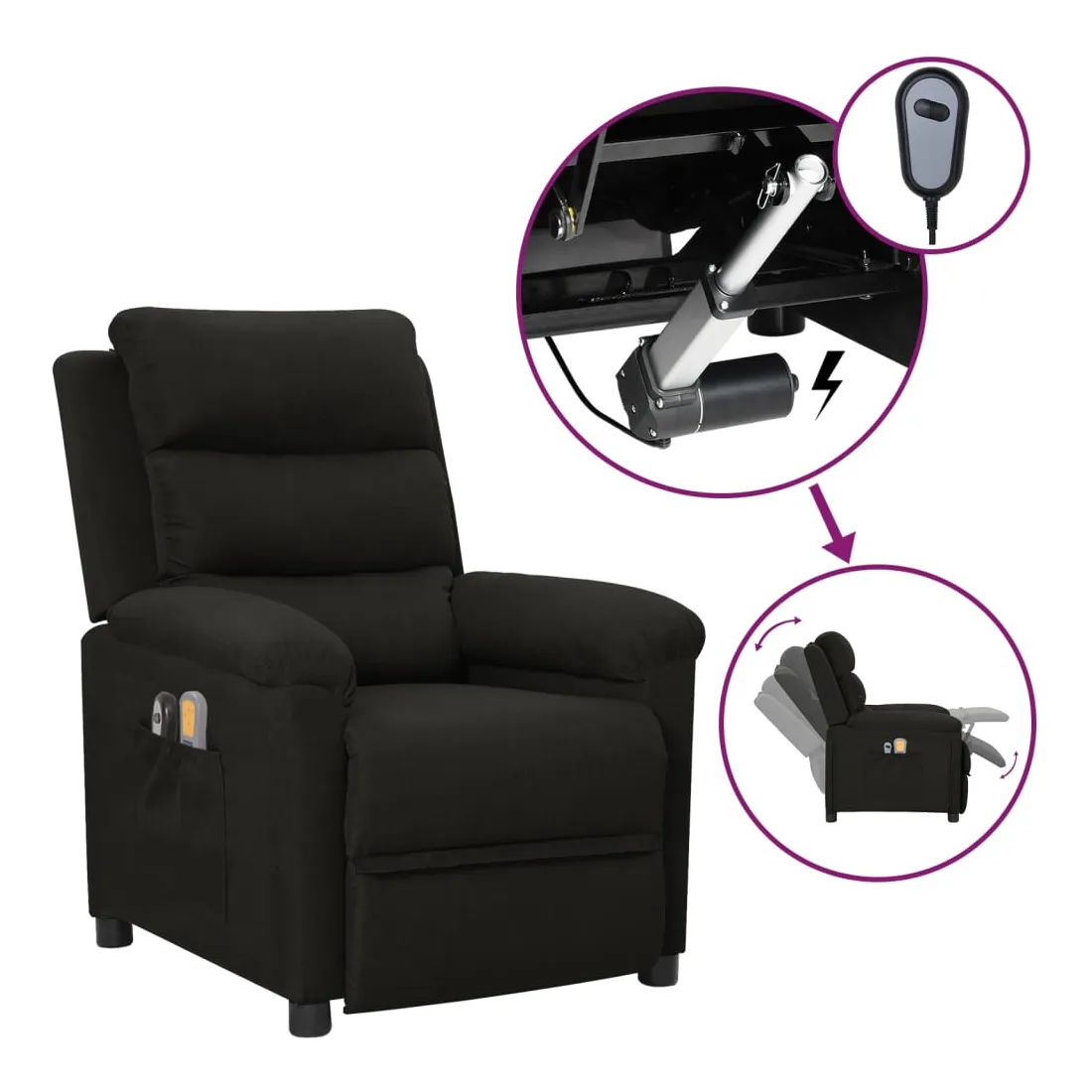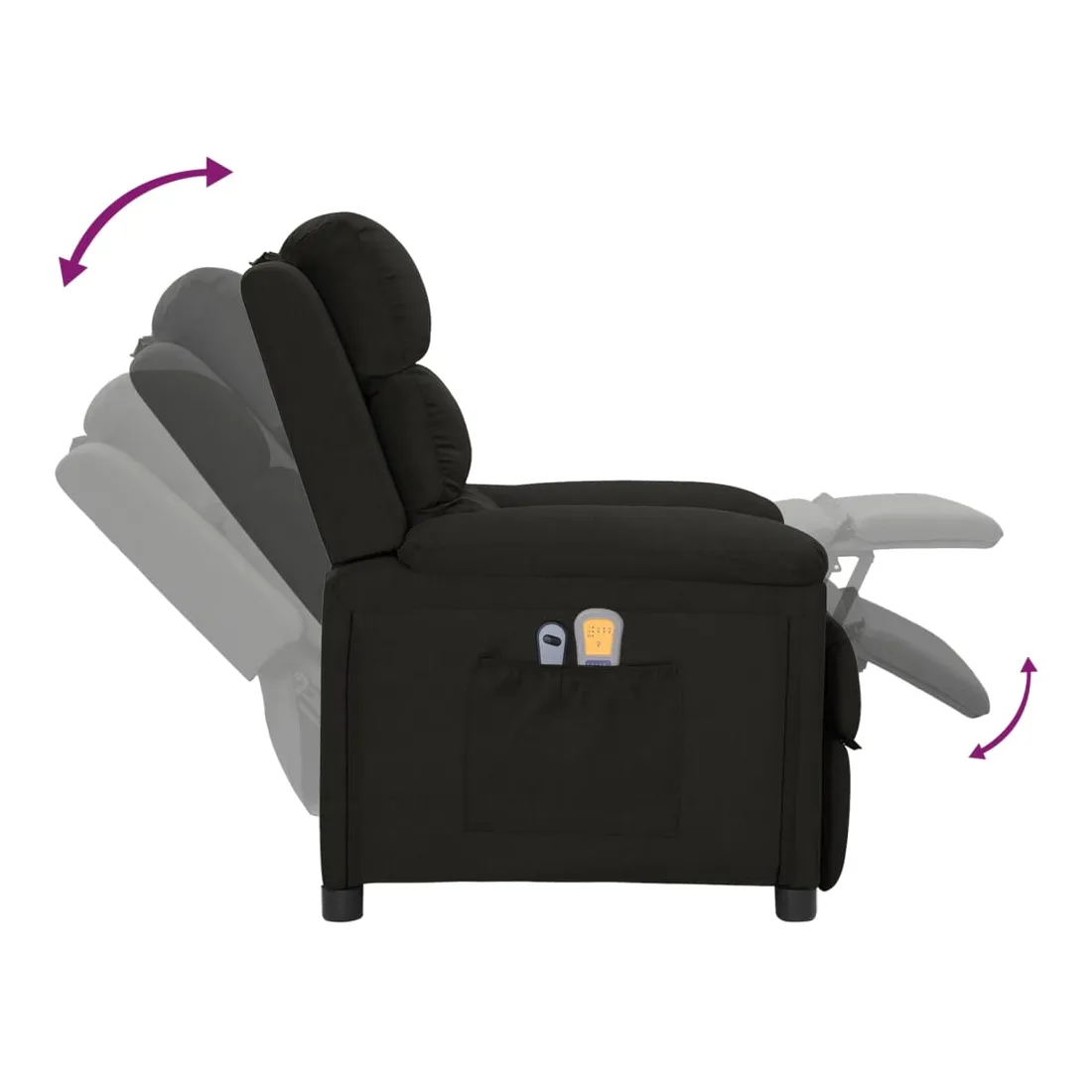 Asseyez-vous et détendez-vous dans ce fauteuil de massage électrique très confortable ! Fonction d'inclinaison électrique : le fauteuil inclinable est équipé d'un moteur électrique pour la fonction d'inclinaison. Il offre 3 positions d'inclinaison et vous pouvez facilement régler le dossier et le repose-pied à l'aide de la commande manuelle à 2 boutons incluse, en fonction de votre confort. Fonction de vibration : les 6 points de massage vous permettent de faire l'expérience d'un massage mieux ciblé. De plus, la télécommande incluse vous permet de choisir différents programmes de massage. La fonction de massage est alimentée par le connecteur USB, mais la source d'alimentation USB 5V certifiée n'est pas incluse. Expérience d'assise confortable : le siège, le dossier et les larges accou