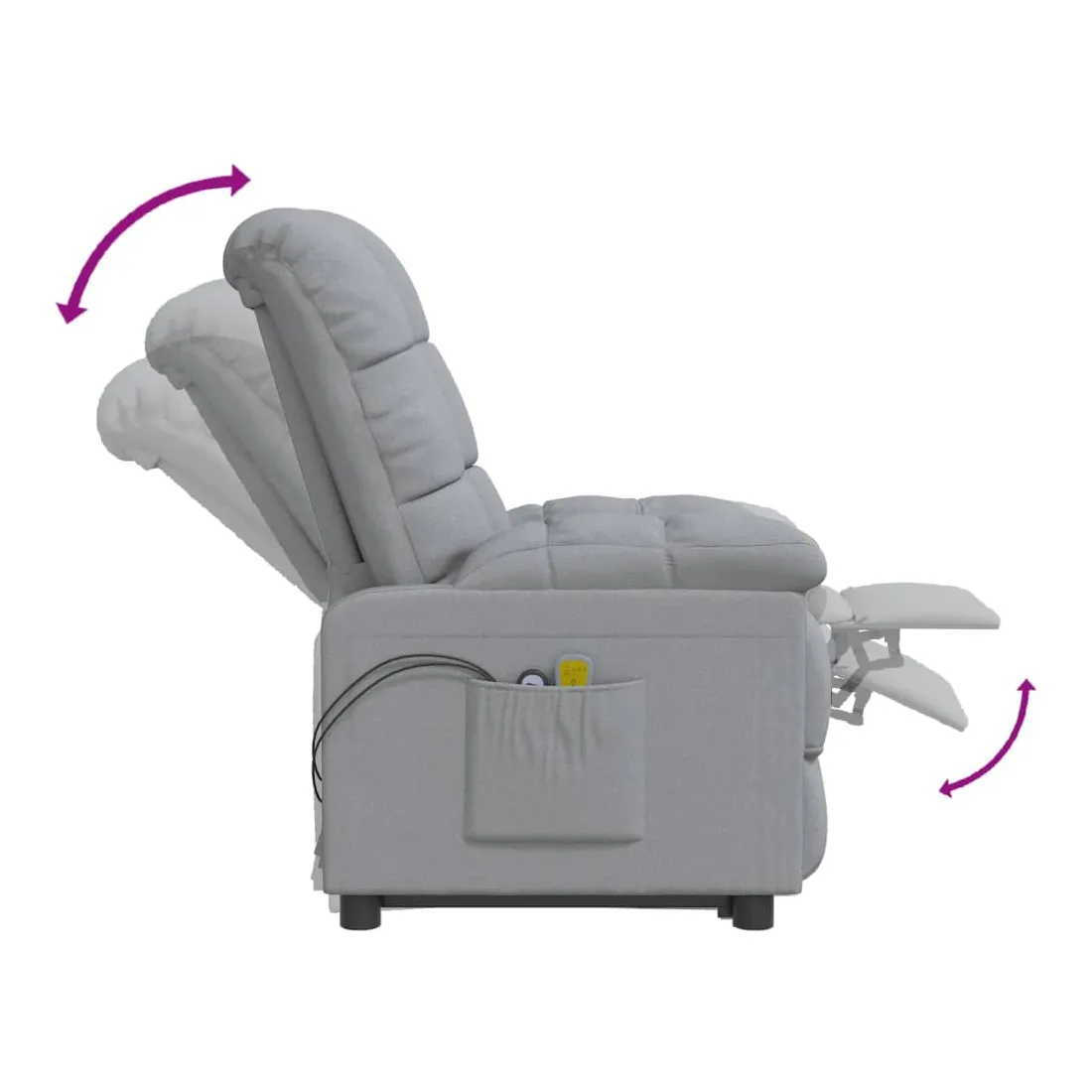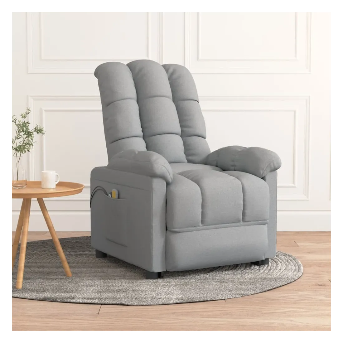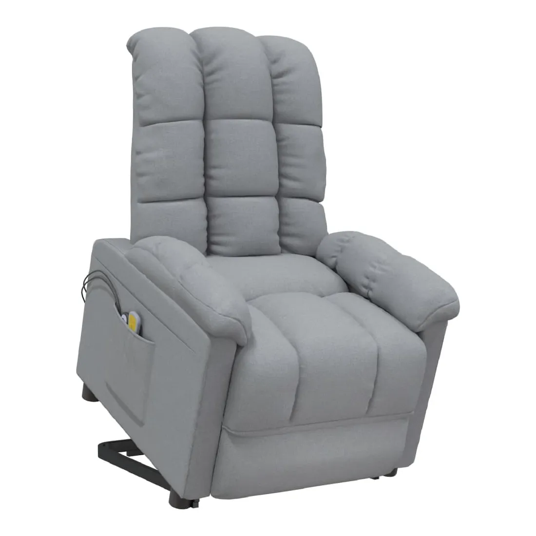 Asseyez-vous et détendez-vous dans ce fauteuil de massage très confortable ! Fonction d'inclinaison manuelle : le fauteuil inclinable est spécialement conçu avec 3 positions d'inclinaison afin que vous puissiez régler manuellement le dossier et le repose-pieds selon votre confort.Fonction de levage électrique : ce fauteuil inclinable pour personnes âgées est équipé d'un moteur électrique pour la fonction de levage. Grâce à la fonction qui pousse toute la chaise vers le haut, vous pouvez facilement vous tenir debout sans stresser votre dos et vos genoux grâce à la commande manuelle à 2 boutons.Fonction de vibration : les 6 points de massage vous permettent de faire l'expérience d'un massage mieux ciblé. De plus, la télécommande incluse vous permet de choisir différents programmes de massage. La fonction de massage est alimentée par le connecteur USB, mais la source d'alimentation USB 5V certifiée n'est pas incluse.Expérience d'assise confortable : le siège, le dossier et les larges accoudoirs rembourrés épais recouverts de tissu procurent une sensation confortable et chaleureuse, vous permettant de vous sentir enveloppé lorsque vous êtes assis. Le tissu présente un aspect simple et épuré, et est respirant et durable.Cadre solide et stable : le cadre en bois et en métal offre une structure solide et une grande stabilité. Ce fauteuil inclinable est confortable et durable.