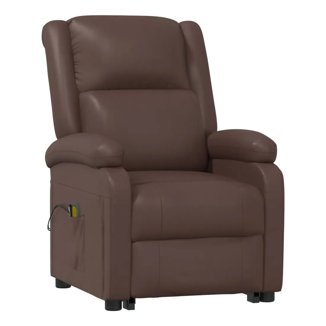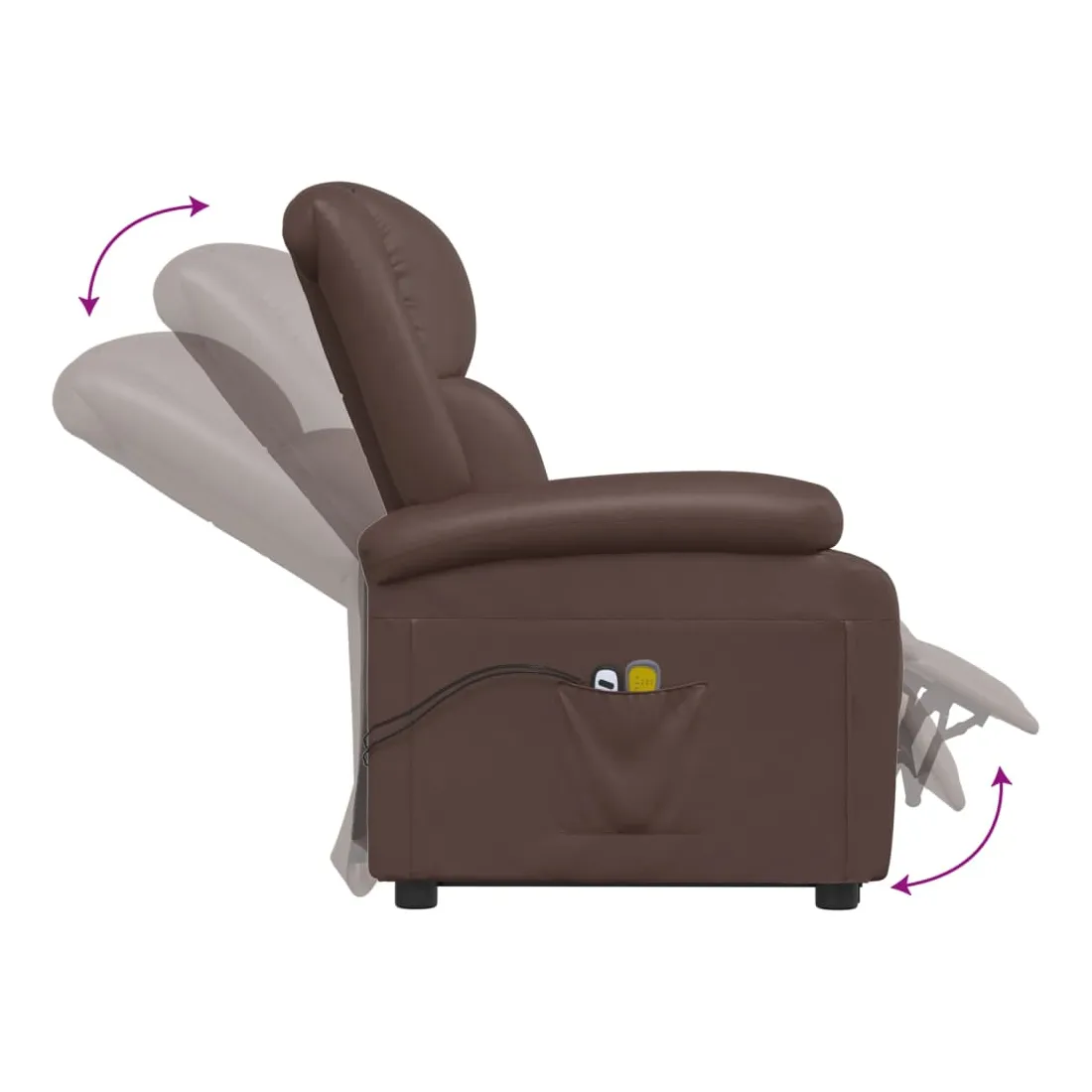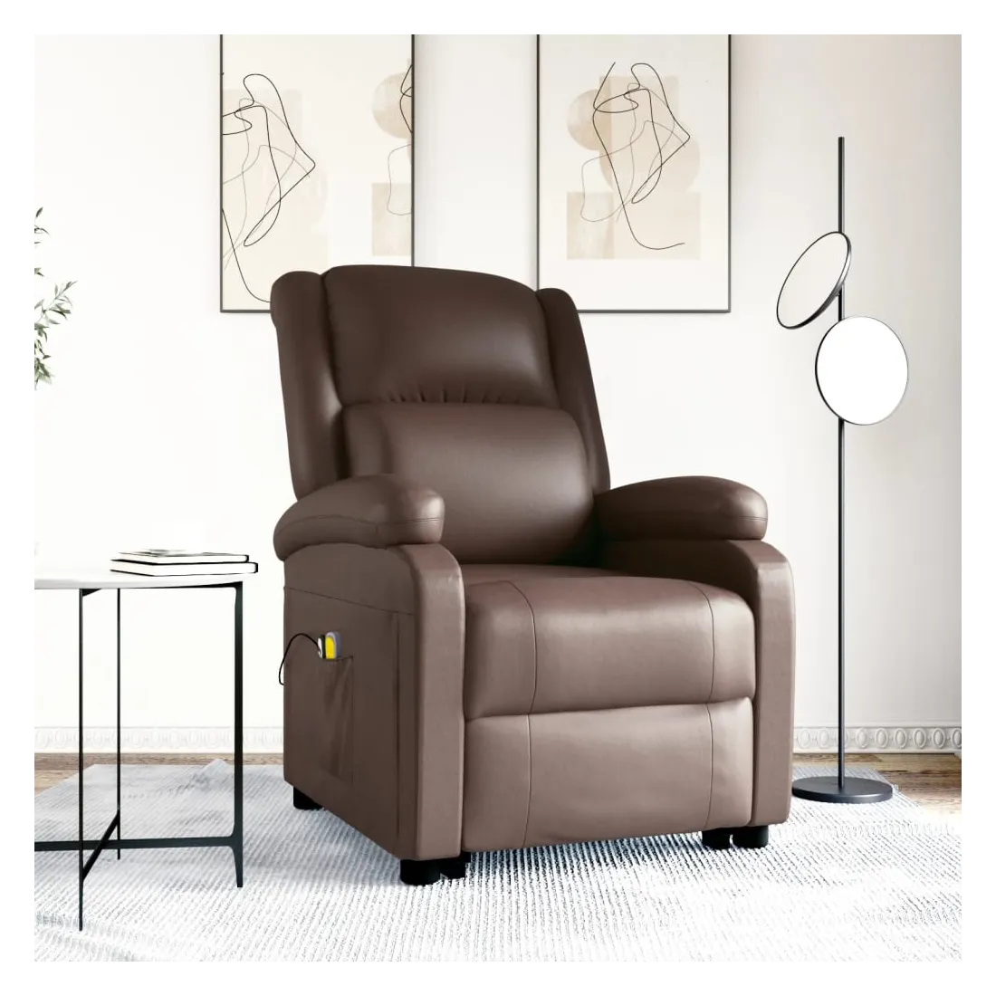 Asseyez-vous et détendez-vous dans ce fauteuil de massage très confortable ! Fonction d'inclinaison manuelle : le fauteuil inclinable est spécialement conçu avec 3 positions d'inclinaison afin que vous puissiez régler manuellement le dossier et le repose-pieds selon votre confort.Fonction de levage électrique : ce fauteuil inclinable pour personnes âgées est équipé d'un moteur électrique pour la fonction de levage. Grâce à la fonction qui pousse toute la chaise vers le haut, vous pouvez facilement vous tenir debout sans stresser votre dos et vos genoux grâce à la commande manuelle à 2 boutons.Fonction de vibration : les 6 points de massage vous permettent de faire l'expérience d'un massage mieux ciblé. De plus, la télécommande incluse vous permet de choisir différents programmes de massage. La fonction de massage est alimentée par le connecteur USB, mais la source d'alimentation USB 5V certifiée n'est pas incluse.Expérience de siège confortable : le siège, le dossier et les larges accoudoirs rembourrés épais recouverts de similicuir procurent une sensation confortable et chaleureuse, vous faisant vous sentir enlacé lorsque vous êtes assis. Le simili cuir est un matériau très résistant. Il est résistant aux taches, ce qui le rend facile à nettoyer avec un chiffon humide. La surface lisse donne également un aspect luxueux et la beauté du cuir véritable.Cadre solide et stable : le cadre en bois et en métal offre une structure solide et une grande stabilité. Ce fauteuil inclinable est confortable et durable.