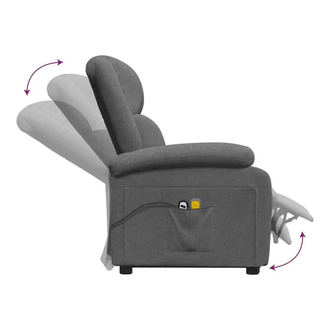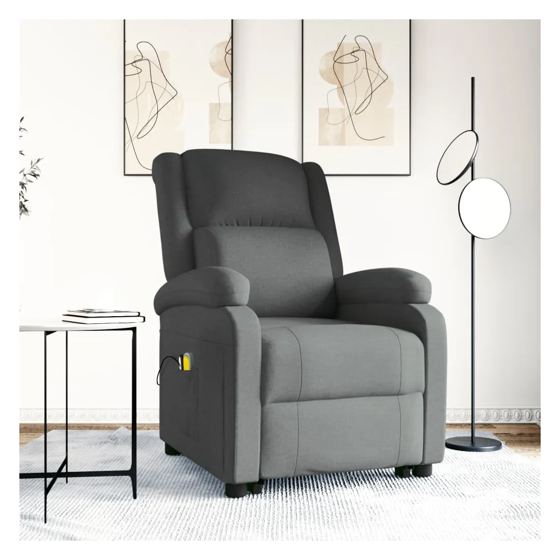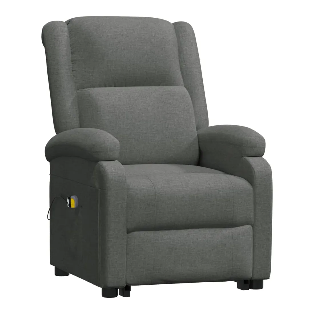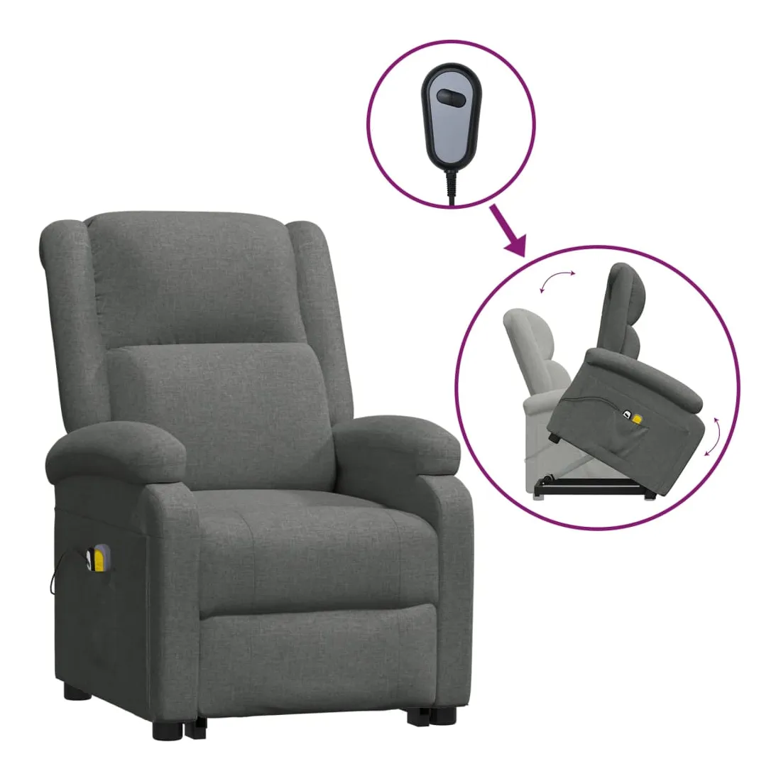 Asseyez-vous et détendez-vous dans ce fauteuil de massage très confortable ! Fonction d'inclinaison manuelle : le fauteuil inclinable est spécialement conçu avec 3 positions d'inclinaison afin que vous puissiez régler manuellement le dossier et le repose-pieds selon votre confort.Fonction de levage électrique : ce fauteuil inclinable pour personnes âgées est équipé d'un moteur électrique pour la fonction de levage. Grâce à la fonction qui pousse toute la chaise vers le haut, vous pouvez facilement vous tenir debout sans stresser votre dos et vos genoux grâce à la commande manuelle à 2 boutons.Fonction de vibration : les 6 points de massage vous permettent de faire l'expérience d'un massage mieux ciblé. De plus, la télécommande incluse vous permet de choisir différents programmes de massage. La fonction de massage est alimentée par le connecteur USB, mais la source d'alimentation USB 5V certifiée n'est pas incluse.Expérience d'assise confortable : le siège, le dossier et les larges accoudoirs rembourrés épais recouverts de tissu procurent une sensation confortable et chaleureuse, vous permettant de vous sentir enveloppé lorsque vous êtes assis. Le tissu présente un aspect simple et épuré, et est respirant et durable.Cadre solide et stable : le cadre en bois et en métal offre une structure solide et une grande stabilité. Ce fauteuil inclinable est confortable et durable.