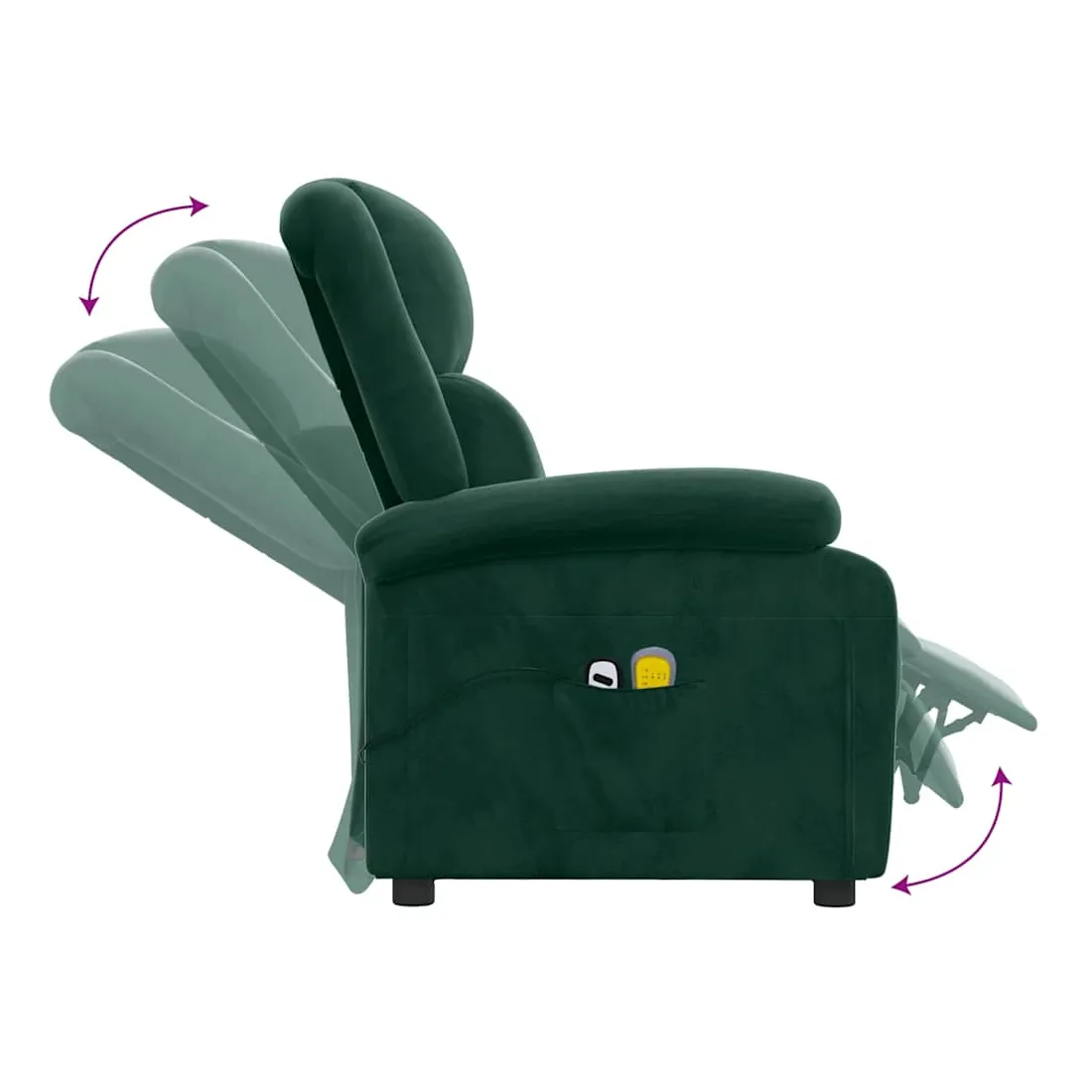 Asseyez-vous et détendez-vous dans ce fauteuil de massage électrique très confortable ! Fonction d'inclinaison électrique : le fauteuil inclinable est équipé d'un moteur électrique pour la fonction d'inclinaison. Il offre 3 positions d'inclinaison et vous pouvez facilement régler le dossier et le repose-pied à l'aide de la commande manuelle à 2 boutons incluse, en fonction de votre confort.Fonction de vibration : les 6 points de massage vous permettent de faire l'expérience d'un massage mieux ciblé. De plus, la télécommande incluse vous permet de choisir différents programmes de massage. La fonction de massage est alimentée par le connecteur USB, mais la source d'alimentation USB 5V certifiée n'est pas incluse.Expérience d'assise confortable : le siège, le dossier et les larges accoudoirs rembourrés épais recouverts de velours procurent une sensation confortable et chaleureuse, vous faisant vous sentir enlacé lorsque vous êtes assis. Le velours est un tissu doux et confortable qui est agréable sur la peau.Cadre solide et stable : le cadre en bois et en métal offre une structure solide et une grande stabilité. Ce fauteuil inclinable est confortable et durable.