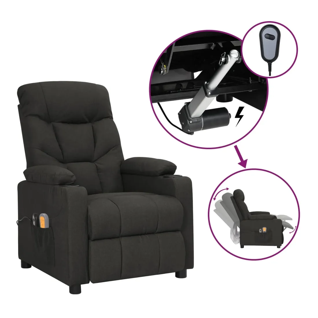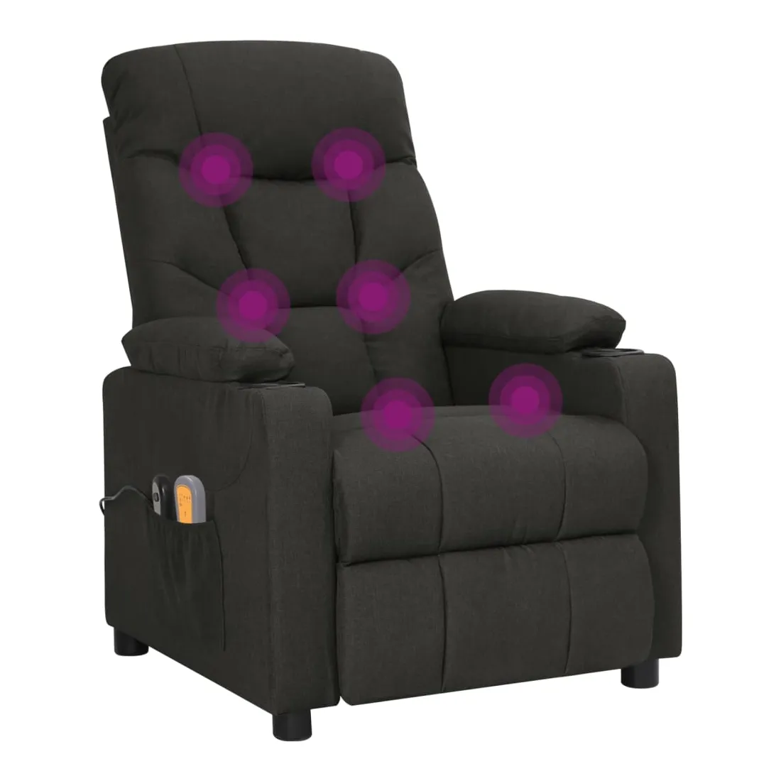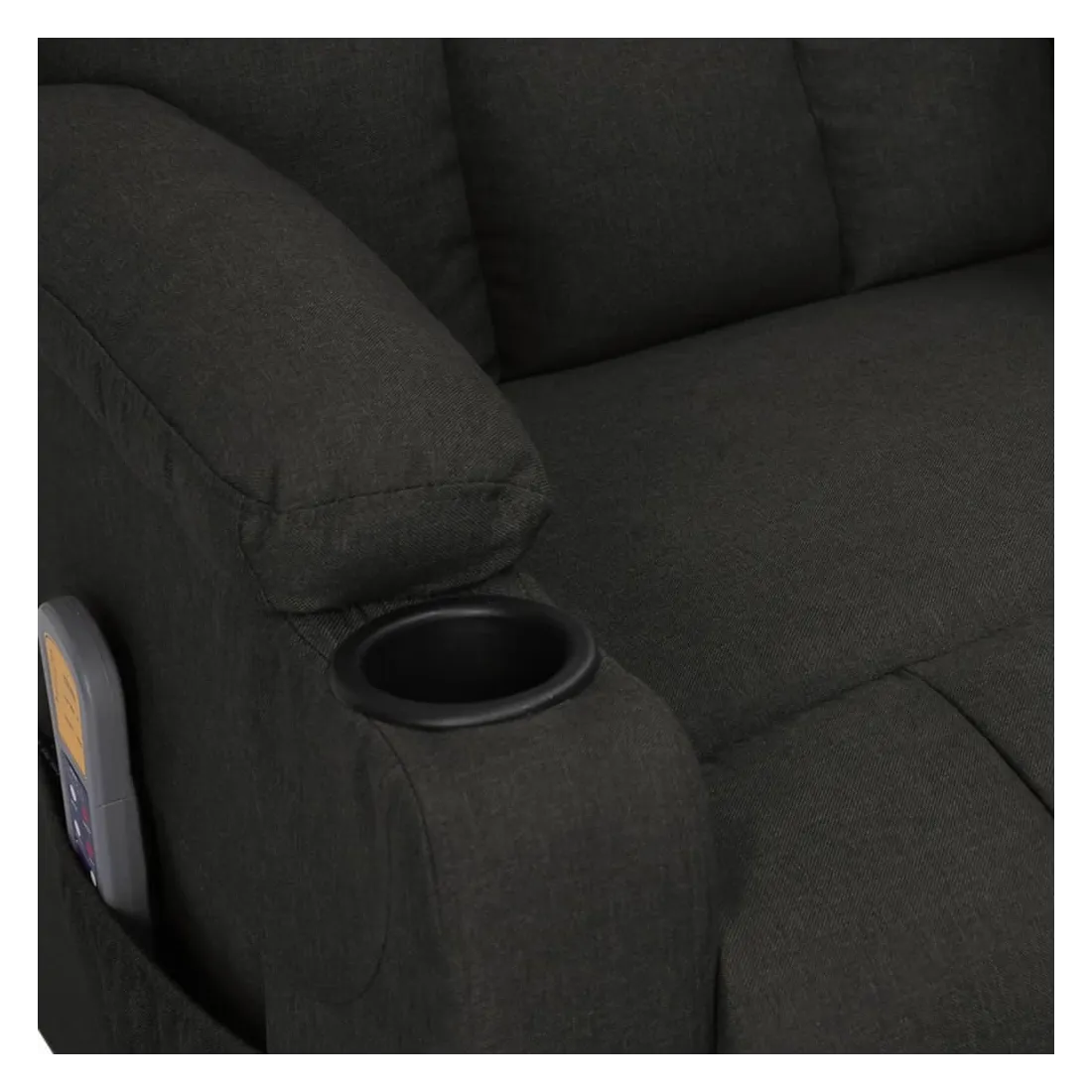 Asseyez-vous et détendez-vous dans ce fauteuil de massage électrique très confortable ! Fonction d'inclinaison électrique : le fauteuil inclinable est équipé d'un moteur électrique pour la fonction d'inclinaison. Il offre 3 positions d'inclinaison et vous pouvez facilement régler le dossier et le repose-pied à l'aide de la commande manuelle à 2 boutons incluse, en fonction de votre confort.Fonction de vibration : les 6 points de massage vous permettent de faire l'expérience d'un massage mieux ciblé. De plus, la télécommande incluse vous permet de choisir différents programmes de massage. La fonction de massage est alimentée par le connecteur USB, mais la source d'alimentation USB 5V certifiée n'est pas incluse.Expérience d'assise confortable : le siège, le dossier et les larges accoudoirs rembourrés épais recouverts de tissu procurent une sensation confortable et chaleureuse, vous permettant de vous sentir enveloppé lorsque vous êtes assis. Le tissu présente un aspect simple et épuré, et est respirant et durable.Cadre solide et stable : le cadre en bois et en métal offre une structure solide et une grande stabilité. Ce fauteuil inclinable est confortable et durable.