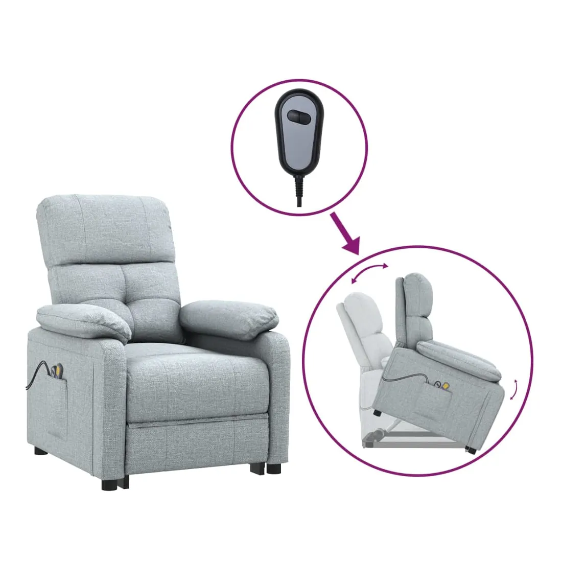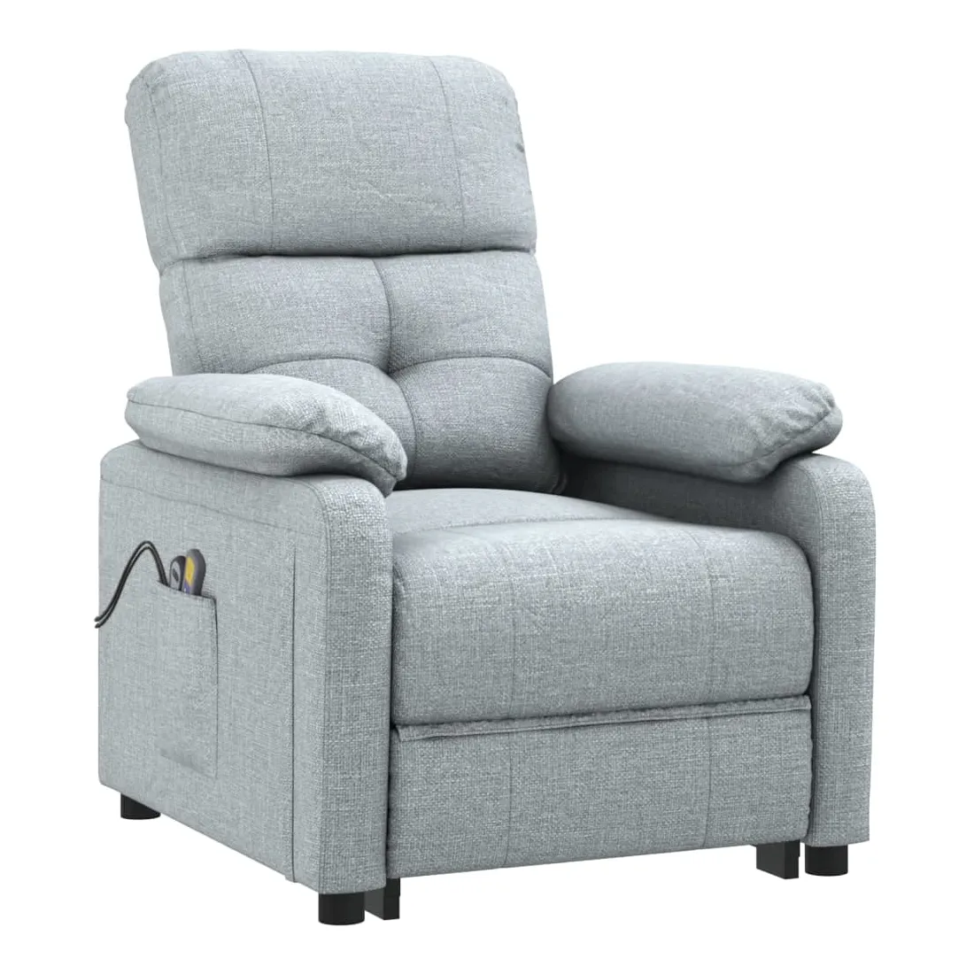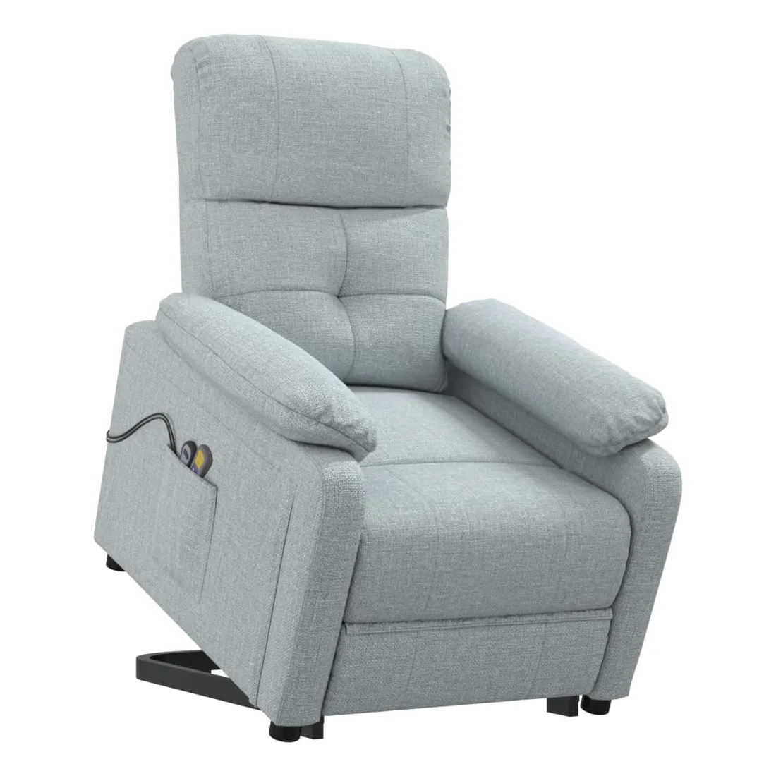 Asseyez-vous et détendez-vous dans ce fauteuil de massage très confortable ! Fonction d'inclinaison manuelle : le fauteuil inclinable est spécialement conçu avec 3 positions d'inclinaison afin que vous puissiez régler manuellement le dossier et le repose-pieds selon votre confort.Fonction de levage électrique : ce fauteuil inclinable pour personnes âgées est équipé d'un moteur électrique pour la fonction de levage. Grâce à la fonction qui pousse toute la chaise vers le haut, vous pouvez facilement vous tenir debout sans stresser votre dos et vos genoux grâce à la commande manuelle à 2 boutons.Fonction de vibration : les 6 points de massage vous permettent de faire l'expérience d'un massage mieux ciblé. De plus, la télécommande incluse vous permet de choisir différents programmes de massage. La fonction de massage est alimentée par le connecteur USB, mais la source d'alimentation USB 5V certifiée n'est pas incluse.Expérience d'assise confortable : le siège, le dossier et les larges accoudoirs rembourrés épais recouverts de tissu procurent une sensation confortable et chaleureuse, vous permettant de vous sentir enveloppé lorsque vous êtes assis. Le tissu présente un aspect simple et épuré, et est respirant et durable.Cadre solide et stable : le cadre en bois et en métal offre une structure solide et une grande stabilité. Ce fauteuil inclinable est confortable et durable.