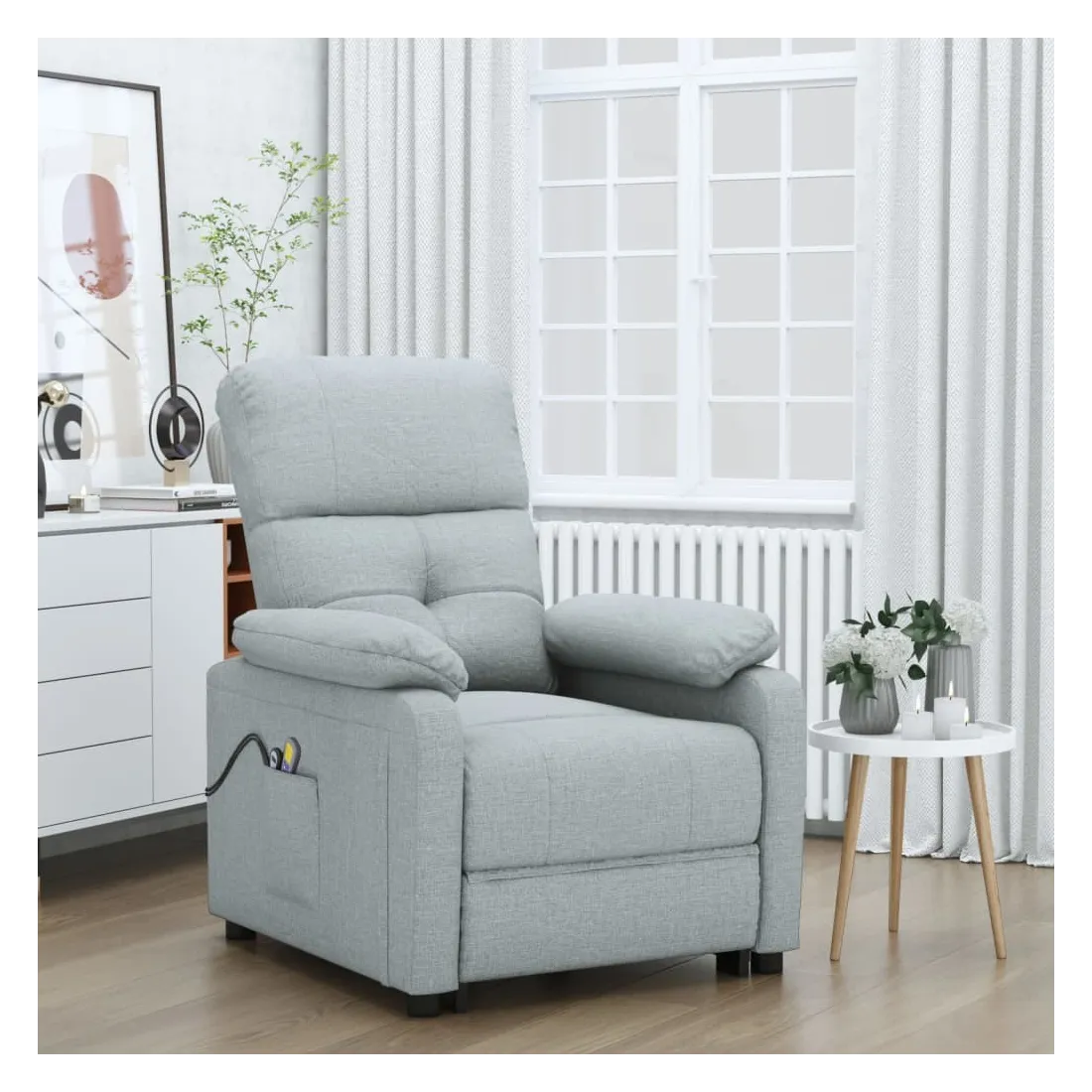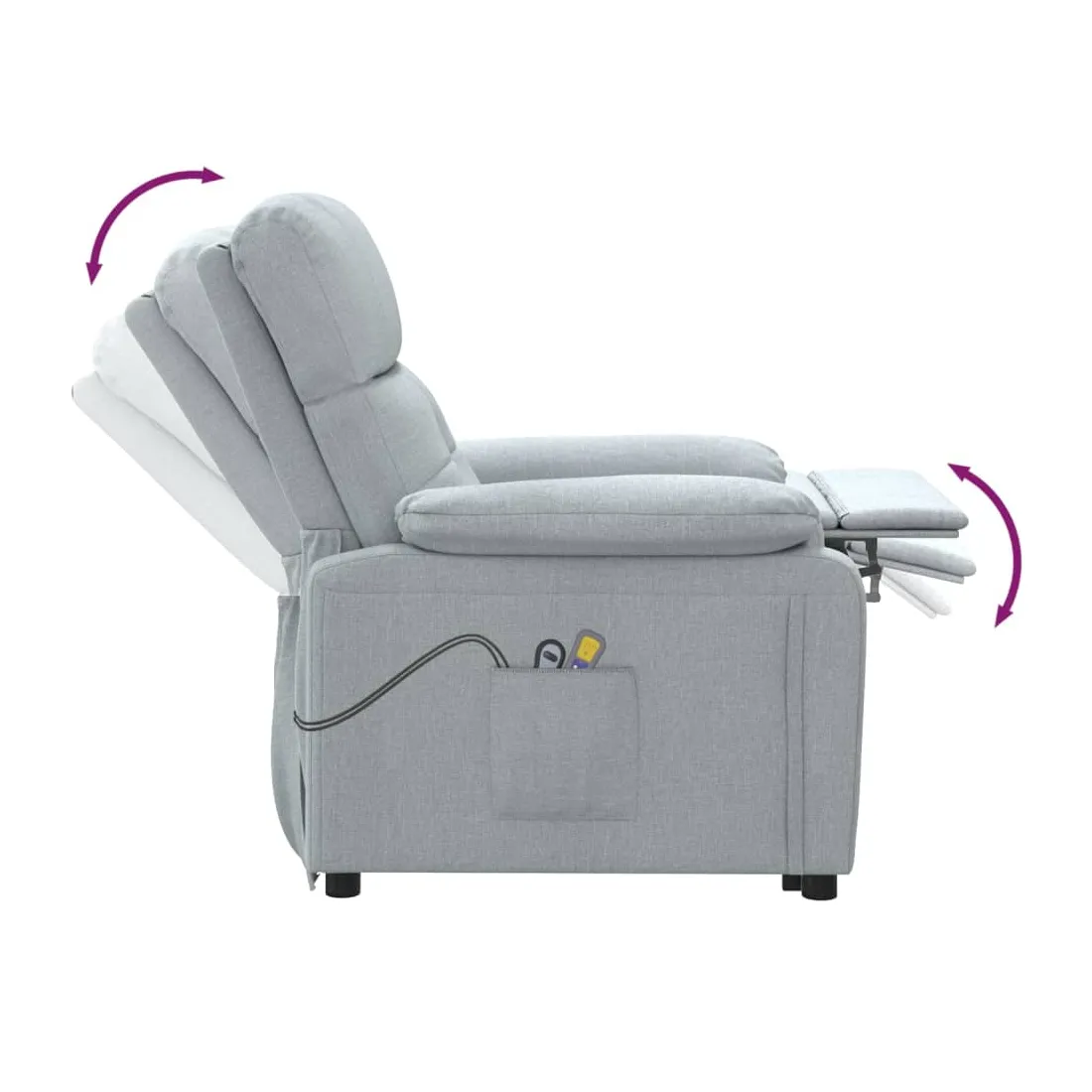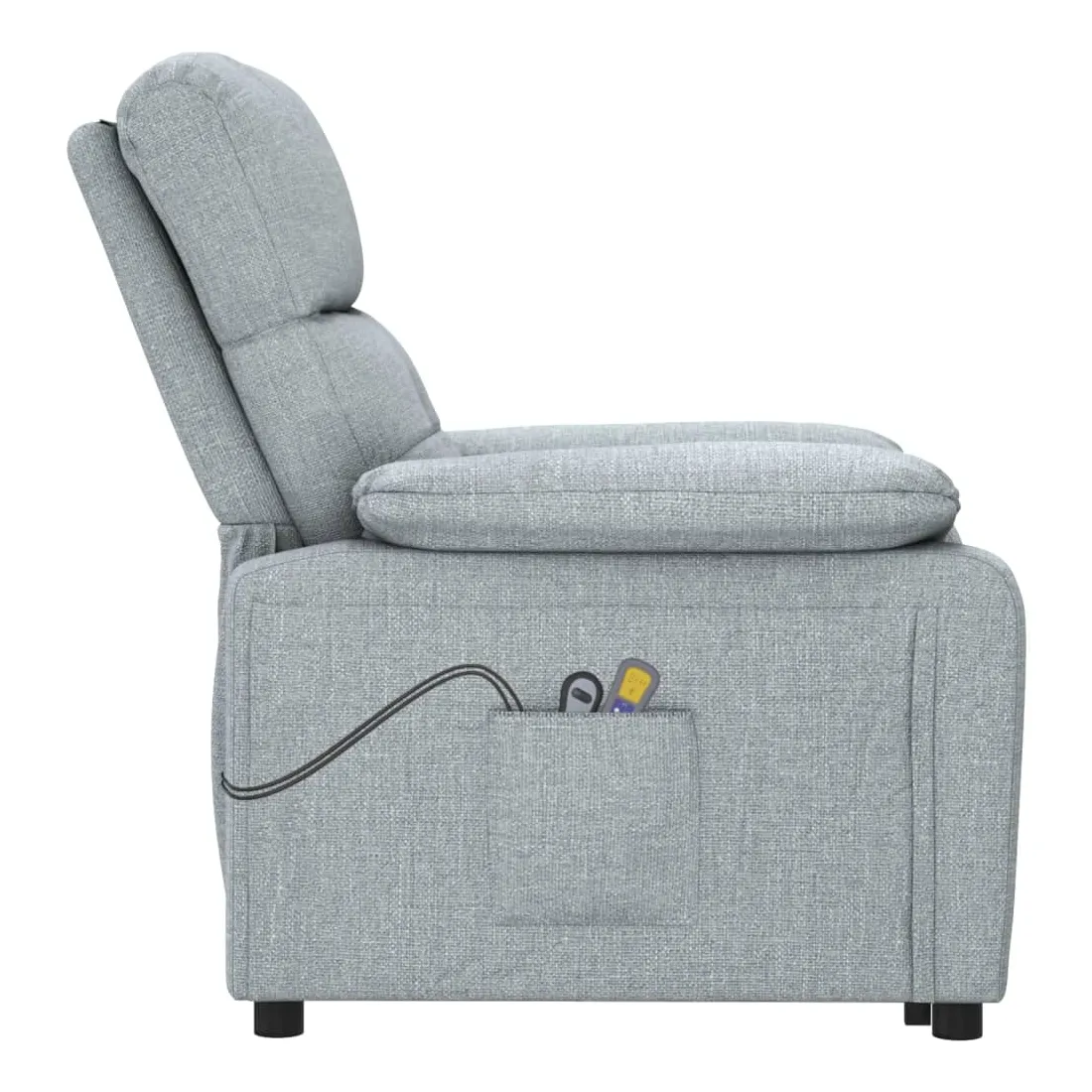 Asseyez-vous et détendez-vous dans ce fauteuil de massage très confortable ! Fonction d'inclinaison manuelle : le fauteuil inclinable est spécialement conçu avec 3 positions d'inclinaison afin que vous puissiez régler manuellement le dossier et le repose-pieds selon votre confort.Fonction de levage électrique : ce fauteuil inclinable pour personnes âgées est équipé d'un moteur électrique pour la fonction de levage. Grâce à la fonction qui pousse toute la chaise vers le haut, vous pouvez facilement vous tenir debout sans stresser votre dos et vos genoux grâce à la commande manuelle à 2 boutons.Fonction de vibration : les 6 points de massage vous permettent de faire l'expérience d'un massage mieux ciblé. De plus, la télécommande incluse vous permet de choisir différents programmes de massage. La fonction de massage est alimentée par le connecteur USB, mais la source d'alimentation USB 5V certifiée n'est pas incluse.Expérience d'assise confortable : le siège, le dossier et les larges accoudoirs rembourrés épais recouverts de tissu procurent une sensation confortable et chaleureuse, vous permettant de vous sentir enveloppé lorsque vous êtes assis. Le tissu présente un aspect simple et épuré, et est respirant et durable.Cadre solide et stable : le cadre en bois et en métal offre une structure solide et une grande stabilité. Ce fauteuil inclinable est confortable et durable.