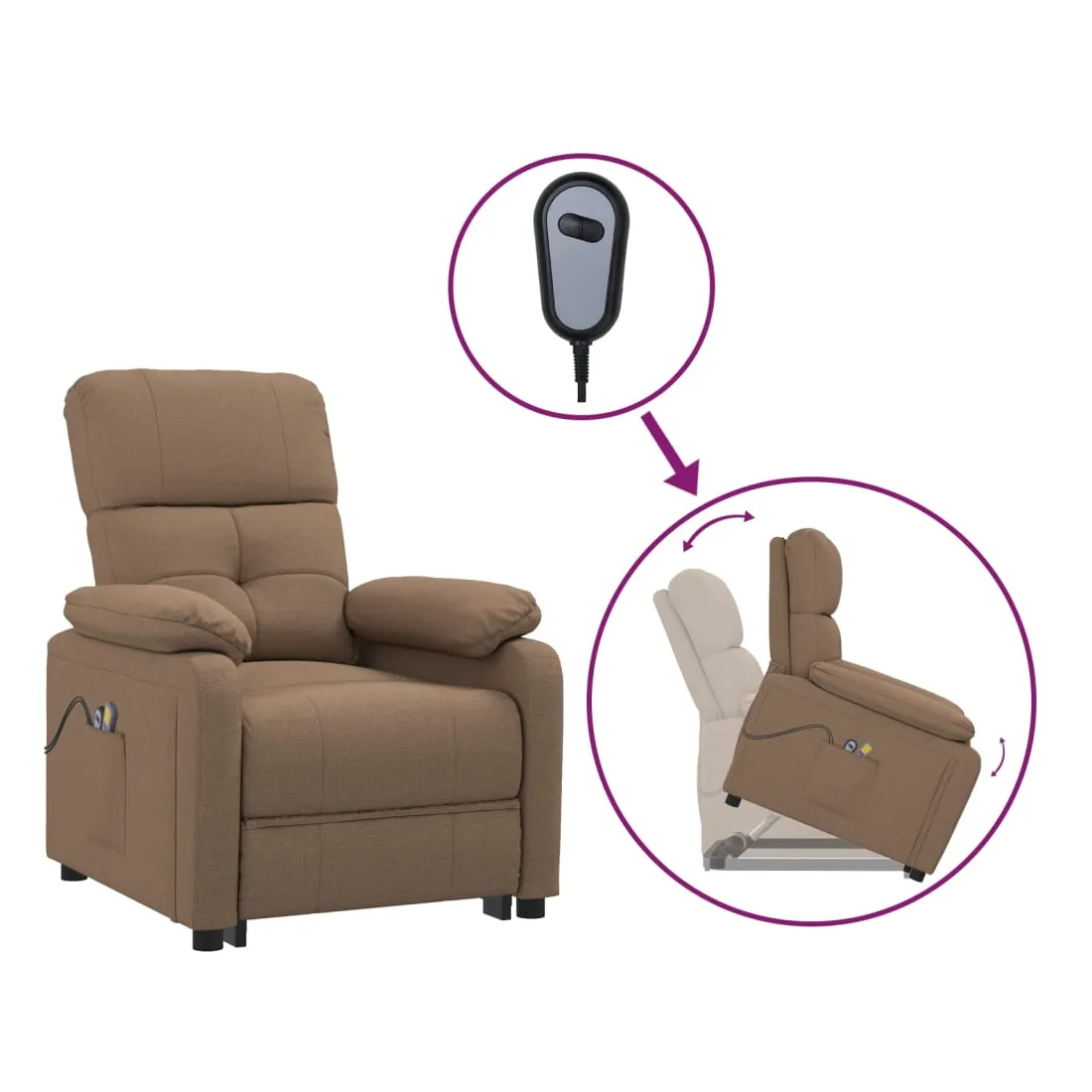 Asseyez-vous et détendez-vous dans ce fauteuil de massage très confortable ! Fonction d'inclinaison manuelle : le fauteuil inclinable est spécialement conçu avec 3 positions d'inclinaison afin que vous puissiez régler manuellement le dossier et le repose-pieds selon votre confort.Fonction de levage électrique : ce fauteuil inclinable pour personnes âgées est équipé d'un moteur électrique pour la fonction de levage. Grâce à la fonction qui pousse toute la chaise vers le haut, vous pouvez facilement vous tenir debout sans stresser votre dos et vos genoux grâce à la commande manuelle à 2 boutons.Fonction de vibration : les 6 points de massage vous permettent de faire l'expérience d'un massage mieux ciblé. De plus, la télécommande incluse vous permet de choisir différents programmes de massage. La fonction de massage est alimentée par le connecteur USB, mais la source d'alimentation USB 5V certifiée n'est pas incluse.Expérience d'assise confortable : le siège, le dossier et les larges accoudoirs rembourrés épais recouverts de tissu procurent une sensation confortable et chaleureuse, vous permettant de vous sentir enveloppé lorsque vous êtes assis. Le tissu présente un aspect simple et épuré, et est respirant et durable.Cadre solide et stable : le cadre en bois et en métal offre une structure solide et une grande stabilité. Ce fauteuil inclinable est confortable et durable.