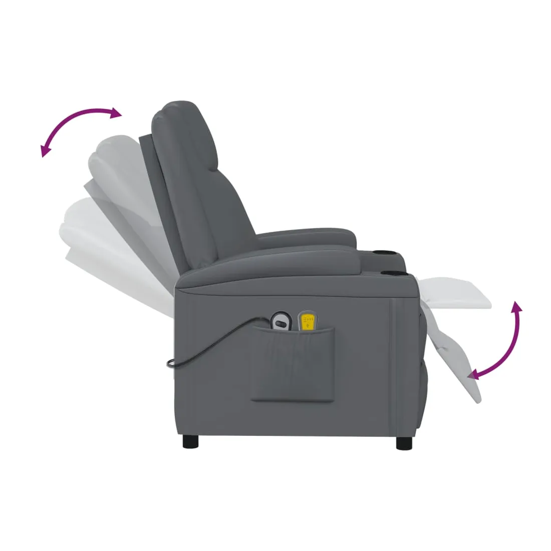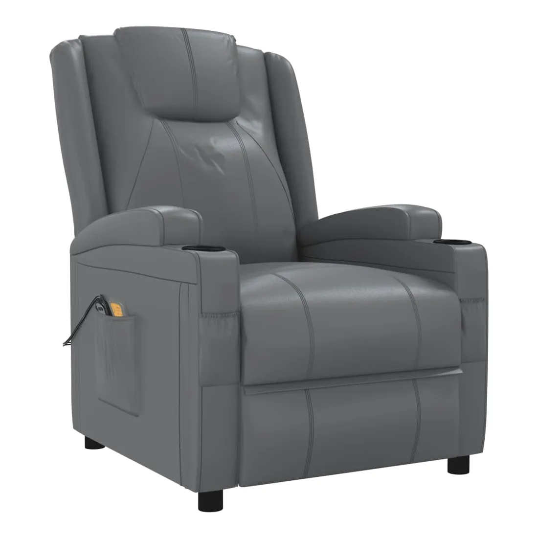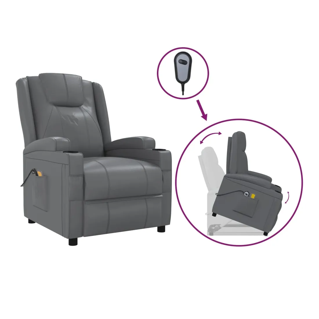 Asseyez-vous et détendez-vous dans ce fauteuil de massage très confortable ! Fonction d'inclinaison manuelle : le fauteuil inclinable est spécialement conçu avec 3 positions d'inclinaison afin que vous puissiez régler manuellement le dossier et le repose-pieds selon votre confort.Fonction de levage électrique : ce fauteuil inclinable pour personnes âgées est équipé d'un moteur électrique pour la fonction de levage. Grâce à la fonction qui pousse toute la chaise vers le haut, vous pouvez facilement vous tenir debout sans stresser votre dos et vos genoux grâce à la commande manuelle à 2 boutons.Fonction de vibration : les 6 points de massage vous permettent de faire l'expérience d'un massage mieux ciblé. De plus, la télécommande incluse vous permet de choisir différents programmes de massage. La fonction de massage est alimentée par le connecteur USB, mais la source d'alimentation USB 5V certifiée n'est pas incluse.Expérience de siège confortable : le siège, le dossier et les larges accoudoirs rembourrés épais recouverts de similicuir procurent une sensation confortable et chaleureuse, vous faisant vous sentir enlacé lorsque vous êtes assis. Le simili cuir est un matériau très résistant. Il est résistant aux taches, ce qui le rend facile à nettoyer avec un chiffon humide. La surface lisse donne également un aspect luxueux et la beauté du cuir véritable.Cadre solide et stable : le cadre en bois et en métal offre une structure solide et une grande stabilité. Ce fauteuil inclinable est confortable et durable.