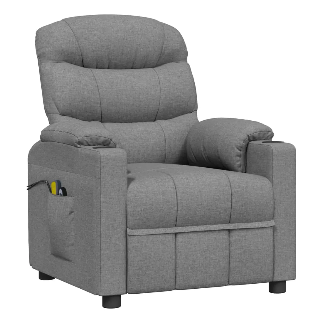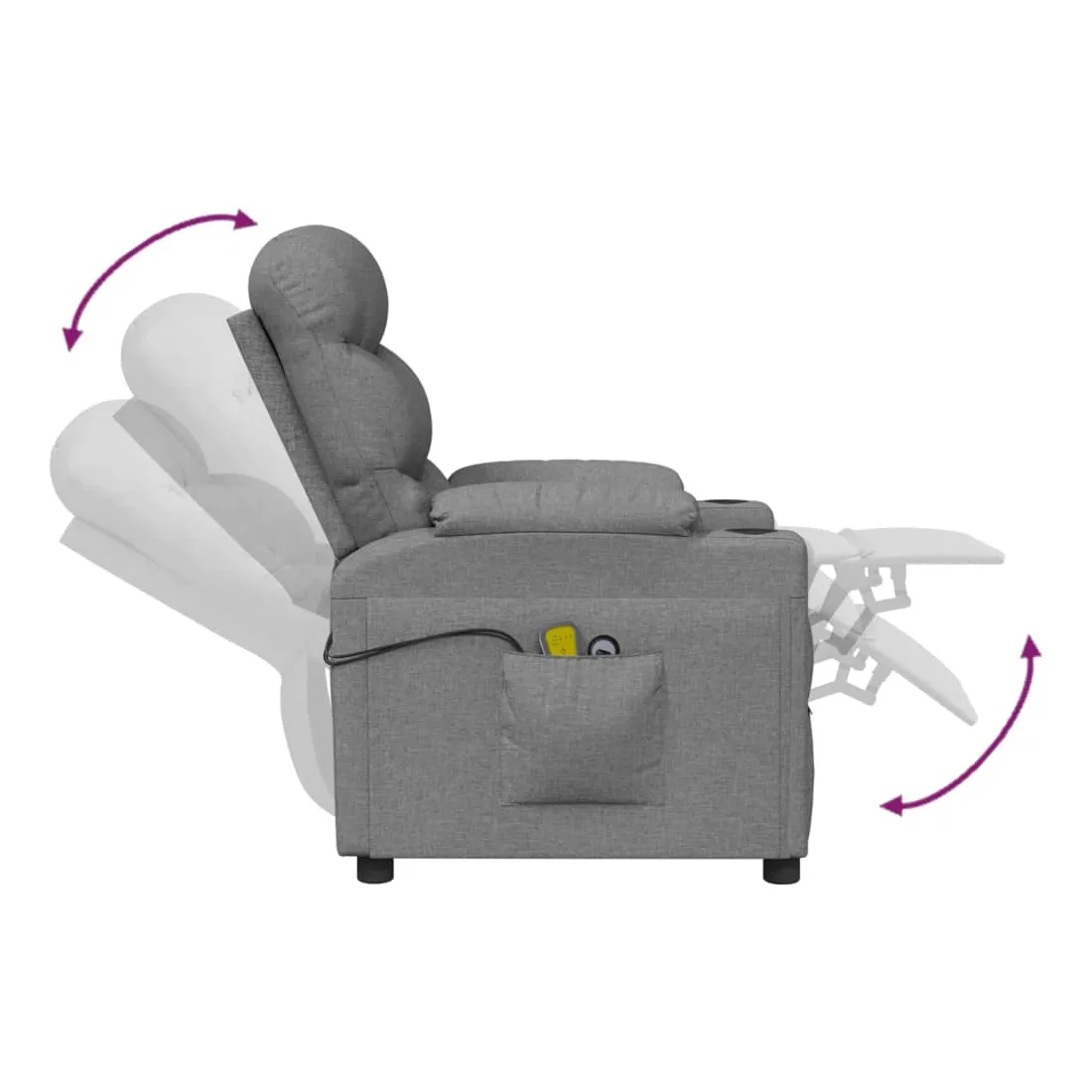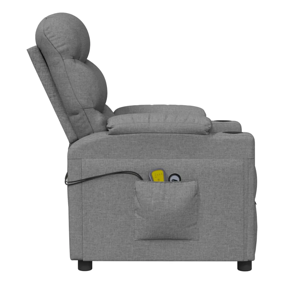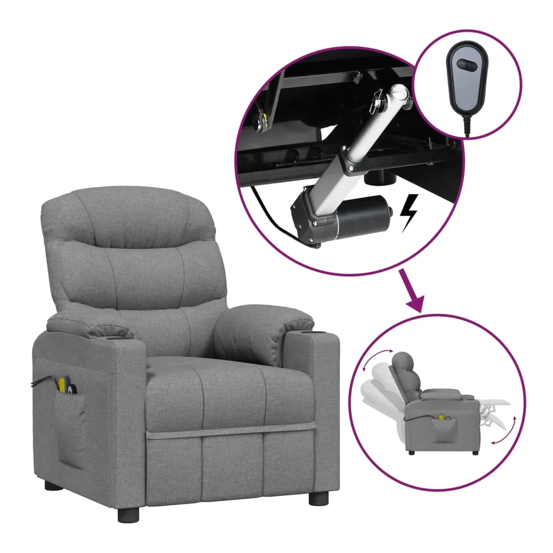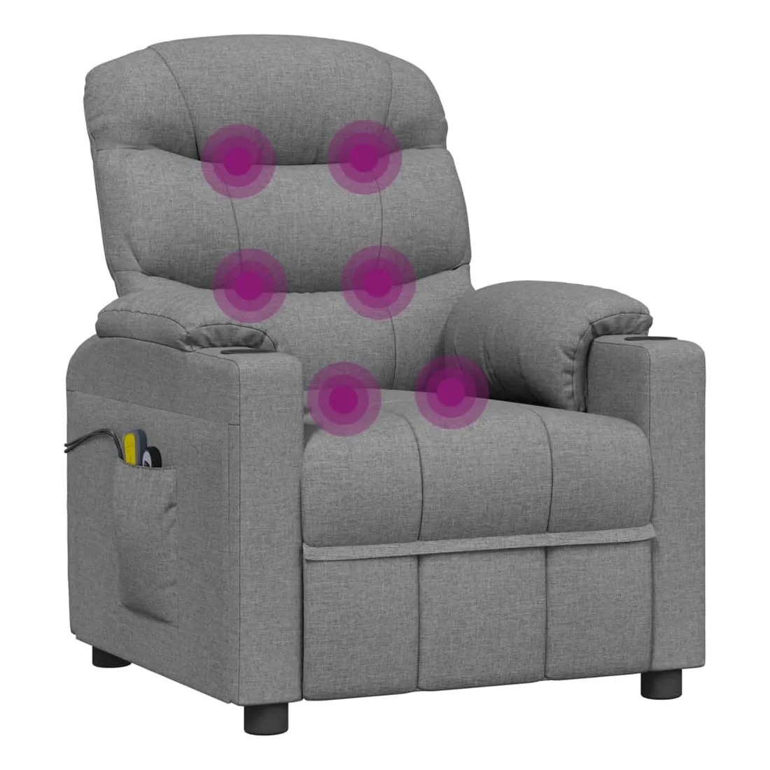 Asseyez-vous et détendez-vous dans ce fauteuil de massage électrique très confortable ! Fonction d'inclinaison électrique : le fauteuil inclinable est équipé d'un moteur électrique pour la fonction d'inclinaison. Il offre 3 positions d'inclinaison et vous pouvez facilement régler le dossier et le repose-pied à l'aide de la commande manuelle à 2 boutons incluse, en fonction de votre confort.Fonction de vibration : les 6 points de massage vous permettent de faire l'expérience d'un massage mieux ciblé. De plus, la télécommande incluse vous permet de choisir différents programmes de massage. La fonction de massage est alimentée par le connecteur USB, mais la source d'alimentation USB 5V certifiée n'est pas incluse.Expérience d'assise confortable : le siège, le dossier et les larges accoudoirs rembourrés épais recouverts de tissu procurent une sensation confortable et chaleureuse, vous permettant de vous sentir enveloppé lorsque vous êtes assis. Le tissu présente un aspect simple et épuré, et est respirant et durable.Cadre solide et stable : le cadre en bois et en métal offre une structure solide et une grande stabilité. Ce fauteuil inclinable est confortable et durable.