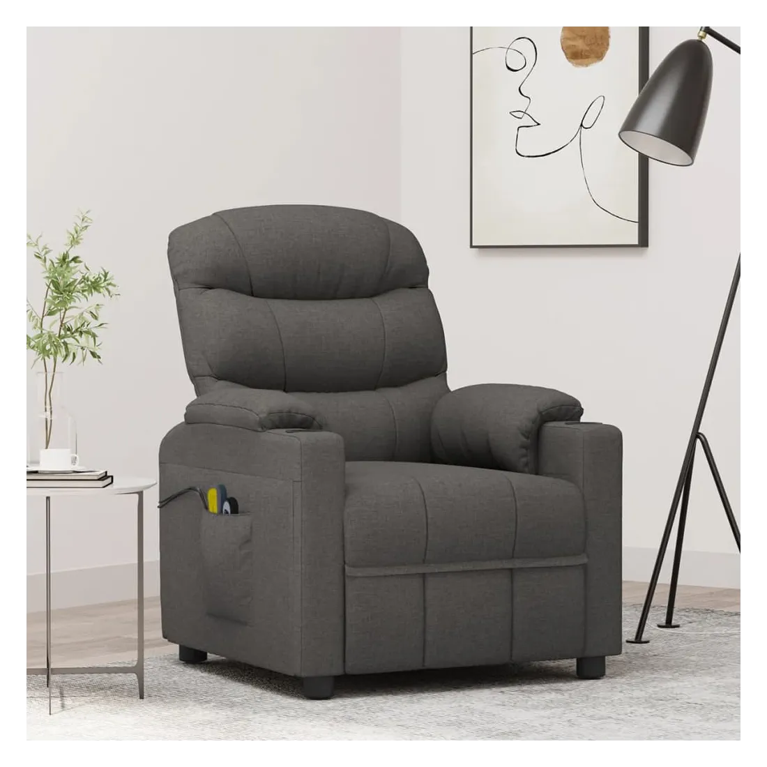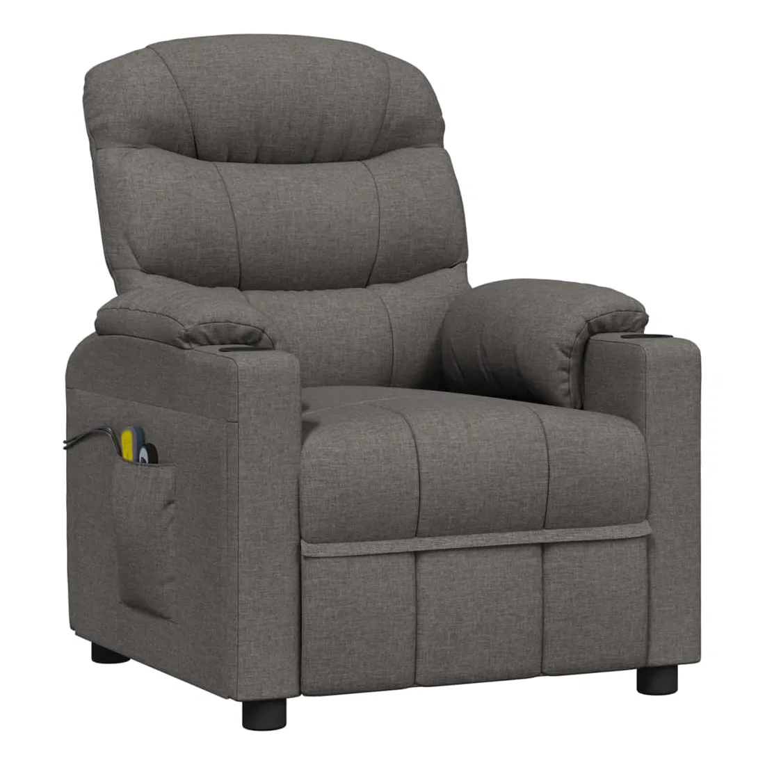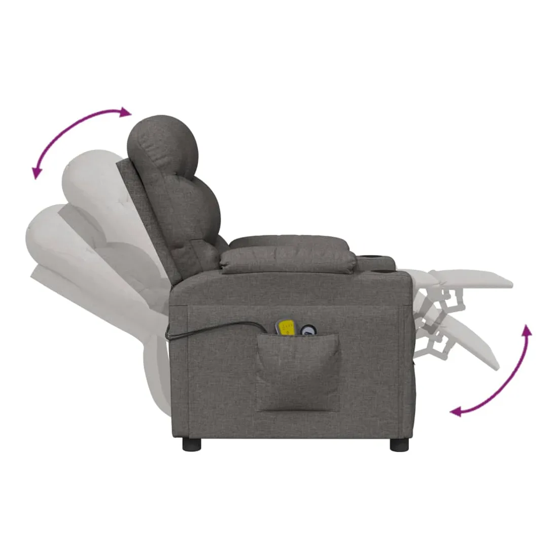 Asseyez-vous et détendez-vous dans ce fauteuil de massage électrique très confortable ! Fonction d'inclinaison électrique : le fauteuil inclinable est équipé d'un moteur électrique pour la fonction d'inclinaison. Il offre 3 positions d'inclinaison et vous pouvez facilement régler le dossier et le repose-pied à l'aide de la commande manuelle à 2 boutons incluse, en fonction de votre confort.Fonction de vibration : les 6 points de massage vous permettent de faire l'expérience d'un massage mieux ciblé. De plus, la télécommande incluse vous permet de choisir différents programmes de massage. La fonction de massage est alimentée par le connecteur USB, mais la source d'alimentation USB 5V certifiée n'est pas incluse.Expérience d'assise confortable : le siège, le dossier et les larges accoudoirs rembourrés épais recouverts de tissu procurent une sensation confortable et chaleureuse, vous permettant de vous sentir enveloppé lorsque vous êtes assis. Le tissu présente un aspect simple et épuré, et est respirant et durable.Cadre solide et stable : le cadre en bois et en métal offre une structure solide et une grande stabilité. Ce fauteuil inclinable est confortable et durable.