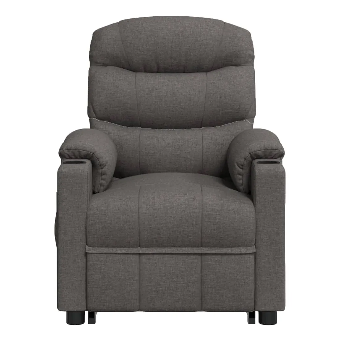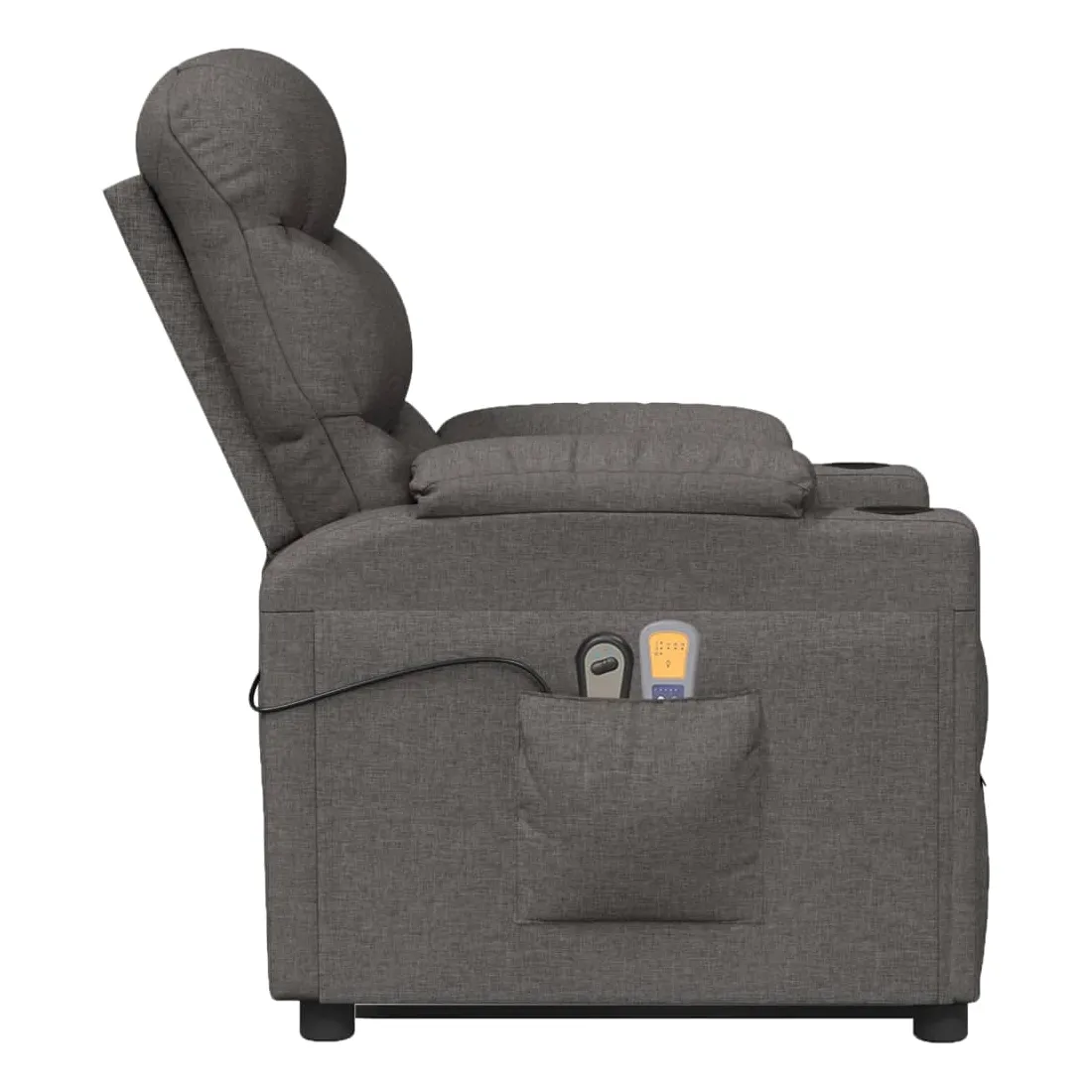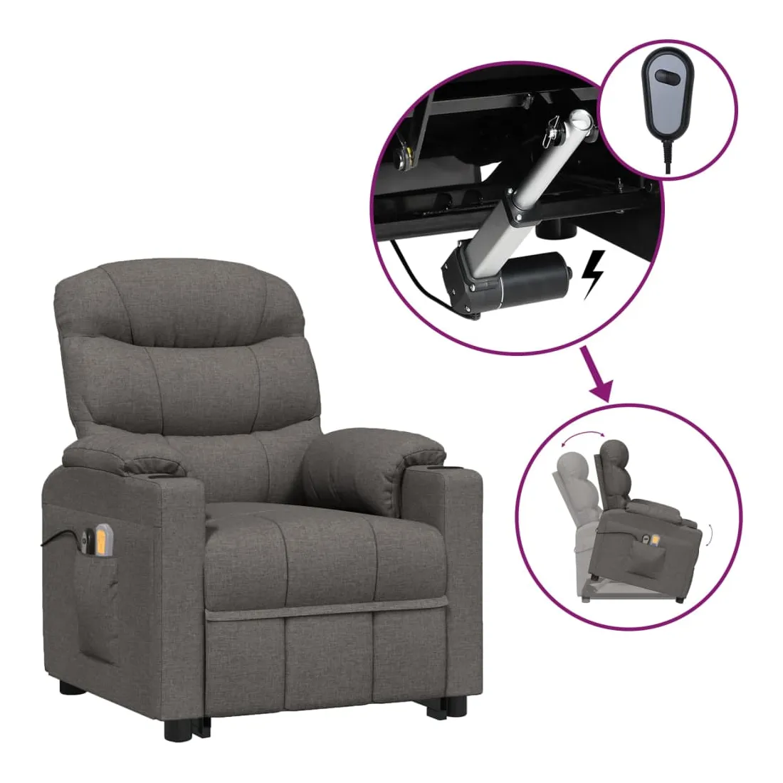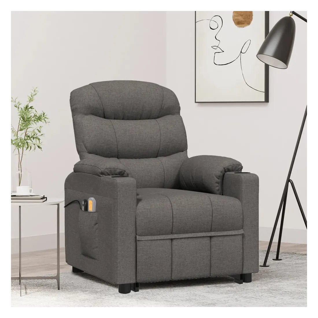 Asseyez-vous et détendez-vous dans ce fauteuil de massage très confortable ! Fonction d'inclinaison manuelle : le fauteuil inclinable est spécialement conçu avec 3 positions d'inclinaison afin que vous puissiez régler manuellement le dossier et le repose-pieds selon votre confort.Fonction de levage électrique : ce fauteuil inclinable pour personnes âgées est équipé d'un moteur électrique pour la fonction de levage. Grâce à la fonction qui pousse toute la chaise vers le haut, vous pouvez facilement vous tenir debout sans stresser votre dos et vos genoux grâce à la commande manuelle à 2 boutons.Fonction de vibration : les 6 points de massage vous permettent de faire l'expérience d'un massage mieux ciblé. De plus, la télécommande incluse vous permet de choisir différents programmes de massage. La fonction de massage est alimentée par le connecteur USB, mais la source d'alimentation USB 5V certifiée n'est pas incluse.Expérience d'assise confortable : le siège, le dossier et les larges accoudoirs rembourrés épais recouverts de tissu procurent une sensation confortable et chaleureuse, vous permettant de vous sentir enveloppé lorsque vous êtes assis. Le tissu présente un aspect simple et épuré, et est respirant et durable.Cadre solide et stable : le cadre en bois et en métal offre une structure solide et une grande stabilité. Ce fauteuil inclinable est confortable et durable.