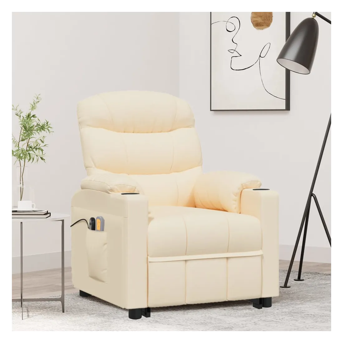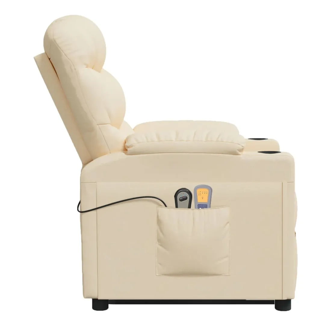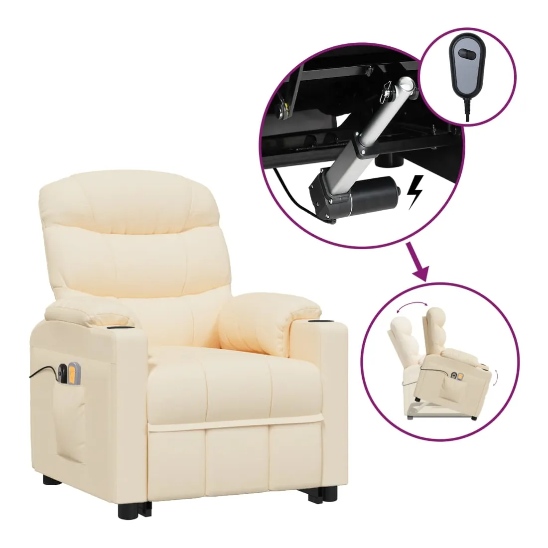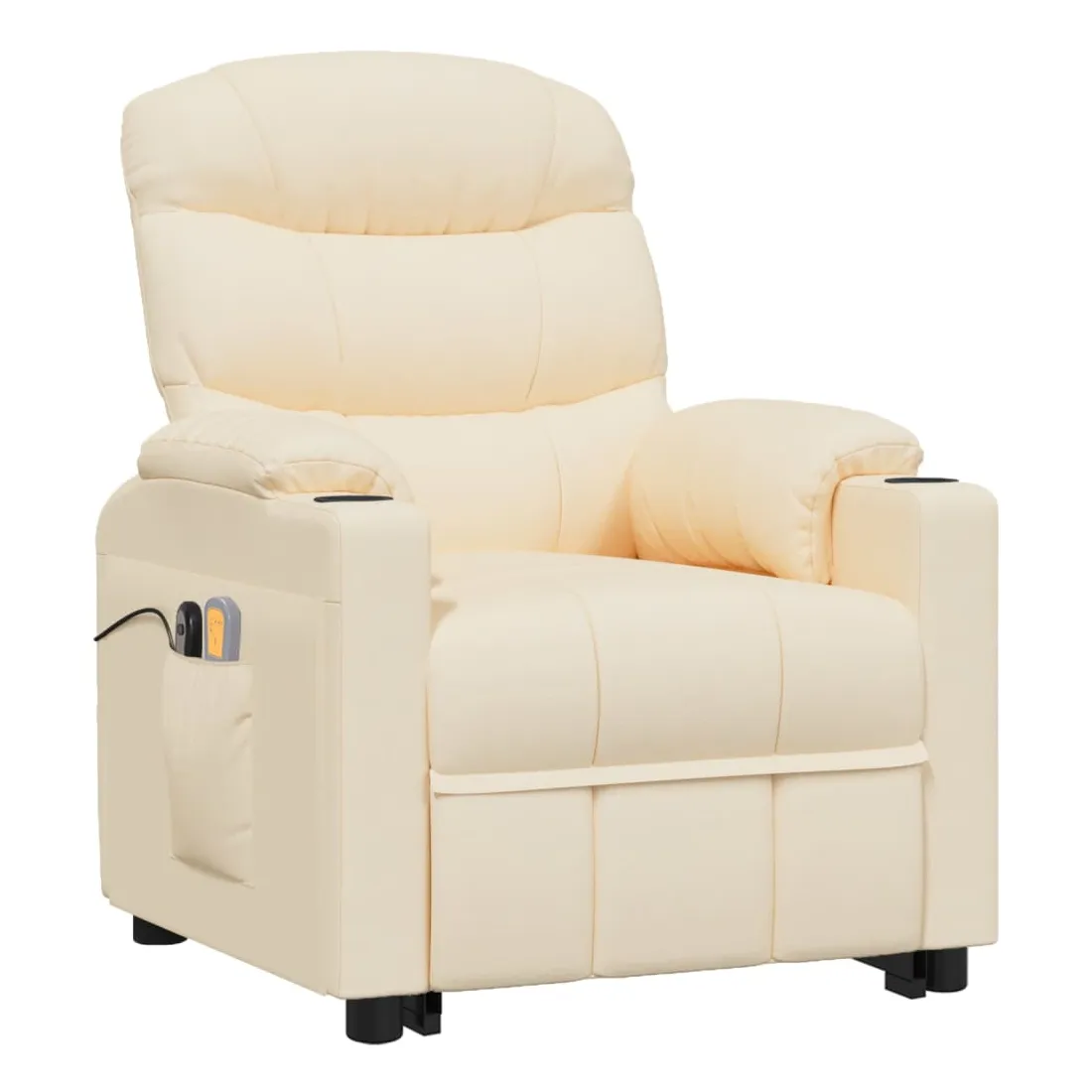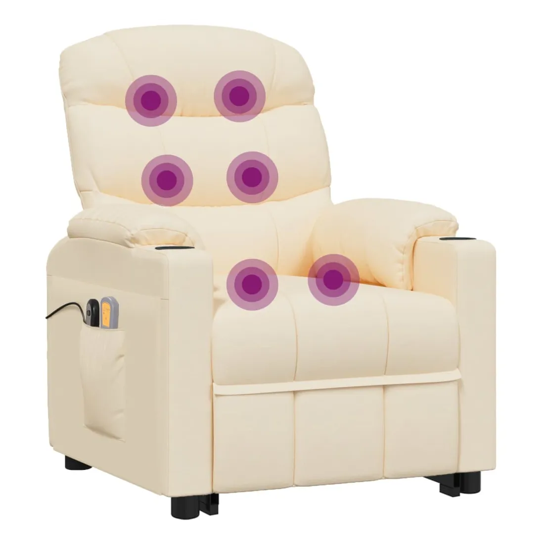 Asseyez-vous et détendez-vous dans ce fauteuil de massage très confortable ! Fonction d'inclinaison manuelle : le fauteuil inclinable est spécialement conçu avec 3 positions d'inclinaison afin que vous puissiez régler manuellement le dossier et le repose-pieds selon votre confort.Fonction de levage électrique : ce fauteuil inclinable pour personnes âgées est équipé d'un moteur électrique pour la fonction de levage. Grâce à la fonction qui pousse toute la chaise vers le haut, vous pouvez facilement vous tenir debout sans stresser votre dos et vos genoux grâce à la commande manuelle à 2 boutons.Fonction de vibration : les 6 points de massage vous permettent de faire l'expérience d'un massage mieux ciblé. De plus, la télécommande incluse vous permet de choisir différents programmes de massage. La fonction de massage est alimentée par le connecteur USB, mais la source d'alimentation USB 5V certifiée n'est pas incluse.Expérience d'assise confortable : le siège, le dossier et les larges accoudoirs rembourrés épais recouverts de tissu procurent une sensation confortable et chaleureuse, vous permettant de vous sentir enveloppé lorsque vous êtes assis. Le tissu présente un aspect simple et épuré, et est respirant et durable.Cadre solide et stable : le cadre en bois et en métal offre une structure solide et une grande stabilité. Ce fauteuil inclinable est confortable et durable.
