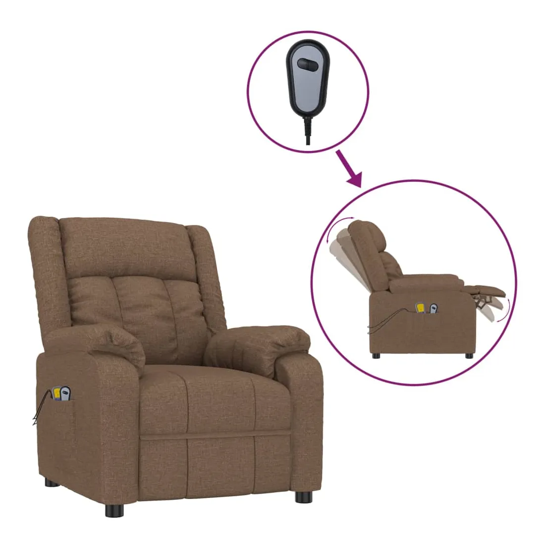 Asseyez-vous et détendez-vous dans ce fauteuil de massage électrique très confortable ! Fonction d'inclinaison électrique : le fauteuil inclinable est équipé d'un moteur électrique pour la fonction d'inclinaison. Il offre 3 positions d'inclinaison et vous pouvez facilement régler le dossier et le repose-pied à l'aide de la commande manuelle à 2 boutons incluse, en fonction de votre confort.Fonction de vibration : les 6 points de massage vous permettent de faire l'expérience d'un massage mieux ciblé. De plus, la télécommande incluse vous permet de choisir différents programmes de massage. La fonction de massage est alimentée par le connecteur USB, mais la source d'alimentation USB 5V certifiée n'est pas incluse.Expérience d'assise confortable : le siège, le dossier et les larges accoudoirs rembourrés épais recouverts de tissu procurent une sensation confortable et chaleureuse, vous permettant de vous sentir enveloppé lorsque vous êtes assis. Le tissu présente un aspect simple et épuré, et est respirant et durable.Cadre solide et stable : le cadre en bois et en métal offre une structure solide et une grande stabilité. Ce fauteuil inclinable est confortable et durable.