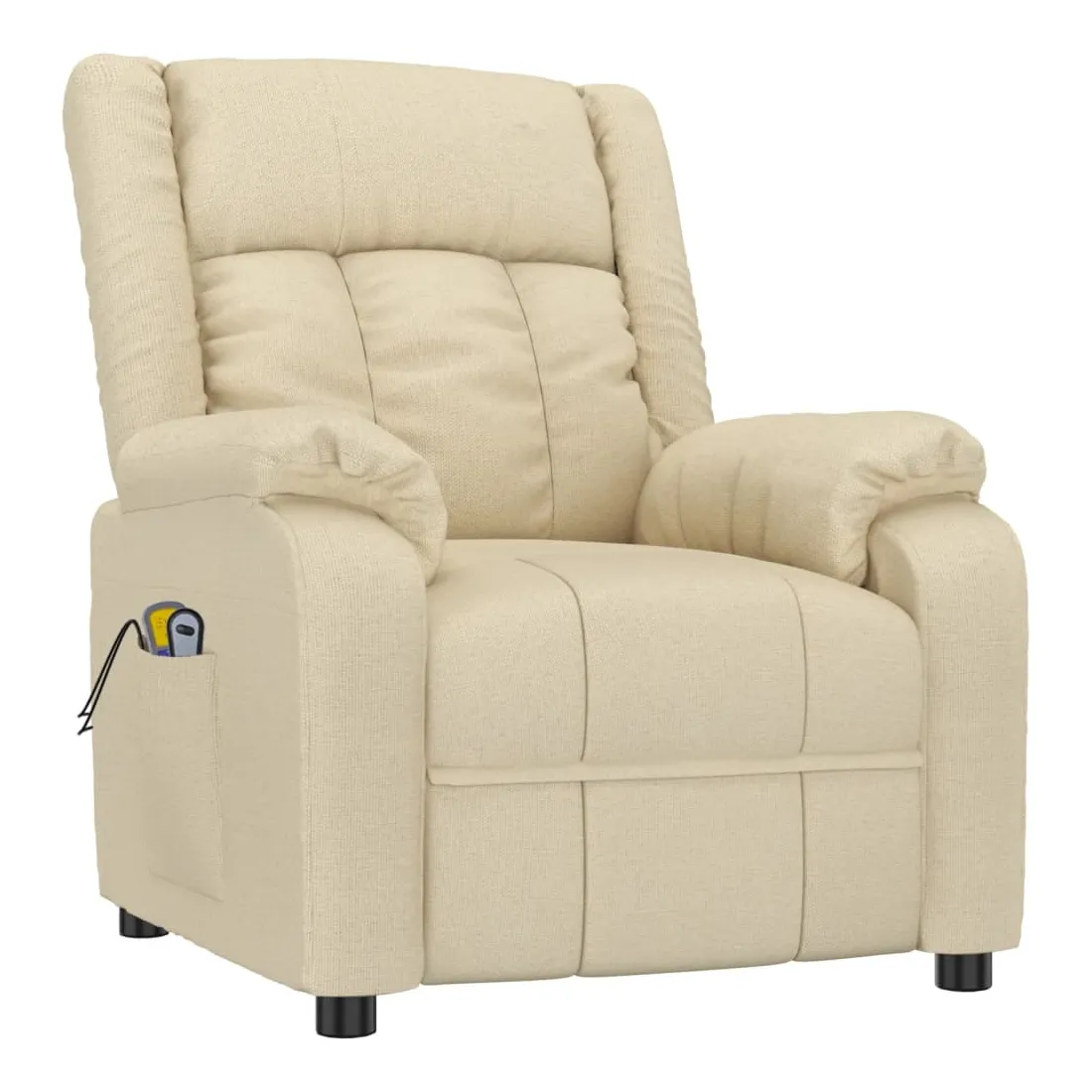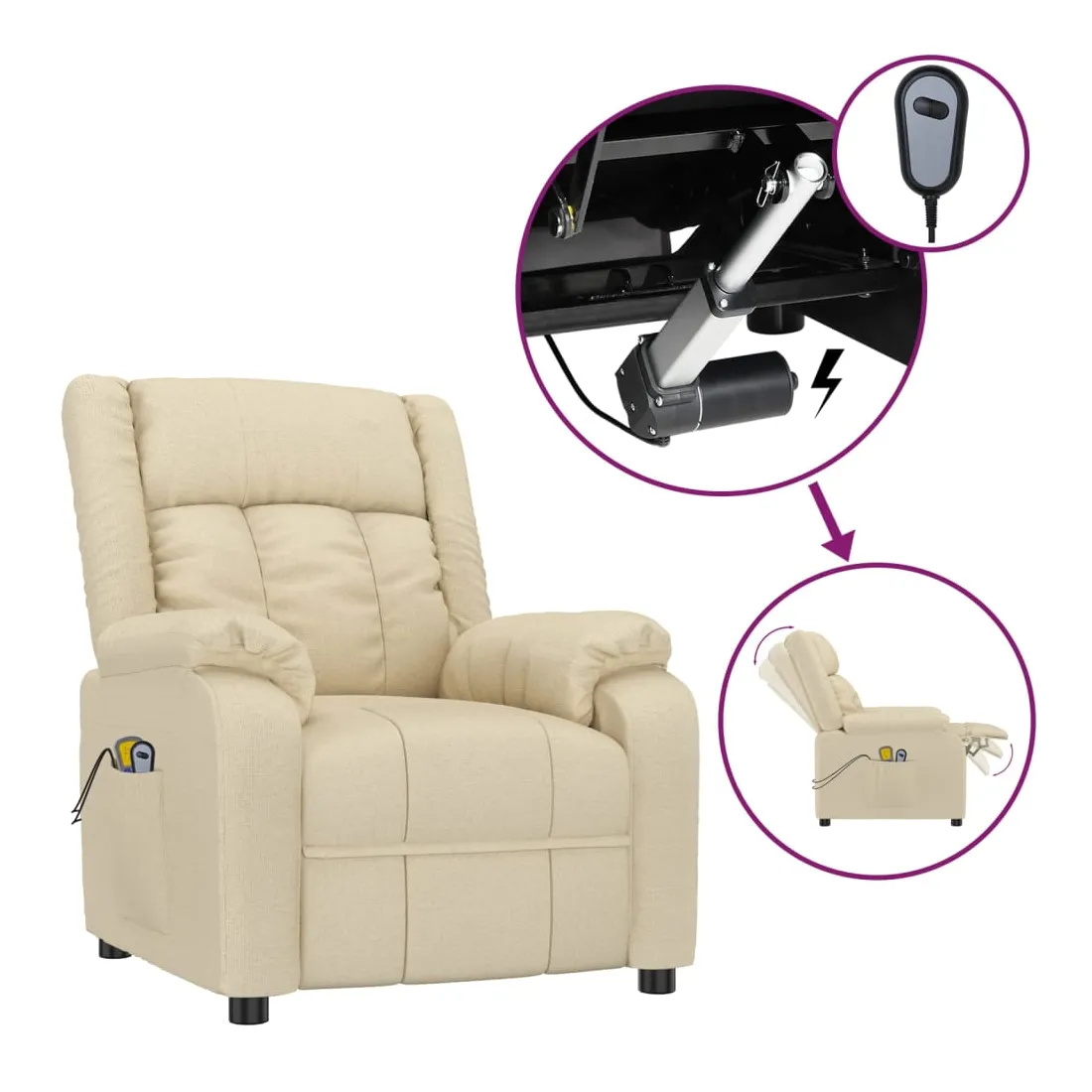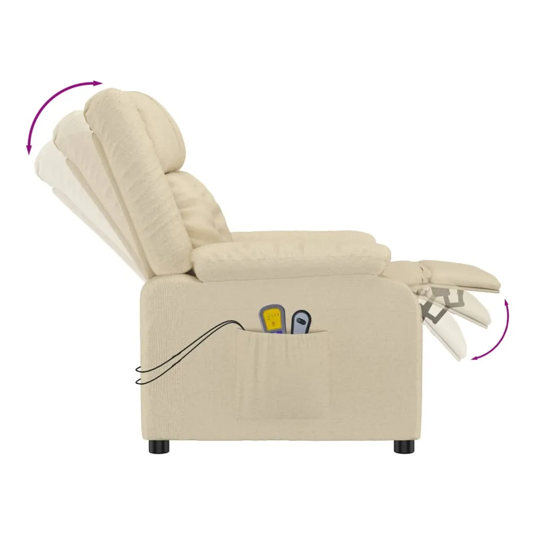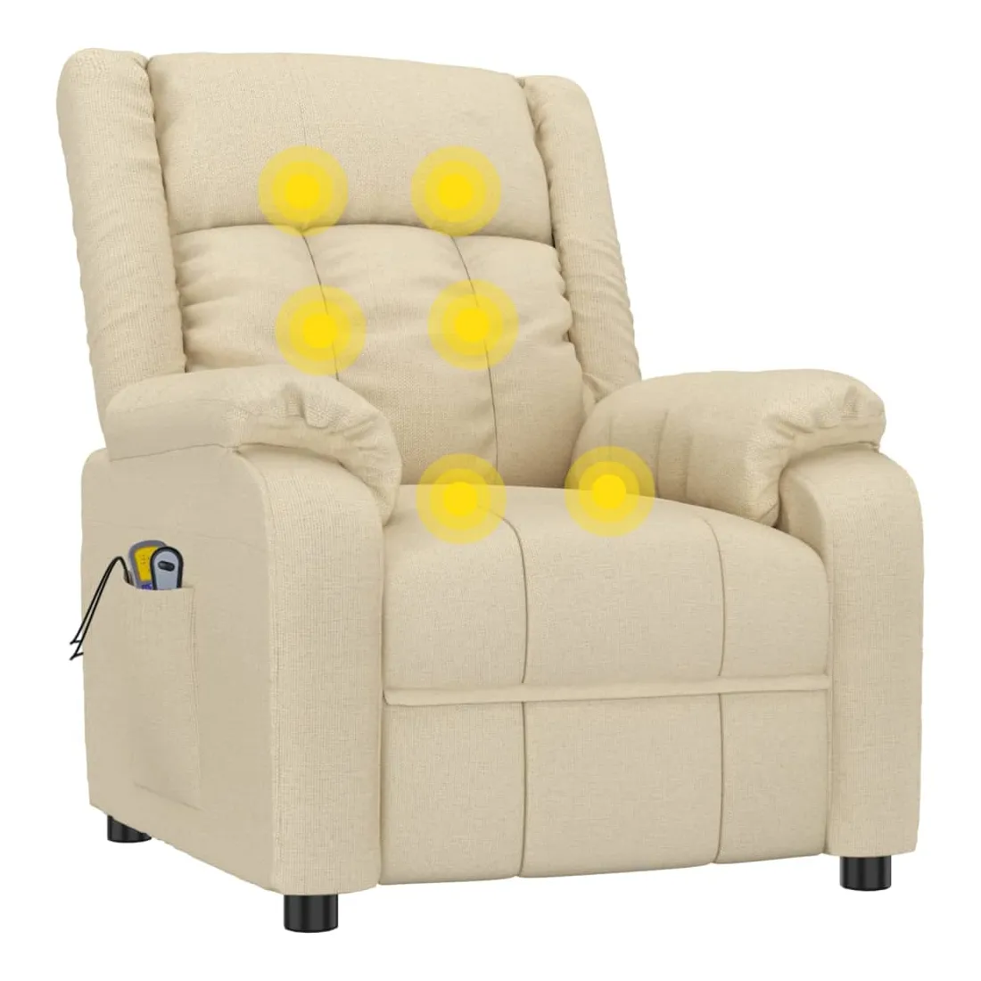 Asseyez-vous et détendez-vous dans ce fauteuil de massage électrique très confortable ! Fonction d'inclinaison électrique : le fauteuil inclinable est équipé d'un moteur électrique pour la fonction d'inclinaison. Il offre 3 positions d'inclinaison et vous pouvez facilement régler le dossier et le repose-pied à l'aide de la commande manuelle à 2 boutons incluse, en fonction de votre confort.Fonction de vibration : les 6 points de massage vous permettent de faire l'expérience d'un massage mieux ciblé. De plus, la télécommande incluse vous permet de choisir différents programmes de massage. La fonction de massage est alimentée par le connecteur USB, mais la source d'alimentation USB 5V certifiée n'est pas incluse.Expérience d'assise confortable : le siège, le dossier et les larges accoudoirs rembourrés épais recouverts de tissu procurent une sensation confortable et chaleureuse, vous permettant de vous sentir enveloppé lorsque vous êtes assis. Le tissu présente un aspect simple et épuré, et est respirant et durable.Cadre solide et stable : le cadre en bois et en métal offre une structure solide et une grande stabilité. Ce fauteuil inclinable est confortable et durable.
