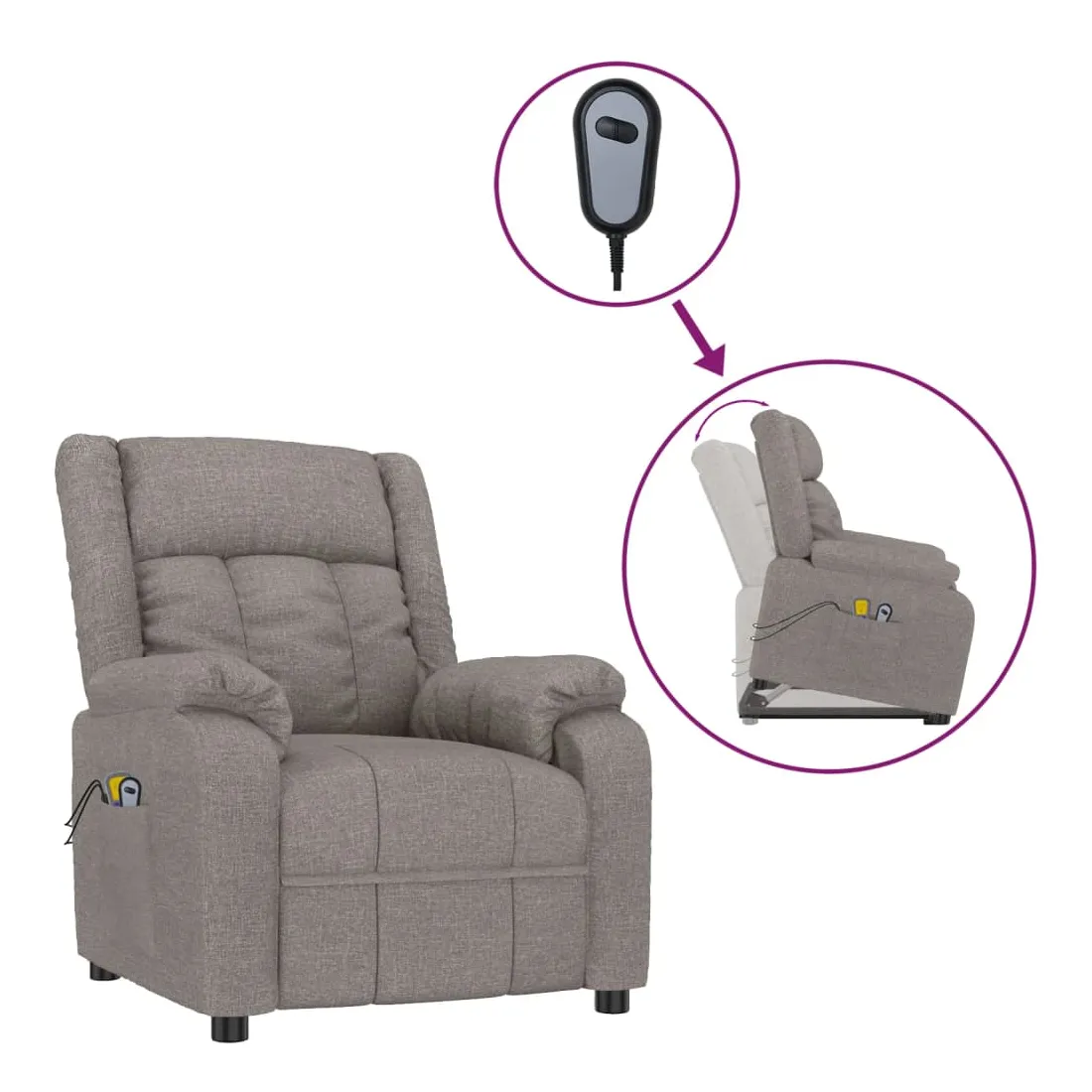 Asseyez-vous et détendez-vous dans ce fauteuil de massage très confortable ! Fonction d'inclinaison manuelle : le fauteuil inclinable est spécialement conçu avec 3 positions d'inclinaison afin que vous puissiez régler manuellement le dossier et le repose-pieds selon votre confort.Fonction de levage électrique : ce fauteuil inclinable pour personnes âgées est équipé d'un moteur électrique pour la fonction de levage. Grâce à la fonction qui pousse toute la chaise vers le haut, vous pouvez facilement vous tenir debout sans stresser votre dos et vos genoux grâce à la commande manuelle à 2 boutons.Fonction de vibration : les 6 points de massage vous permettent de faire l'expérience d'un massage mieux ciblé. De plus, la télécommande incluse vous permet de choisir différents programmes de massage. La fonction de massage est alimentée par le connecteur USB, mais la source d'alimentation USB 5V certifiée n'est pas incluse.Expérience d'assise confortable : le siège, le dossier et les larges accoudoirs rembourrés épais recouverts de tissu procurent une sensation confortable et chaleureuse, vous permettant de vous sentir enveloppé lorsque vous êtes assis. Le tissu présente un aspect simple et épuré, et est respirant et durable.Cadre solide et stable : le cadre en bois et en métal offre une structure solide et une grande stabilité. Ce fauteuil inclinable est confortable et durable.