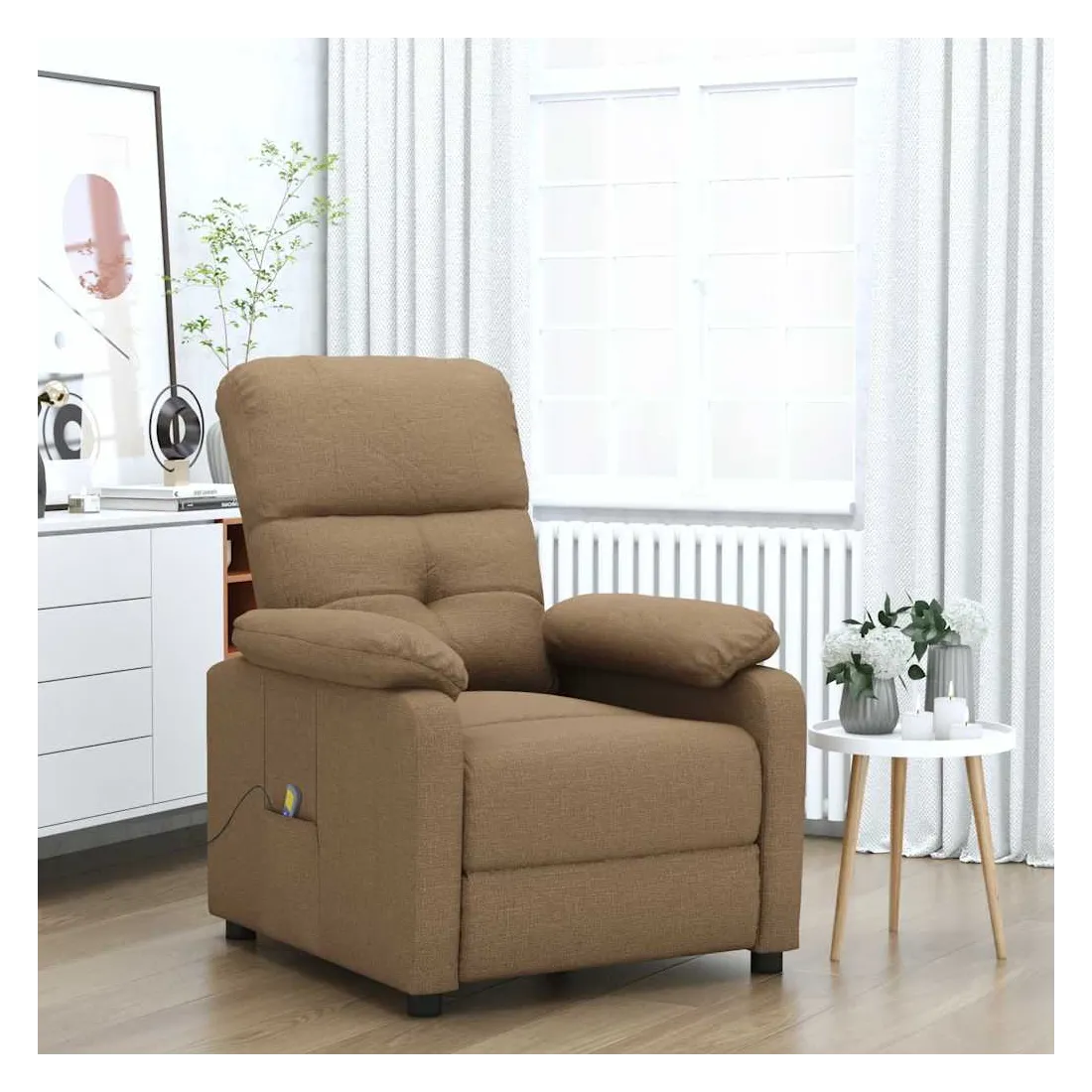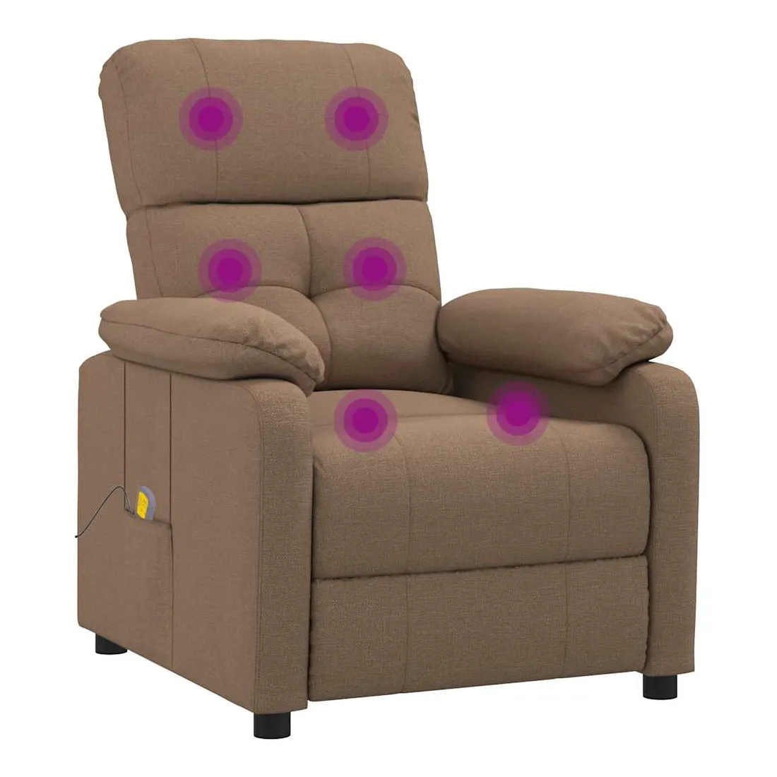 Asseyez-vous et détendez-vous dans ce fauteuil de massage très confortable ! Fonction d'inclinaison manuelle : le fauteuil inclinable est spécialement conçu avec 3 positions d'inclinaison afin que vous puissiez régler manuellement le dossier et le repose-pieds selon votre confort.Fonction de vibration : les 6 points de massage vous permettent de faire l'expérience d'un massage mieux ciblé. De plus, la télécommande incluse vous permet de choisir différents programmes de massage. La fonction de massage est alimentée par le connecteur USB, mais la source d'alimentation USB 5V certifiée n'est pas incluse.Expérience d'assise confortable : le siège, le dossier et les larges accoudoirs rembourrés épais recouverts de tissu procurent une sensation confortable et chaleureuse, vous permettant de vous sentir enveloppé lorsque vous êtes assis. Le tissu présente un aspect simple et épuré, et est respirant et durable.Cadre solide et stable : le cadre en bois et en métal offre une structure solide et une grande stabilité. Ce fauteuil inclinable est confortable et durable.