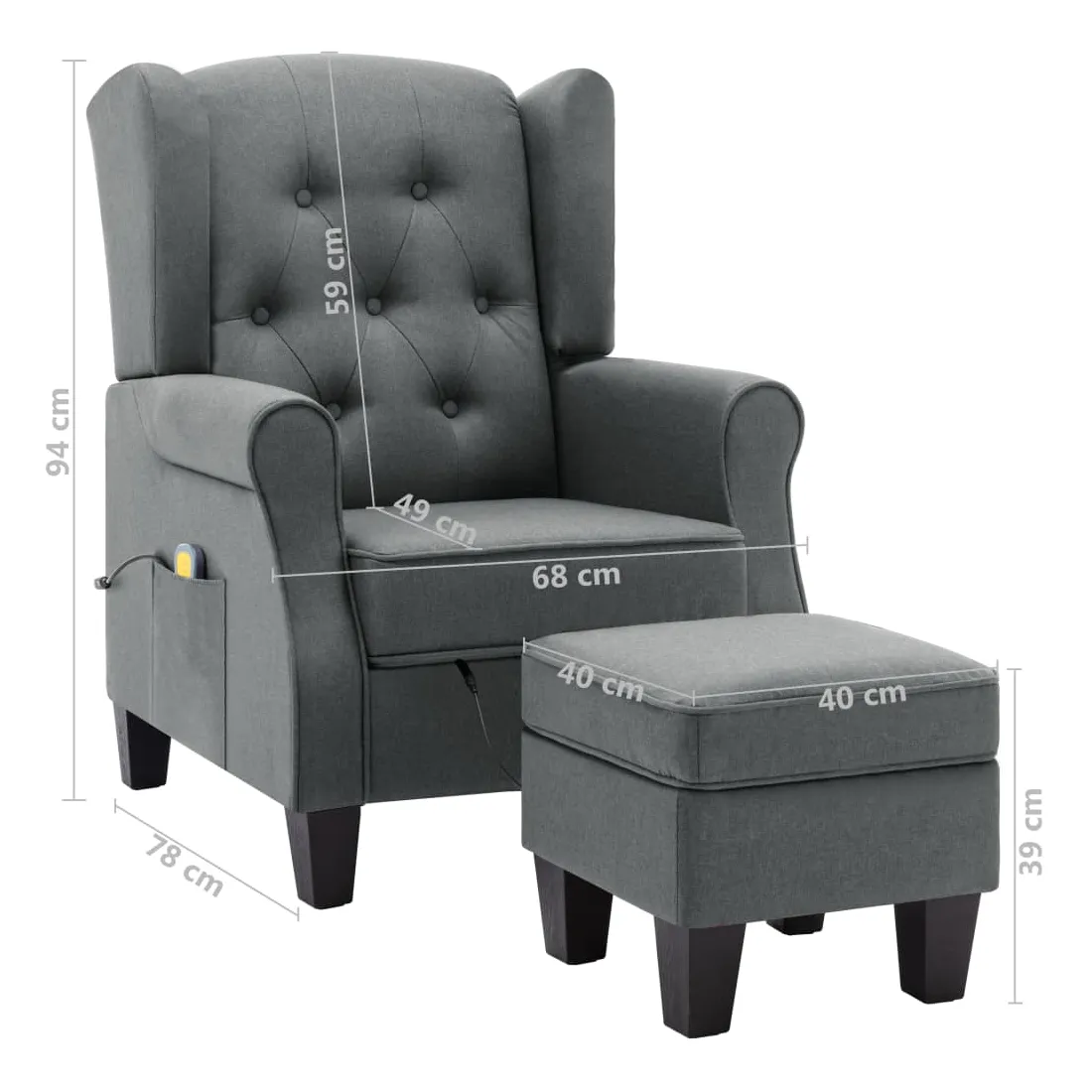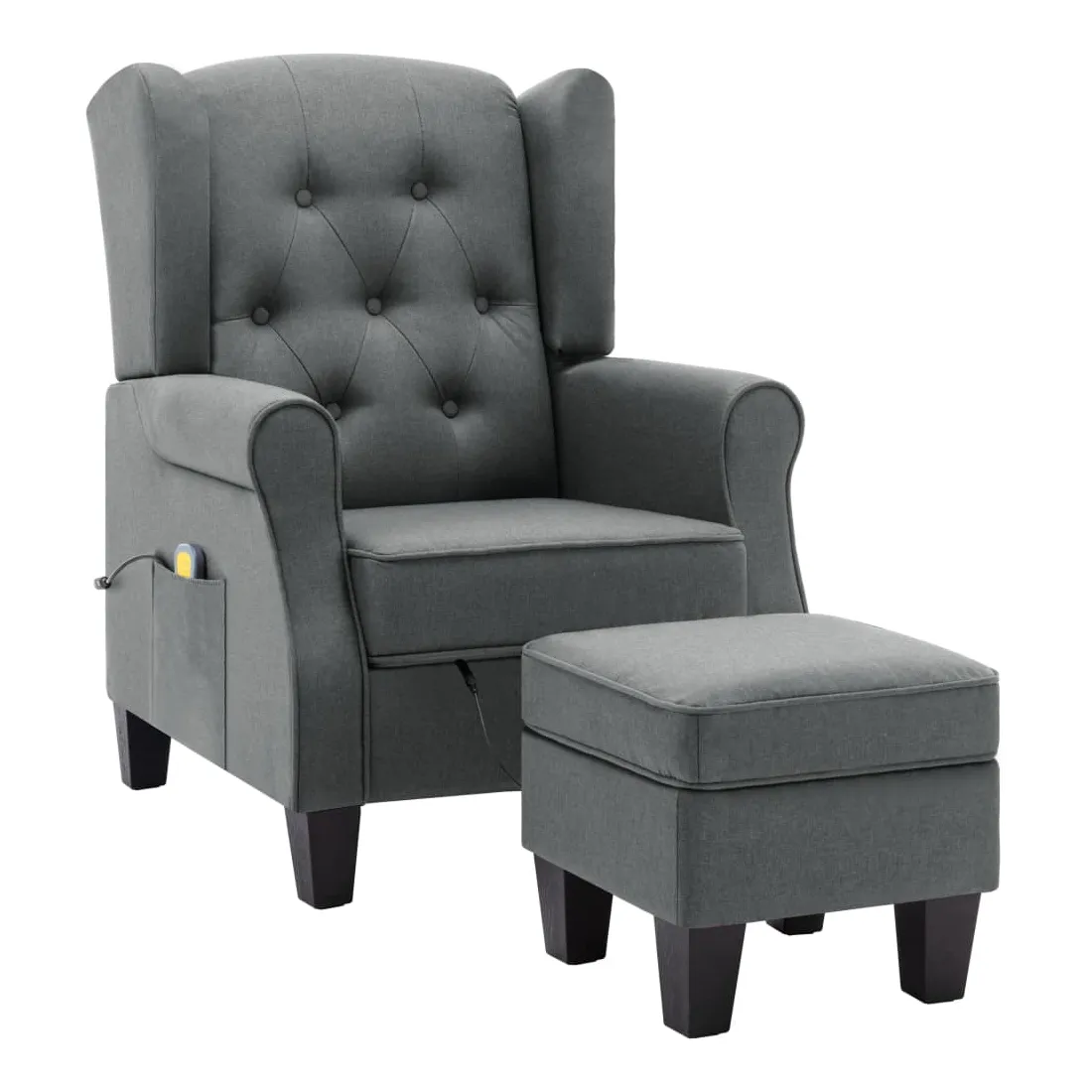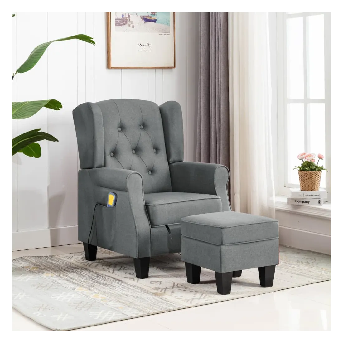 Le fauteuil de massage avec un repose-pied ajoute un aspect moderne à votre décoration intérieure et est parfait pour votre espace de vie. Le fauteuil de massage électrique est fait de tissu et rempli de mousse, ce qui le rend résistant et doux pour vous y asseoir. Les pieds en bois offrent une stabilité supplémentaire à ce fauteuil. Ce fauteuil de massage dispose d'un haut dossier à ailettes et d’un rembourrage profond, offrant un grand confort. Le fauteuil de massage dispose de 4 points de massage pour le dossier et le siège, et le repose-pied dispose de 2 points de massage pour les jambes. La télécommande incluse vous permet de choisir différents programmes de massage. Le fauteuil de massage TV est également équipé de poche latérale pour la télécommande. Le repose-pied est rempli de coton PP, et son dessus est amovible. Remarque : ce produit est doté d'un connecteur USB, mais la source d'alimentation certifiée de USB 5V n'est pas incluse.