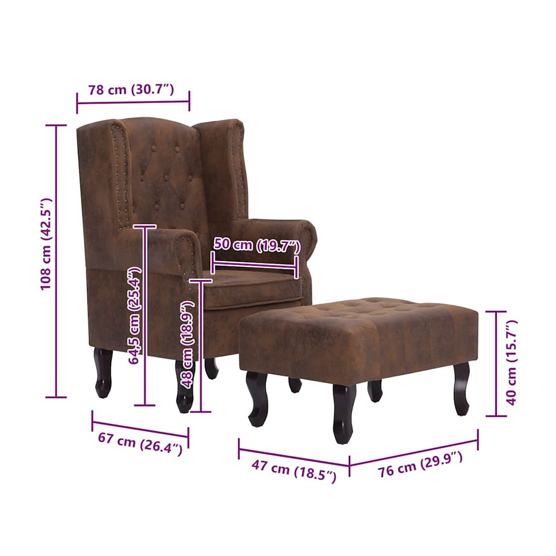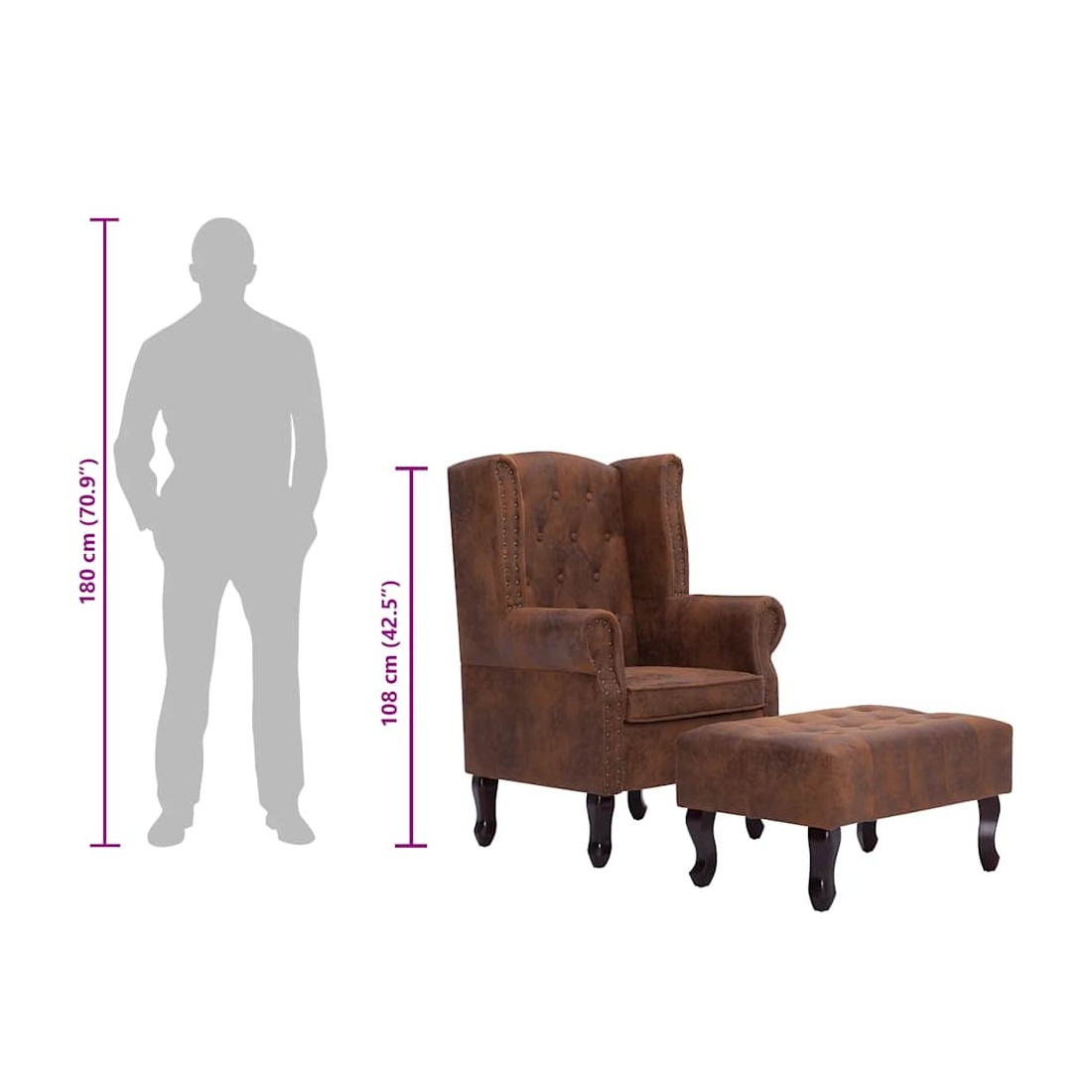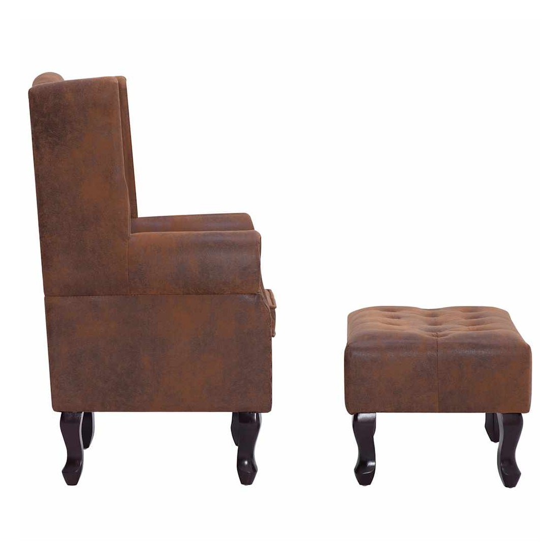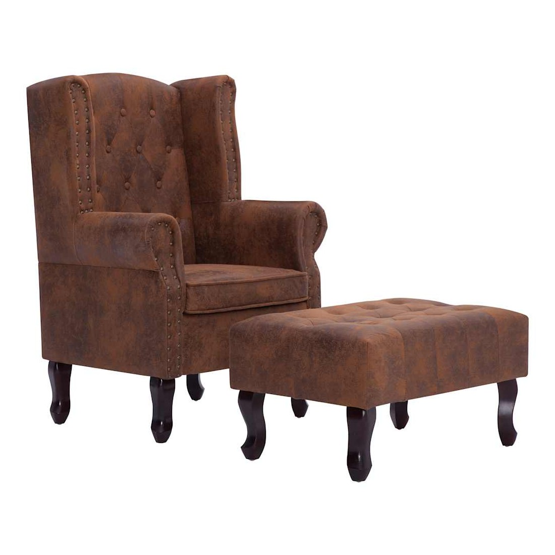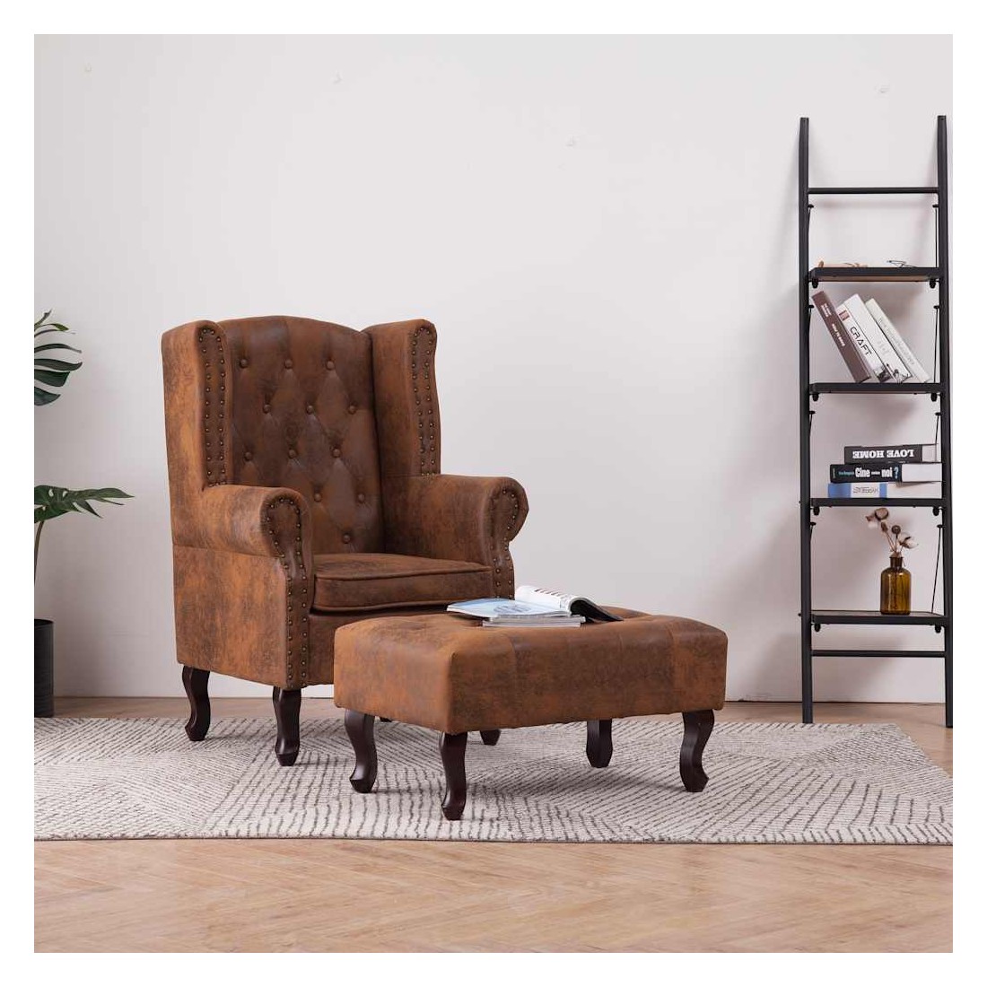 Notre fauteuil Chesterfield allie style et confort et sa tapisserie en similicuir daim ajoutera une touche de luxe à votre intérieur. La chaise de canapé est fabriquée avec un cadre en bois très robuste et durable. Son assise et son dossier souples font de cette chaise l'endroit idéal pour vous détendre. De plus, les détails tuftés et cloutés et les accoudoirs aux courbes gracieuses rehaussent la beauté classique de la chaise. Un repose-pieds est également inclus pour plus de confort. Le fauteuil et le repose-pieds sont faciles à assembler. La livraison inclut 1 fauteuil et 1 repose-pied.