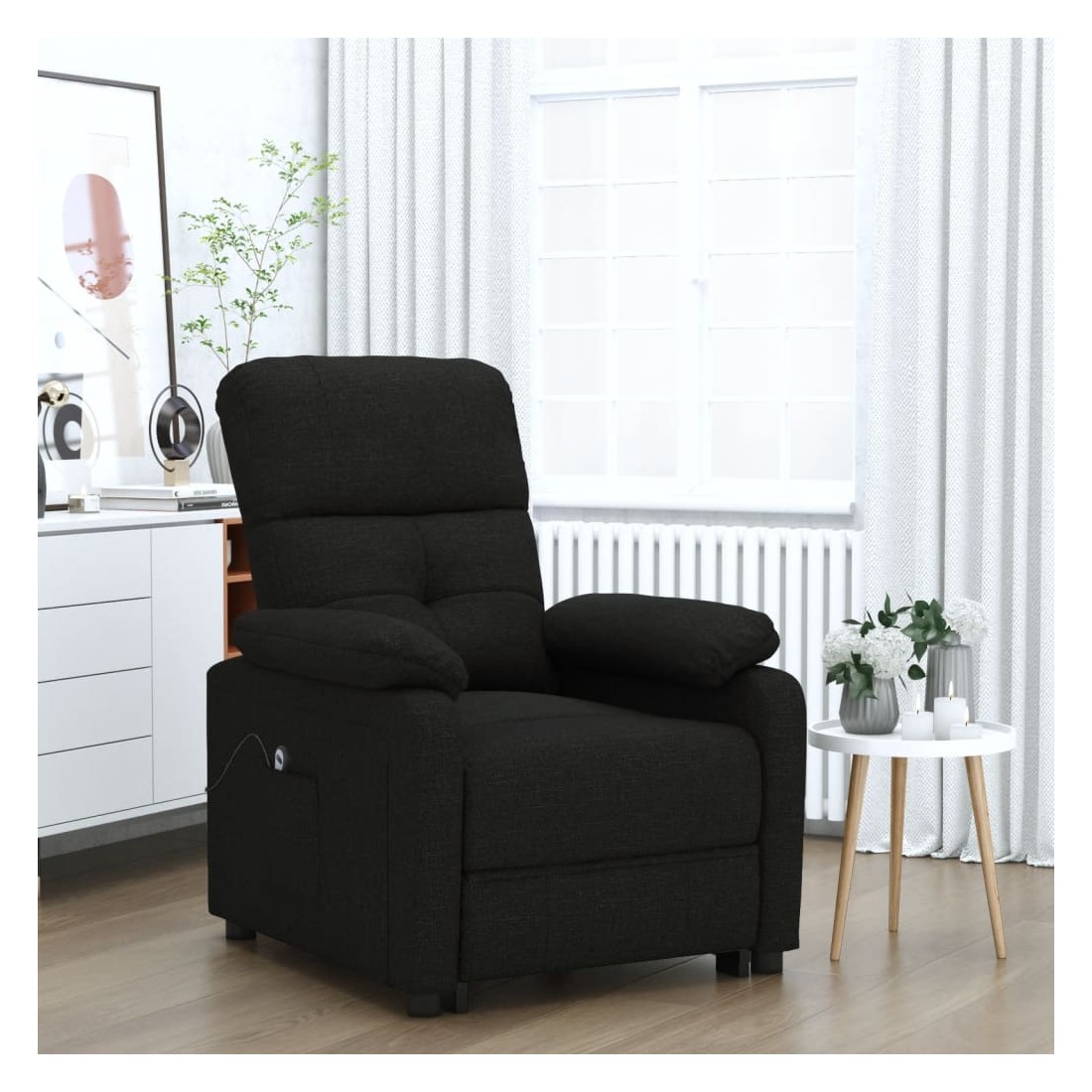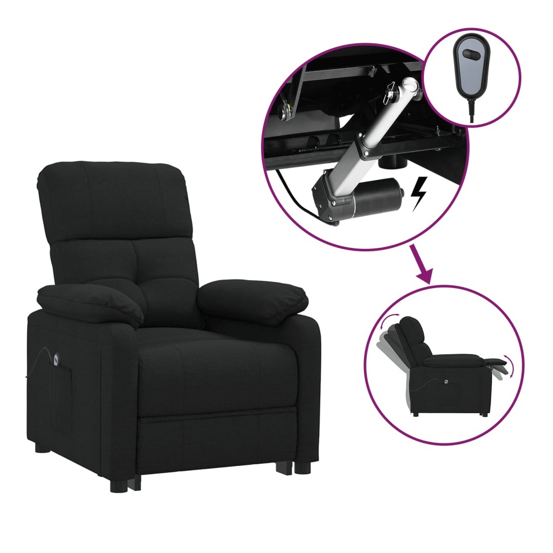Asseyez-vous et détendez-vous dans ce fauteuil inclinable électrique très confortable ! Fonction d'inclinaison électrique : le fauteuil inclinable est équipé d'un moteur électrique pour la fonction d'inclinaison. Il offre 3 positions d'inclinaison et vous pouvez facilement régler le dossier et le repose-pied à l'aide de la commande manuelle à 2 boutons incluse, en fonction de votre confort.Expérience d'assise confortable : le siège, le dossier et les larges accoudoirs rembourrés épais recouverts de tissu procurent une sensation confortable et chaleureuse, vous permettant de vous sentir enveloppé lorsque vous êtes assis. Le tissu présente un aspect simple et épuré, et est respirant et durable.Cadre solide et stable : le cadre en bois et en métal offre une structure solide et une grande stabilité. Ce fauteuil inclinable est confortable et durable.