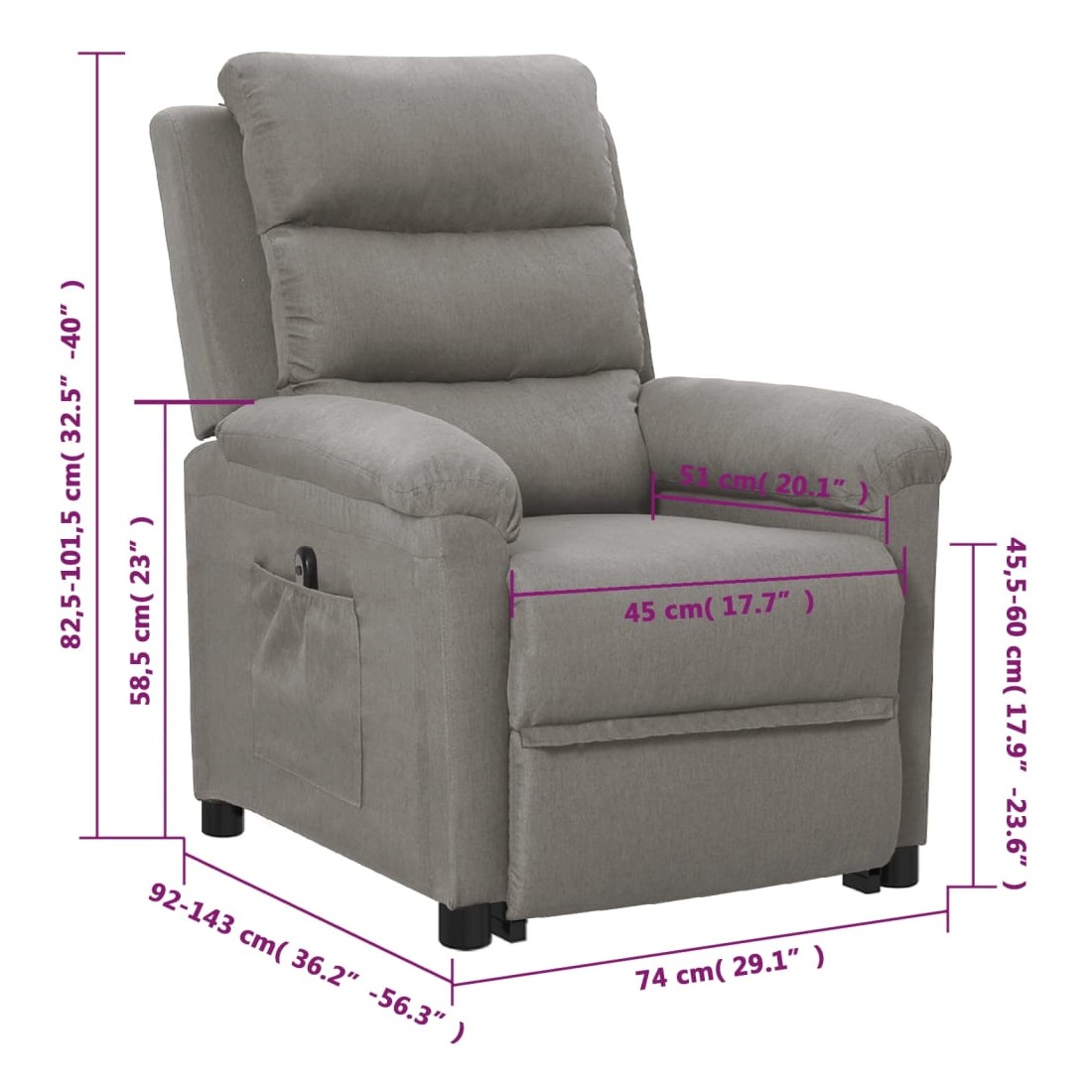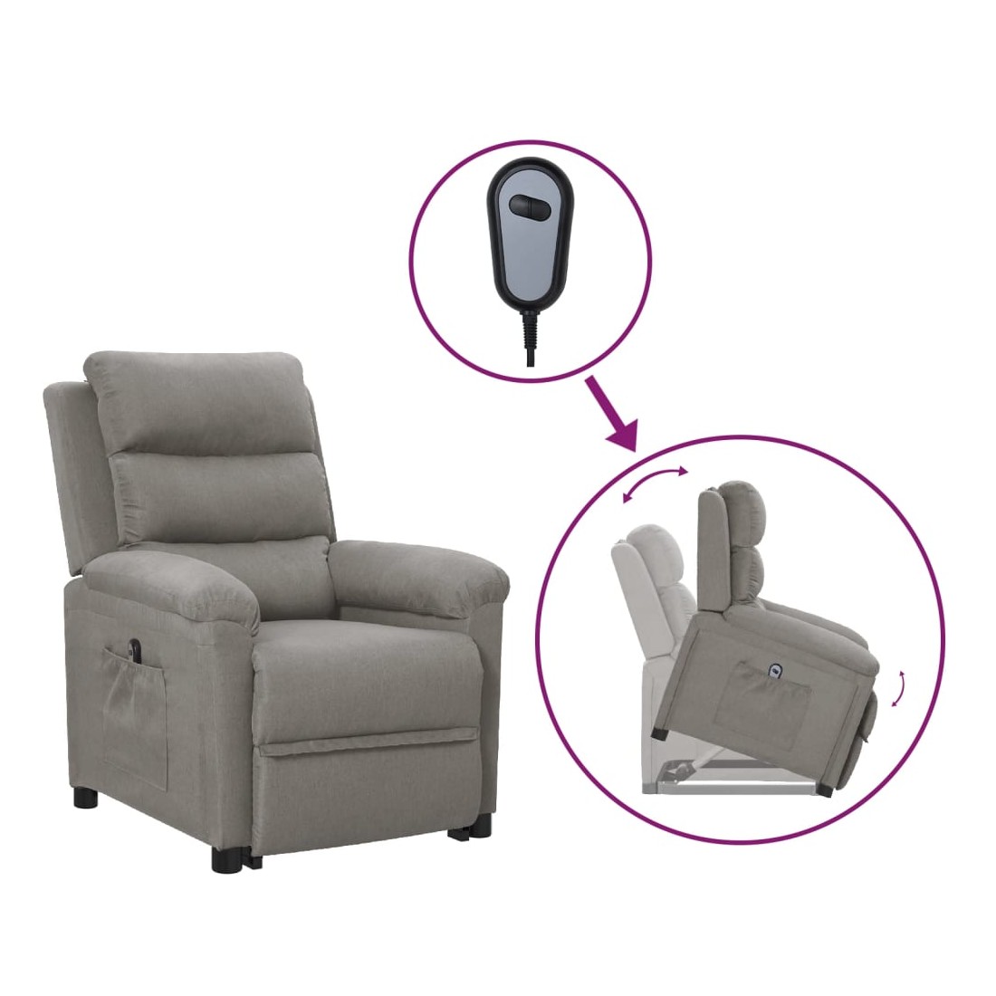 Asseyez-vous et détendez-vous dans ce fauteuil très confortable ! Fonction d'inclinaison manuelle : le fauteuil inclinable est spécialement conçu avec 3 positions d'inclinaison afin que vous puissiez régler manuellement le dossier et le repose-pieds selon votre confort.Fonction de levage électrique : ce fauteuil inclinable pour personnes âgées est équipé d'un moteur électrique pour la fonction de levage. Grâce à la fonction qui pousse toute la chaise vers le haut, vous pouvez facilement vous tenir debout sans stresser votre dos et vos genoux grâce à la commande manuelle à 2 boutons.Expérience d'assise confortable : le siège, le dossier et les larges accoudoirs rembourrés épais recouverts de tissu procurent une sensation confortable et chaleureuse, vous permettant de vous sentir enveloppé lorsque vous êtes assis. Le tissu présente un aspect simple et épuré, et est respirant et durable.Cadre solide et stable : le cadre en bois et en métal offre une structure solide et une grande stabilité. Ce fauteuil inclinable est confortable et durable.