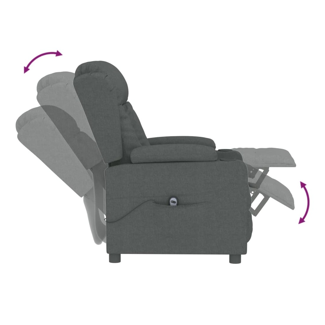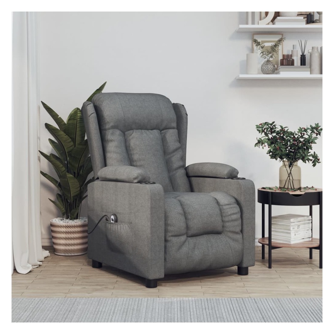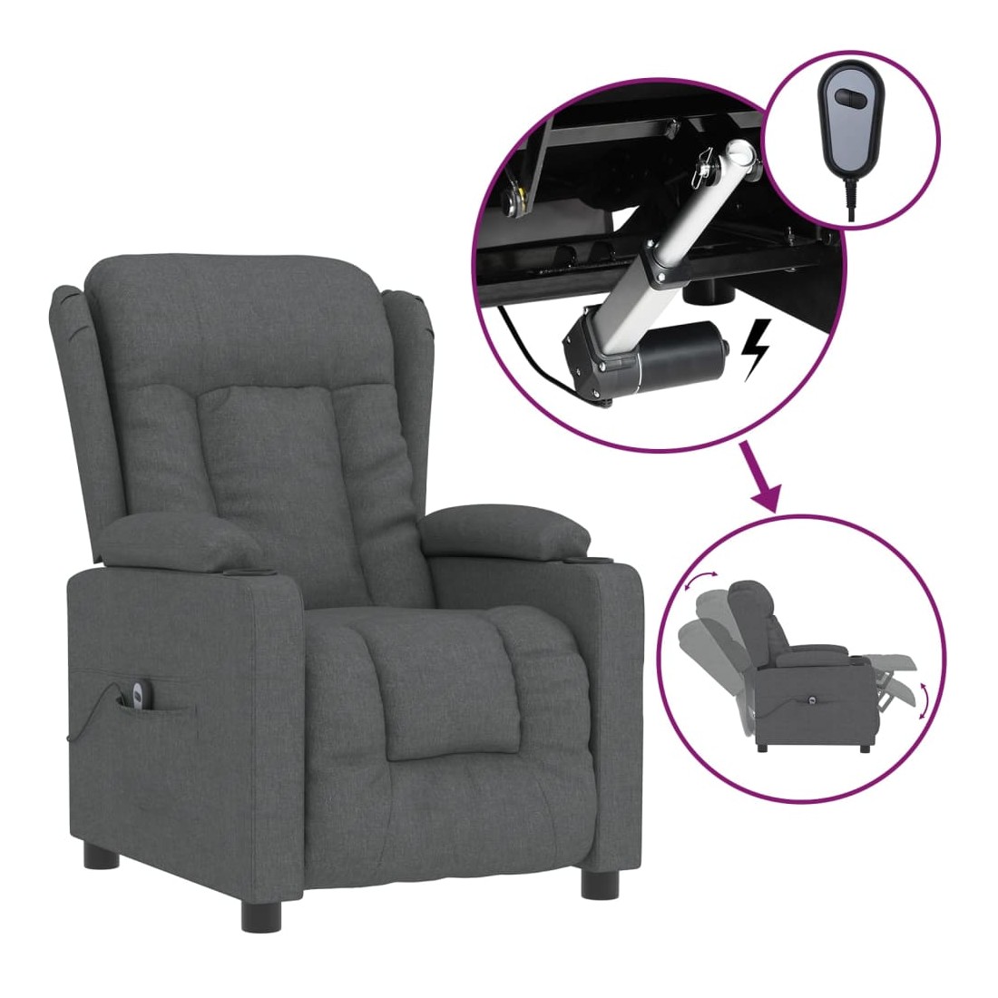 Asseyez-vous et détendez-vous dans ce fauteuil inclinable électrique très confortable ! Fonction d'inclinaison électrique : le fauteuil inclinable est équipé d'un moteur électrique pour la fonction d'inclinaison. Il offre 3 positions d'inclinaison et vous pouvez facilement régler le dossier et le repose-pied à l'aide de la commande manuelle à 2 boutons incluse, en fonction de votre confort.Expérience d'assise confortable : le siège, le dossier et les larges accoudoirs rembourrés épais recouverts de tissu procurent une sensation confortable et chaleureuse, vous permettant de vous sentir enveloppé lorsque vous êtes assis. Le tissu présente un aspect simple et épuré, et est respirant et durable.Cadre solide et stable : le cadre en bois et en métal offre une structure solide et une grande stabilité. Ce fauteuil inclinable est confortable et durable.