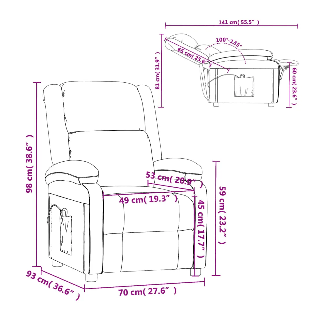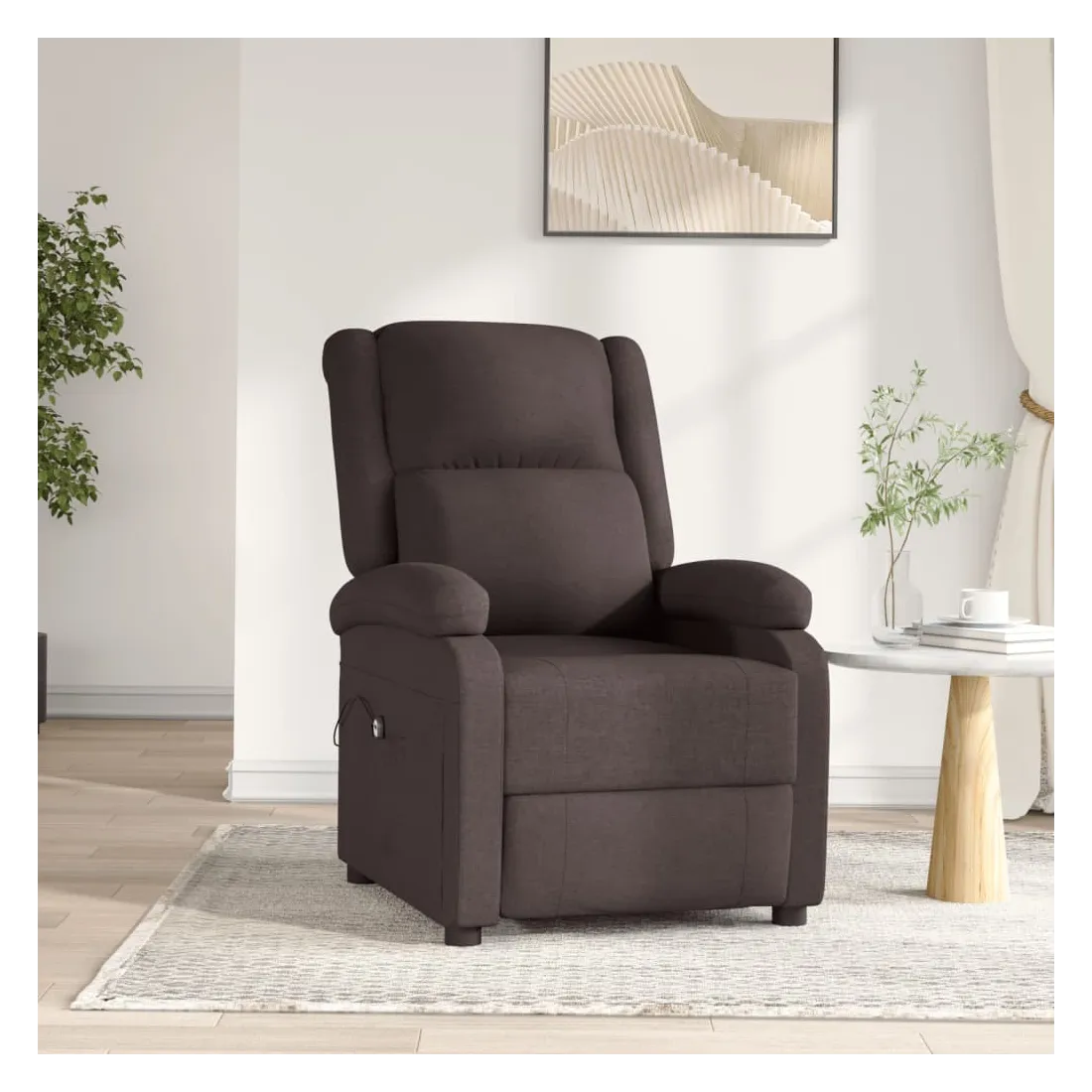 Asseyez-vous et détendez-vous dans ce fauteuil inclinable électrique très confortable ! Fonction d'inclinaison électrique : le fauteuil inclinable est équipé d'un moteur électrique pour la fonction d'inclinaison. Il offre 3 positions d'inclinaison et vous pouvez facilement régler le dossier et le repose-pied à l'aide de la commande manuelle à 2 boutons incluse, en fonction de votre confort.Expérience d'assise confortable : le siège, le dossier et les larges accoudoirs rembourrés épais recouverts de tissu procurent une sensation confortable et chaleureuse, vous permettant de vous sentir enveloppé lorsque vous êtes assis. Le tissu présente un aspect simple et épuré, et est respirant et durable.Cadre solide et stable : le cadre en bois et en métal offre une structure solide et une grande stabilité. Ce fauteuil inclinable est confortable et durable.