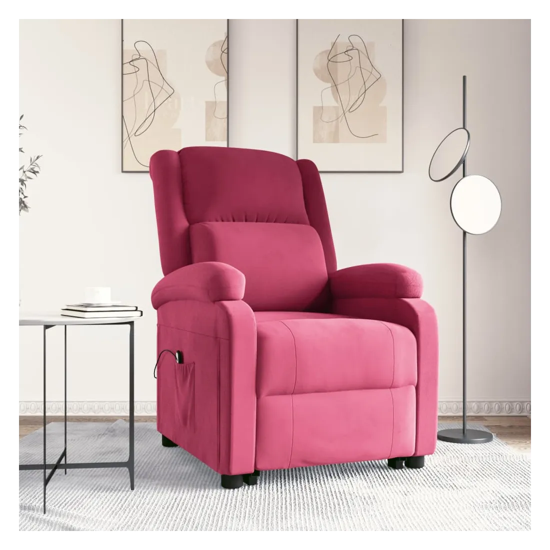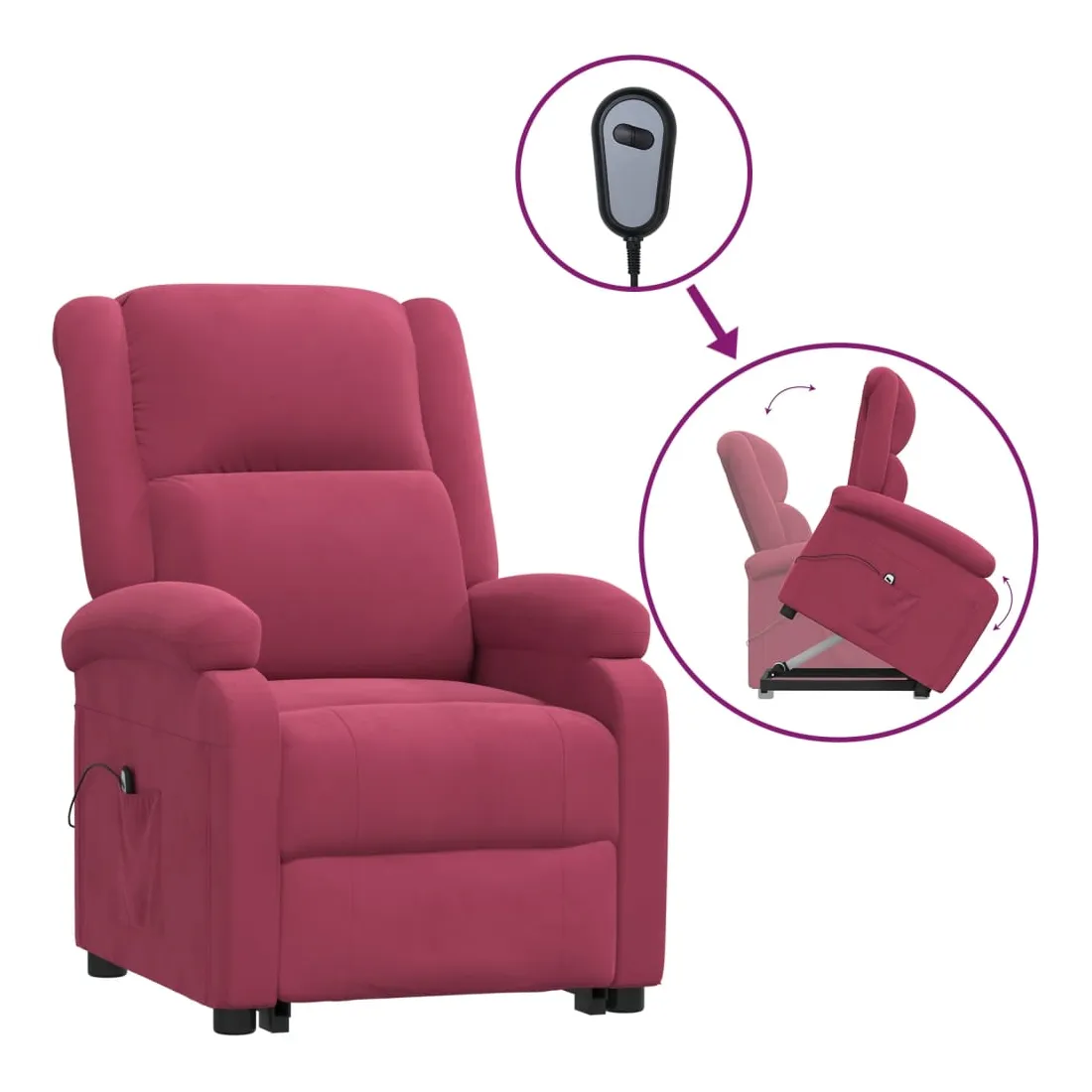 Asseyez-vous et détendez-vous dans ce fauteuil très confortable ! Fonction d'inclinaison manuelle : le fauteuil inclinable est spécialement conçu avec 3 positions d'inclinaison afin que vous puissiez régler manuellement le dossier et le repose-pieds selon votre confort.Fonction de levage électrique : ce fauteuil inclinable pour personnes âgées est équipé d'un moteur électrique pour la fonction de levage. Grâce à la fonction qui pousse toute la chaise vers le haut, vous pouvez facilement vous tenir debout sans stresser votre dos et vos genoux grâce à la commande manuelle à 2 boutons.Expérience d'assise confortable : le siège, le dossier et les larges accoudoirs rembourrés épais recouverts de velours procurent une sensation confortable et chaleureuse, vous faisant vous sentir enlacé lorsque vous êtes assis. Le velours est un tissu doux et confortable qui est agréable sur la peau.Cadre solide et stable : le cadre en bois et en métal offre une structure solide et une grande stabilité. Ce fauteuil inclinable est confortable et durable.