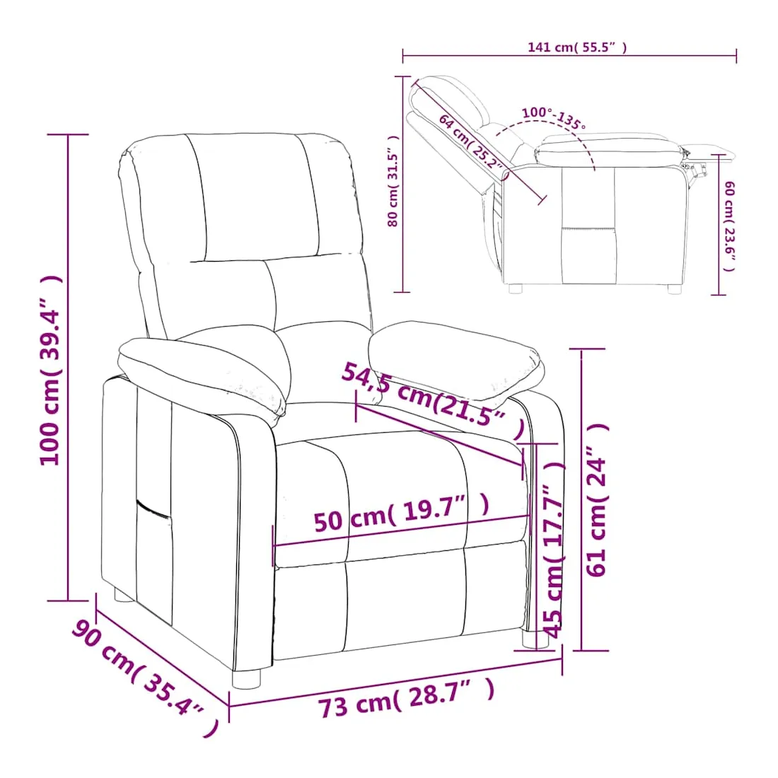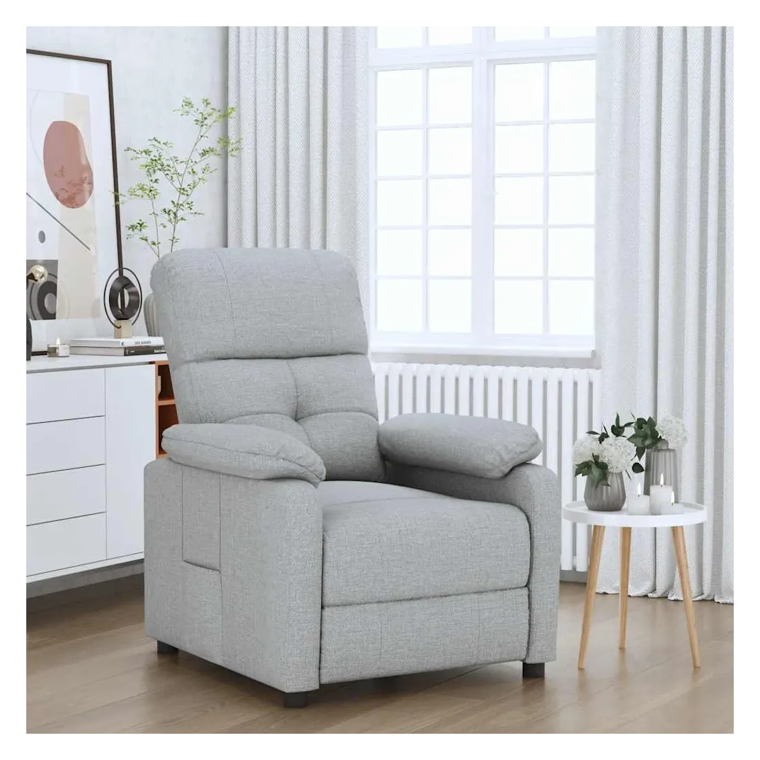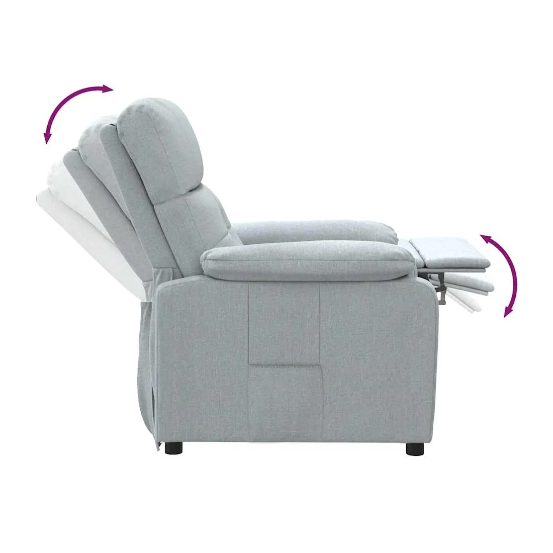 Asseyez-vous et détendez-vous dans ce fauteuil inclinable très confortable ! Fonction d'inclinaison manuelle : le fauteuil inclinable est spécialement conçu avec 3 positions d'inclinaison afin que vous puissiez régler manuellement le dossier et le repose-pieds selon votre confort.Expérience d'assise confortable : le siège, le dossier et les larges accoudoirs rembourrés épais recouverts de tissu procurent une sensation confortable et chaleureuse, vous permettant de vous sentir enveloppé lorsque vous êtes assis. Le tissu présente un aspect simple et épuré, et est respirant et durable.Cadre solide et stable : le cadre en bois et en métal offre une structure solide et une grande stabilité. Ce fauteuil inclinable est confortable et durable.