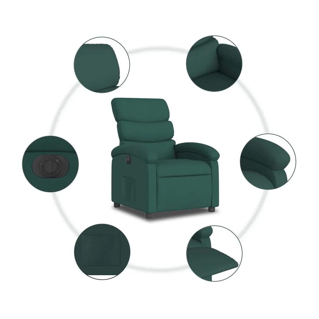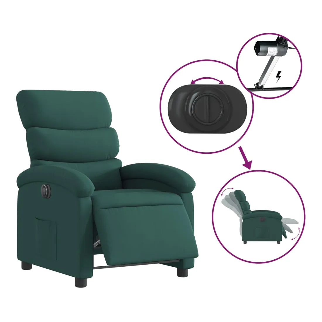 Asseyez-vous et détendez-vous dans ce fauteuil inclinable électrique très confortable ! Fonction d'inclinaison électrique : ce fauteuil inclinable est équipé d'un moteur électrique qui permet de régler automatiquement le repose-pied et le dossier dans n'importe quelle position, selon votre confort, en appuyant simplement sur le bouton situé sur le côté du fauteuil. Cette fonction permet une inclinaison maximale de 135 degrés. En outre, le dossier peut revenir automatiquement à sa position d'origine par une simple pression sur le bouton.Expérience d'assise confortable : le siège, le dossier et les larges accoudoirs bien rembourrés recouverts de tissu procurent une sensation confortable et chaleureuse, vous permettant de vous sentir enveloppé lorsque vous êtes assis. Le tissu présente un aspect simple et épuré et est respirant et durable.Poche latérale pratique : ce fauteuil est doté d'une poche latérale pour vous permettre de garder vos objets essentiels à portée de main.Cadre solide et stable : le cadre en bois et en métal offre une structure solide et une grande stabilité. Ce fauteuil inclinable est confortable et durable.