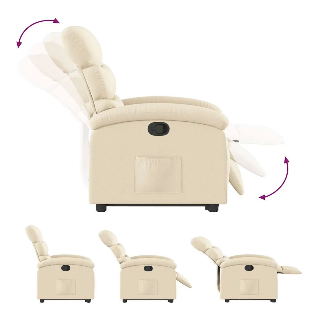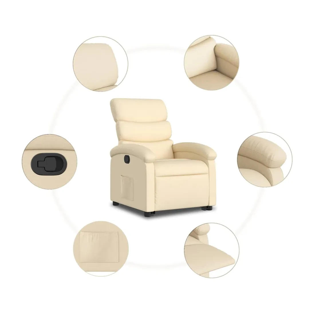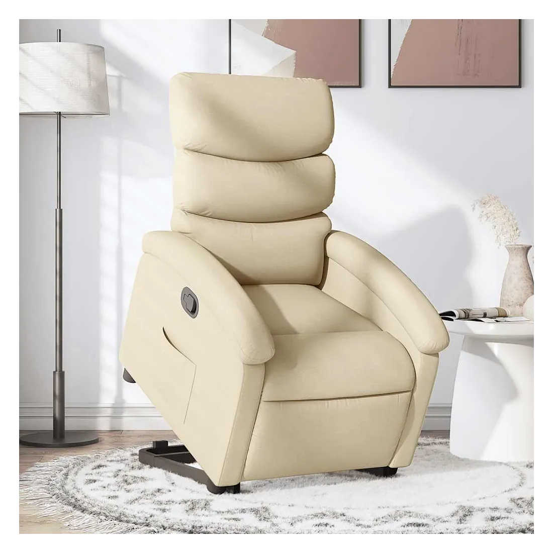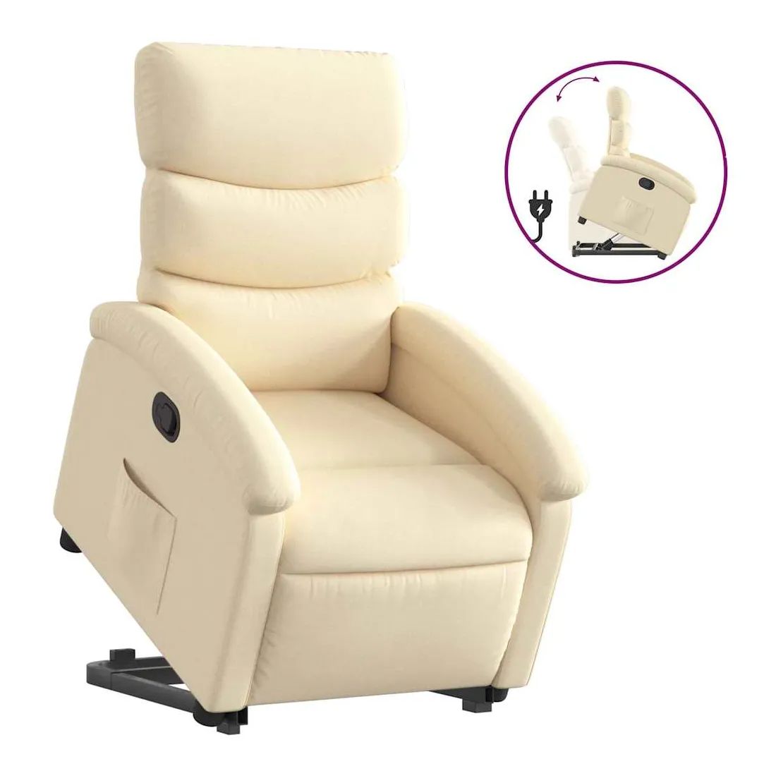 Asseyez-vous et détendez-vous dans ce fauteuil inclinable très confortable ! Fonction de levage électrique : ce fauteuil inclinable pour personnes âgées est équipé d'un moteur électrique pour la fonction de levage. Grâce à la fonction qui pousse toute la chaise vers le haut, vous pouvez facilement vous tenir debout sans stresser votre dos et vos genoux en appuyant simplement sur le bouton.Fonction d'inclinaison manuelle : ce fauteuil inclinable est doté d'une poignée du côté droit. Vous pouvez régler manuellement le repose-pieds et le dossier dans n'importe quelle position selon votre confort en tirant simplement sur la poignée. Cette fonction permet une inclinaison maximale de 135 degrés. De plus, le dossier peut revenir rapidement à sa position d'origine en tirant simplement sur la poignée.Expérience d'assise confortable : le siège, le dossier et les larges accoudoirs bien rembourrés recouverts de tissu procurent une sensation confortable et chaleureuse, vous permettant de vous sentir enveloppé lorsque vous êtes assis. Le tissu présente un aspect simple et épuré et est respirant et durable.Poche latérale pratique : ce fauteuil est doté d'une poche latérale pour vous permettre de garder vos objets essentiels à portée de main.Cadre solide et stable : le cadre en bois et en métal offre une structure solide et une grande stabilité. Ce fauteuil inclinable est confortable et durable.
