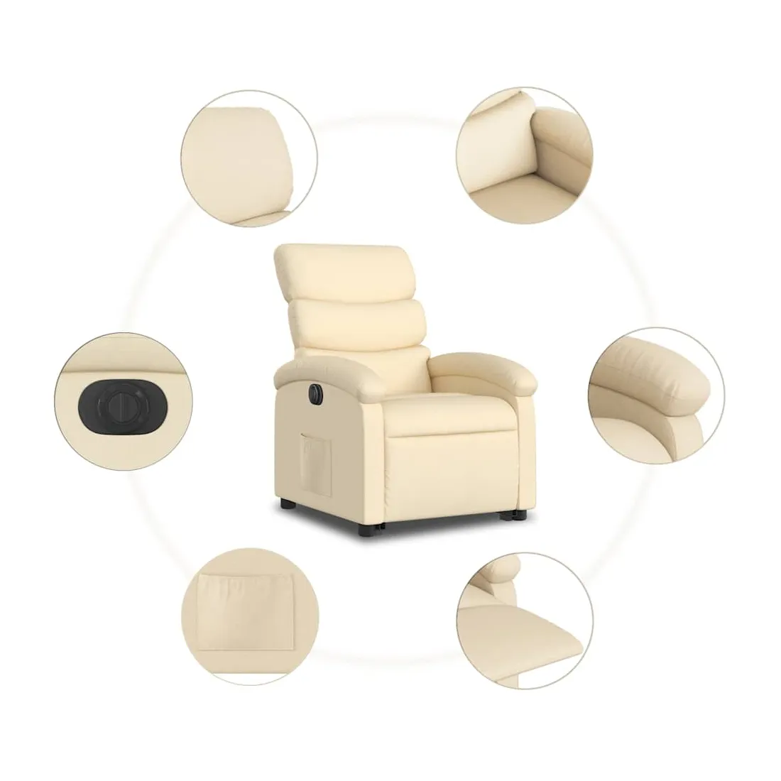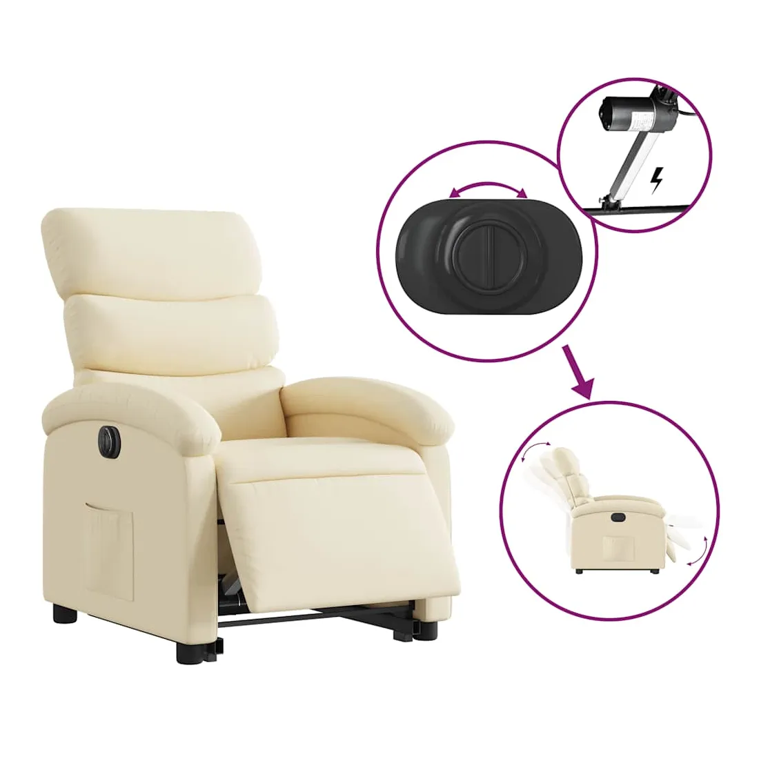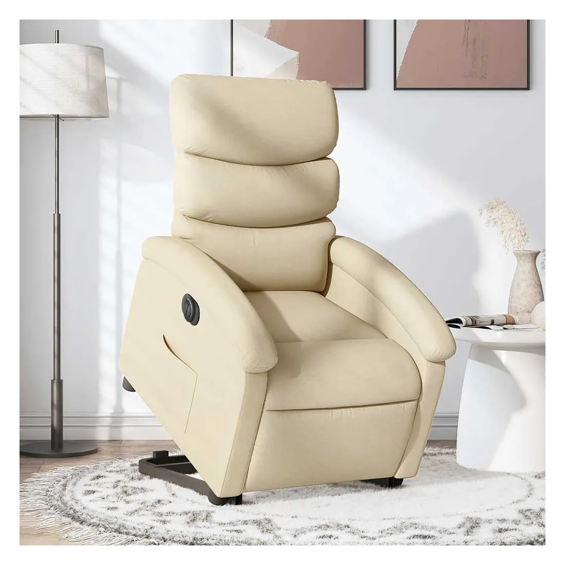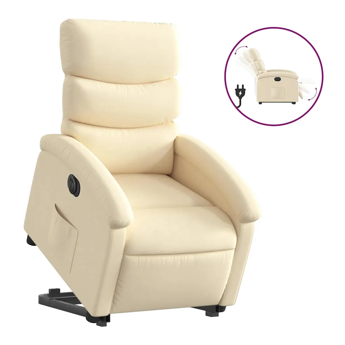 Asseyez-vous et détendez-vous dans ce fauteuil inclinable électrique très confortable ! Fonction de levage électrique : ce fauteuil inclinable pour personnes âgées est équipé d'un moteur électrique pour la fonction de levage. Grâce à la fonction qui pousse toute la chaise vers le haut, vous pouvez facilement vous tenir debout sans stresser votre dos et vos genoux en appuyant simplement sur le bouton.Fonction d'inclinaison électrique : ce fauteuil inclinable est également équipé d'un moteur électrique qui permet de régler automatiquement le repose-pied et le dossier dans n'importe quelle position, selon votre confort, en appuyant simplement sur le bouton situé sur le côté du fauteuil. Cette fonction permet une inclinaison maximale de 135 degrés. En outre, le dossier peut revenir automatiquement à sa position d'origine par une simple pression sur le bouton.Expérience d'assise confortable : le siège, le dossier et les larges accoudoirs bien rembourrés recouverts de tissu procurent une sensation confortable et chaleureuse, vous permettant de vous sentir enveloppé lorsque vous êtes assis. Le tissu présente un aspect simple et épuré et est respirant et durable.Poche latérale pratique : ce fauteuil est doté d'une poche latérale pour vous permettre de garder vos objets essentiels à portée de main.Cadre solide et stable : le cadre en bois et en métal offre une structure solide et une grande stabilité. Ce fauteuil inclinable est confortable et durable.