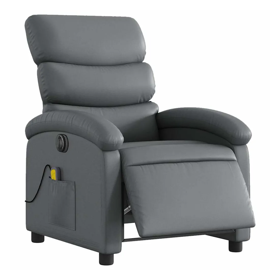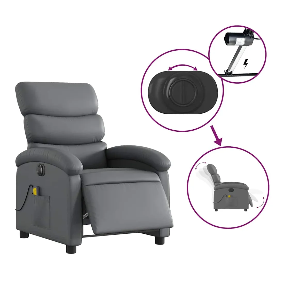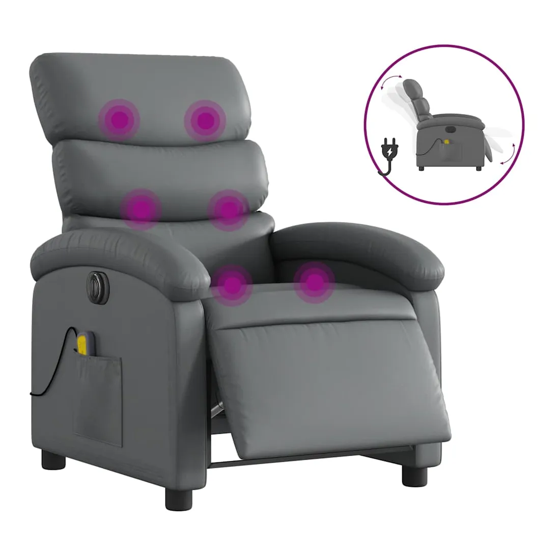 Asseyez-vous et détendez-vous dans ce fauteuil inclinable de massage électrique très confortable ! Fonction d'inclinaison électrique : ce fauteuil inclinable est équipé d'un moteur électrique qui permet de régler automatiquement le repose-pied et le dossier dans n'importe quelle position, selon votre confort, en appuyant simplement sur le bouton situé sur le côté du fauteuil. Cette fonction permet une inclinaison maximale de 135 degrés. En outre, le dossier peut revenir automatiquement à sa position d'origine par une simple pression sur le bouton.Fonction de vibration : les 6 points de massage vous permettent de faire l'expérience d'un massage mieux ciblé. De plus, la télécommande incluse vous permet de choisir différents programmes de massage. La fonction de massage est alimentée par le connecteur USB qui nécessite une source d'alimentation USB certifiée de 5 V (non fournie).Expérience de siège confortable : le siège, le dossier et les larges accoudoirs rembourrés épais recouverts de similicuir procurent une sensation confortable, vous faisant vous sentir enlacé lorsque vous êtes assis. Le similicuir est un matériau très résistant. Il est résistant aux taches, ce qui le rend facile à nettoyer avec un chiffon humide. La surface lisse donne également un aspect luxueux et la beauté du cuir véritable.Poche latérale pratique : ce fauteuil est doté d'une poche latérale pour ranger votre télécommande ou garder vos objets essentiels à portée de main.Cadre solide et stable : le cadre en bois et en métal offre une structure solide et une grande stabilité. Ce fauteuil inclinable est confortable et durable.