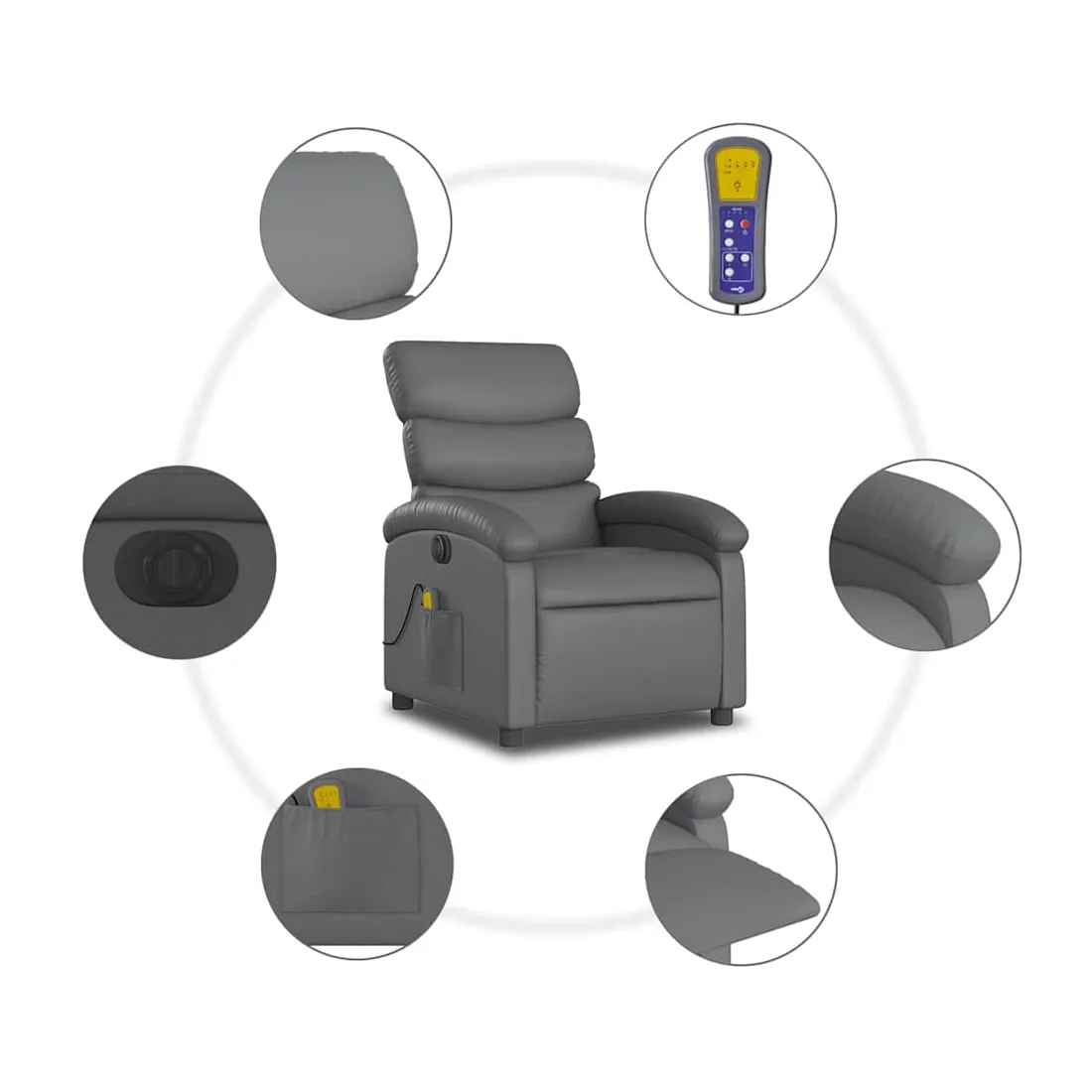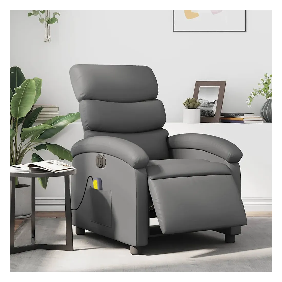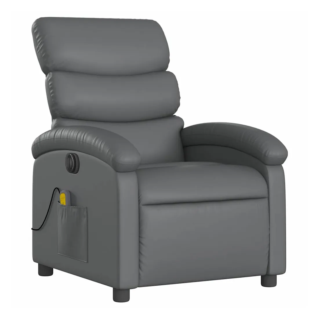 Asseyez-vous et détendez-vous dans ce fauteuil inclinable de massage électrique très confortable ! Fonction d'inclinaison électrique : ce fauteuil inclinable est équipé d'un moteur électrique qui permet de régler automatiquement le repose-pied et le dossier dans n'importe quelle position, selon votre confort, en appuyant simplement sur le bouton situé sur le côté du fauteuil. Cette fonction permet une inclinaison maximale de 135 degrés. En outre, le dossier peut revenir automatiquement à sa position d'origine par une simple pression sur le bouton.Fonction de vibration : les 6 points de massage vous permettent de faire l'expérience d'un massage mieux ciblé. De plus, la télécommande incluse vous permet de choisir différents programmes de massage. La fonction de massage est alimentée par le connecteur USB qui nécessite une source d'alimentation USB certifiée de 5 V (non fournie).Expérience de siège confortable : le siège, le dossier et les larges accoudoirs rembourrés épais recouverts de similicuir procurent une sensation confortable, vous faisant vous sentir enlacé lorsque vous êtes assis. Le similicuir est un matériau très résistant. Il est résistant aux taches, ce qui le rend facile à nettoyer avec un chiffon humide. La surface lisse donne également un aspect luxueux et la beauté du cuir véritable.Poche latérale pratique : ce fauteuil est doté d'une poche latérale pour ranger votre télécommande ou garder vos objets essentiels à portée de main.Cadre solide et stable : le cadre en bois et en métal offre une structure solide et une grande stabilité. Ce fauteuil inclinable est confortable et durable.