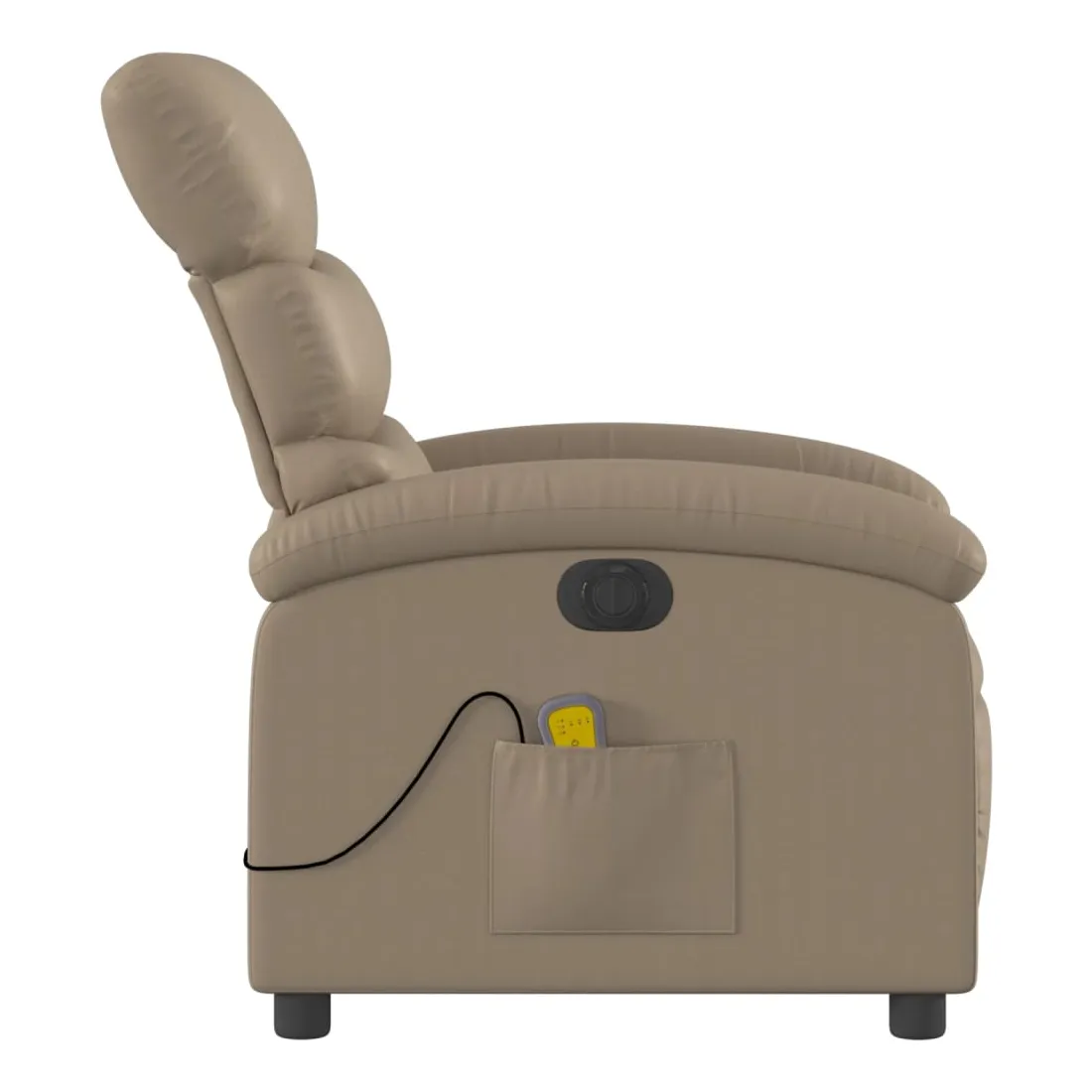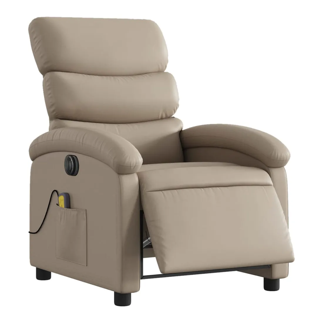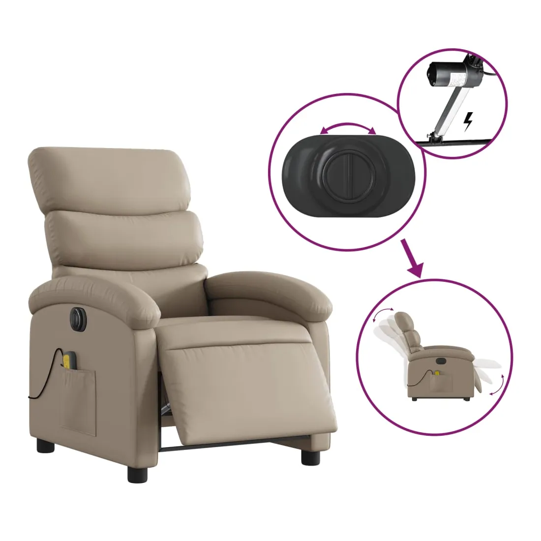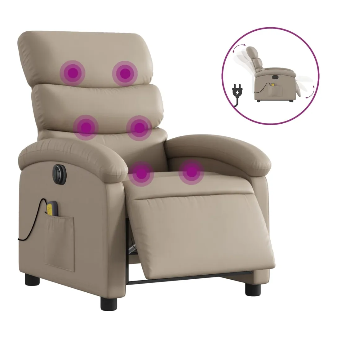 Asseyez-vous et détendez-vous dans ce fauteuil inclinable de massage électrique très confortable ! Fonction d'inclinaison électrique : ce fauteuil inclinable est équipé d'un moteur électrique qui permet de régler automatiquement le repose-pied et le dossier dans n'importe quelle position, selon votre confort, en appuyant simplement sur le bouton situé sur le côté du fauteuil. Cette fonction permet une inclinaison maximale de 135 degrés. En outre, le dossier peut revenir automatiquement à sa position d'origine par une simple pression sur le bouton.Fonction de vibration : les 6 points de massage vous permettent de faire l'expérience d'un massage mieux ciblé. De plus, la télécommande incluse vous permet de choisir différents programmes de massage. La fonction de massage est alimentée par le connecteur USB qui nécessite une source d'alimentation USB certifiée de 5 V (non fournie).Expérience de siège confortable : le siège, le dossier et les larges accoudoirs rembourrés épais recouverts de similicuir procurent une sensation confortable, vous faisant vous sentir enlacé lorsque vous êtes assis. Le similicuir est un matériau très résistant. Il est résistant aux taches, ce qui le rend facile à nettoyer avec un chiffon humide. La surface lisse donne également un aspect luxueux et la beauté du cuir véritable.Poche latérale pratique : ce fauteuil est doté d'une poche latérale pour ranger votre télécommande ou garder vos objets essentiels à portée de main.Cadre solide et stable : le cadre en bois et en métal offre une structure solide et une grande stabilité. Ce fauteuil inclinable est confortable et durable.