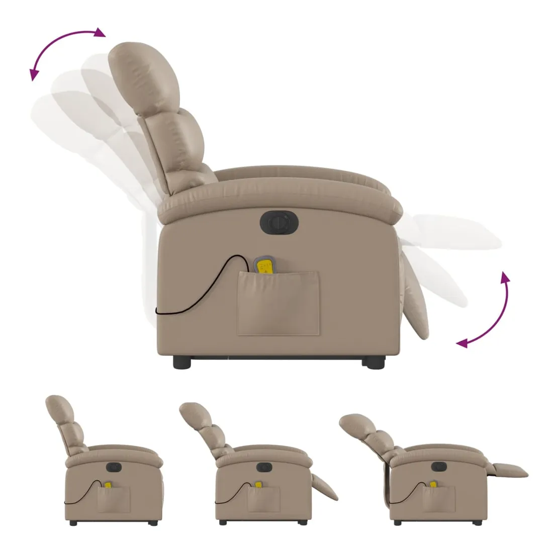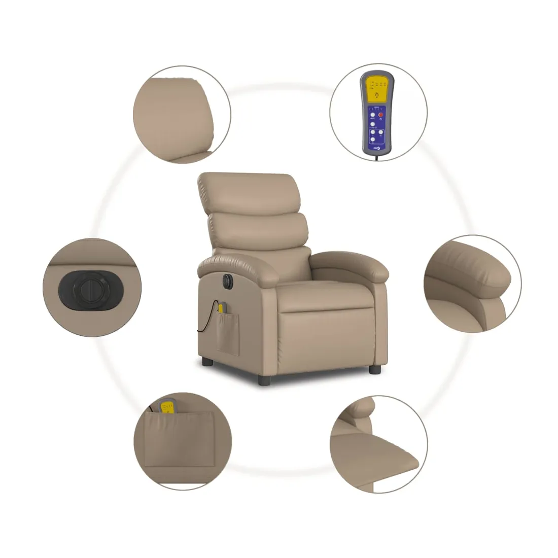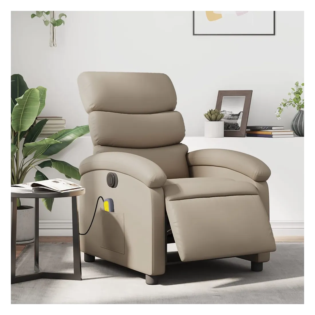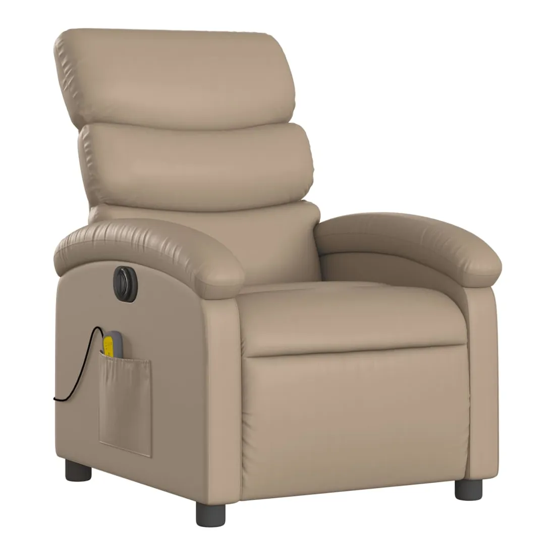 Asseyez-vous et détendez-vous dans ce fauteuil inclinable de massage électrique très confortable ! Fonction d'inclinaison électrique : ce fauteuil inclinable est équipé d'un moteur électrique qui permet de régler automatiquement le repose-pied et le dossier dans n'importe quelle position, selon votre confort, en appuyant simplement sur le bouton situé sur le côté du fauteuil. Cette fonction permet une inclinaison maximale de 135 degrés. En outre, le dossier peut revenir automatiquement à sa position d'origine par une simple pression sur le bouton.Fonction de vibration : les 6 points de massage vous permettent de faire l'expérience d'un massage mieux ciblé. De plus, la télécommande incluse vous permet de choisir différents programmes de massage. La fonction de massage est alimentée par le connecteur USB qui nécessite une source d'alimentation USB certifiée de 5 V (non fournie).Expérience de siège confortable : le siège, le dossier et les larges accoudoirs rembourrés épais recouverts de similicuir procurent une sensation confortable, vous faisant vous sentir enlacé lorsque vous êtes assis. Le similicuir est un matériau très résistant. Il est résistant aux taches, ce qui le rend facile à nettoyer avec un chiffon humide. La surface lisse donne également un aspect luxueux et la beauté du cuir véritable.Poche latérale pratique : ce fauteuil est doté d'une poche latérale pour ranger votre télécommande ou garder vos objets essentiels à portée de main.Cadre solide et stable : le cadre en bois et en métal offre une structure solide et une grande stabilité. Ce fauteuil inclinable est confortable et durable.