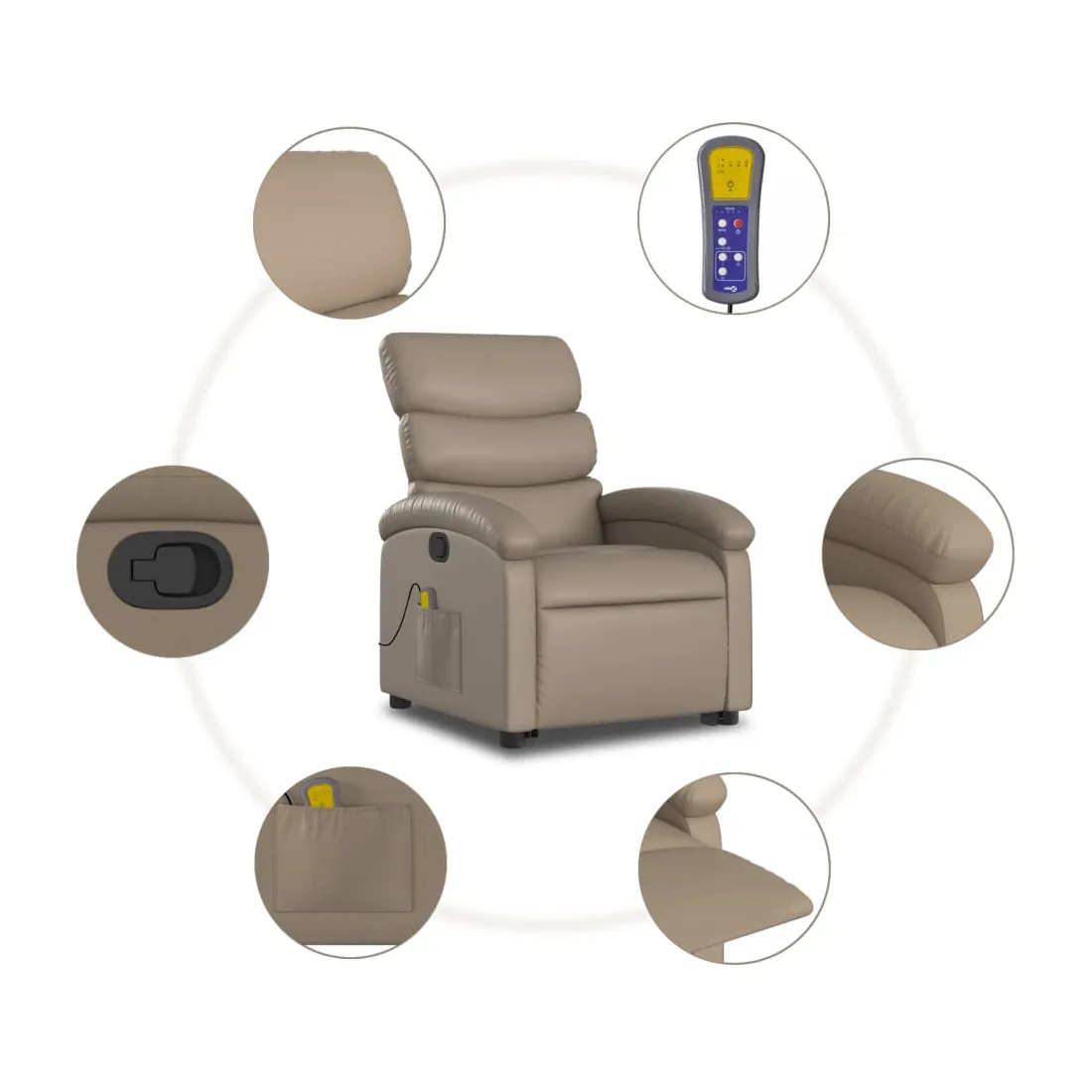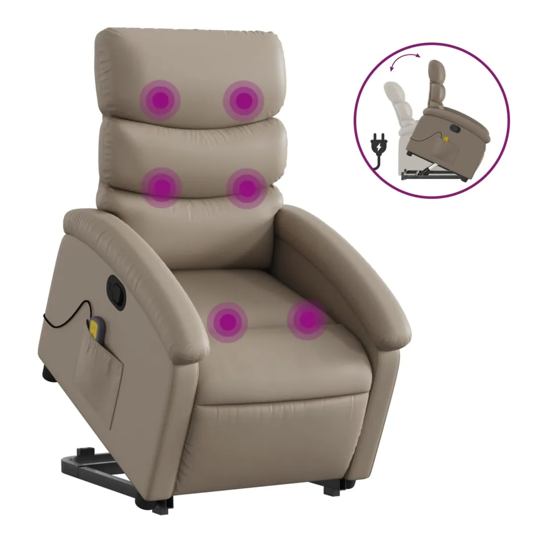 Asseyez-vous et détendez-vous dans ce fauteuil inclinable de massage très confortable ! Fonction de levage électrique : ce fauteuil inclinable pour personnes âgées est équipé d'un moteur électrique pour la fonction de levage. Grâce à la fonction qui pousse toute la chaise vers le haut, vous pouvez facilement vous tenir debout sans stresser votre dos et vos genoux en appuyant simplement sur le bouton.Fonction d'inclinaison manuelle : ce fauteuil inclinable est doté d'une poignée du côté droit. Vous pouvez régler manuellement le repose-pieds et le dossier dans n'importe quelle position selon votre confort en tirant simplement sur la poignée. Cette fonction permet une inclinaison maximale de 135 degrés. De plus, le dossier peut revenir rapidement à sa position d'origine en tirant simplement sur la poignée.Fonction de vibration : les 6 points de massage vous permettent de faire l'expérience d'un massage mieux ciblé. De plus, la télécommande incluse vous permet de choisir différents programmes de massage. La fonction de massage est alimentée par le connecteur USB qui nécessite une source d'alimentation USB certifiée de 5 V (non fournie).Expérience de siège confortable : le siège, le dossier et les larges accoudoirs rembourrés épais recouverts de similicuir procurent une sensation confortable, vous faisant vous sentir enlacé lorsque vous êtes assis. Le similicuir est un matériau très résistant. Il est résistant aux taches, ce qui le rend facile à nettoyer avec un chiffon humide. La surface lisse donne également un aspect luxueux et la beauté du cuir véritable.Poche latérale pratique : ce fauteuil est doté d'une poche latérale pour ranger votre télécommande ou garder vos objets essentiels à portée de main.Cadre solide et stable : le cadre en bois et en métal offre une structure solide et une grande stabilité. Ce fauteuil inclinable est confortable et durable.