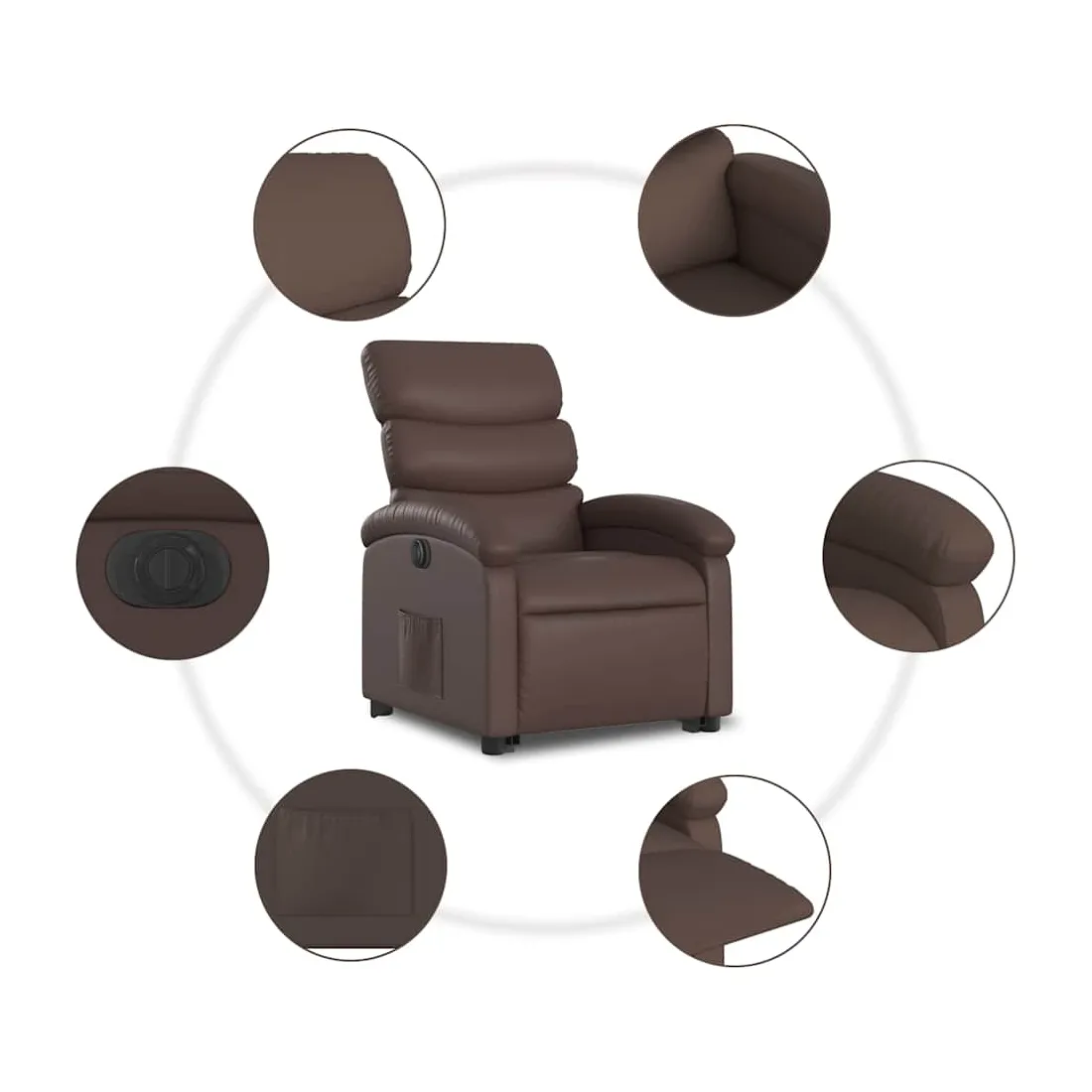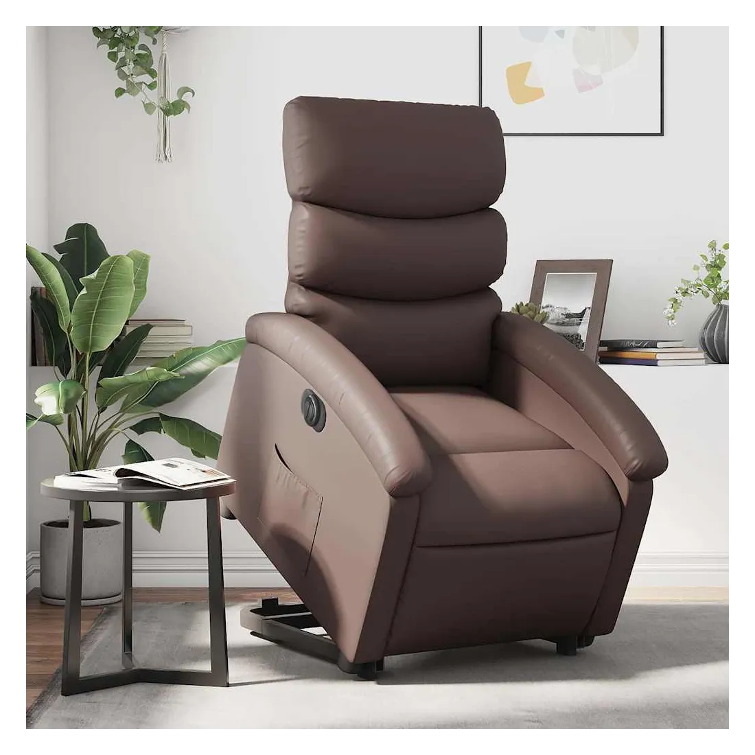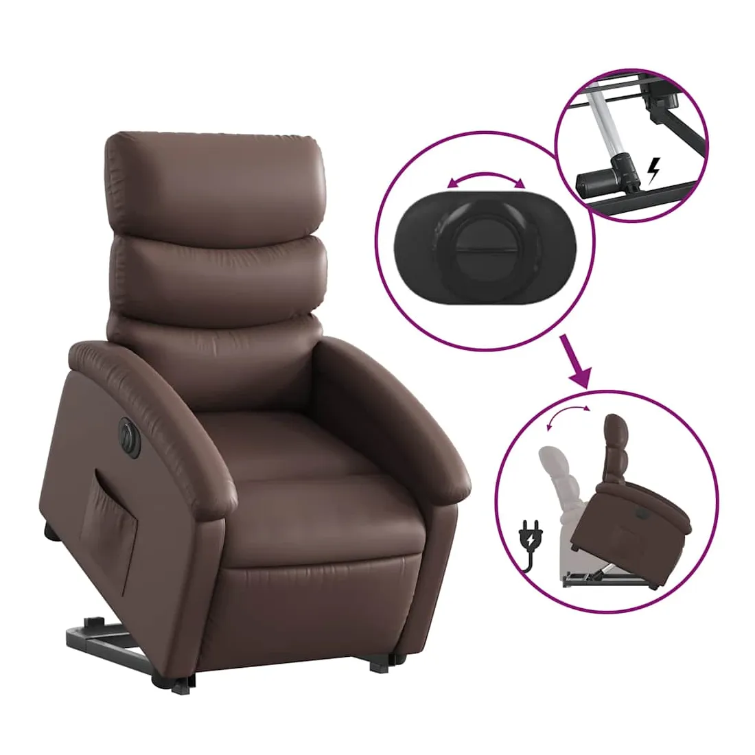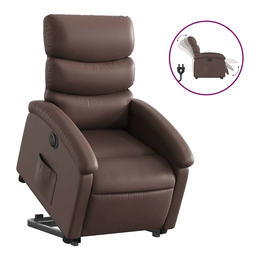 Asseyez-vous et détendez-vous dans ce fauteuil inclinable électrique très confortable ! Fonction de levage électrique : ce fauteuil inclinable pour personnes âgées est équipé d'un moteur électrique pour la fonction de levage. Grâce à la fonction qui pousse toute la chaise vers le haut, vous pouvez facilement vous tenir debout sans stresser votre dos et vos genoux en appuyant simplement sur le bouton.Fonction d'inclinaison électrique : ce fauteuil inclinable est également équipé d'un moteur électrique qui permet de régler automatiquement le repose-pied et le dossier dans n'importe quelle position, selon votre confort, en appuyant simplement sur le bouton situé sur le côté du fauteuil. Cette fonction permet une inclinaison maximale de 135 degrés. En outre, le dossier peut revenir automatiquement à sa position d'origine par une simple pression sur le bouton.Expérience de siège confortable : le siège, le dossier et les larges accoudoirs rembourrés épais recouverts de similicuir procurent une sensation confortable, vous faisant vous sentir enlacé lorsque vous êtes assis. Le similicuir est un matériau très résistant. Il est résistant aux taches, ce qui le rend facile à nettoyer avec un chiffon humide. La surface lisse donne également un aspect luxueux et la beauté du cuir véritable.Poche latérale pratique : ce fauteuil est doté d'une poche latérale pour vous permettre de garder vos objets essentiels à portée de main.Cadre solide et stable : le cadre en bois et en métal offre une structure solide et une grande stabilité. Ce fauteuil inclinable est confortable et durable.