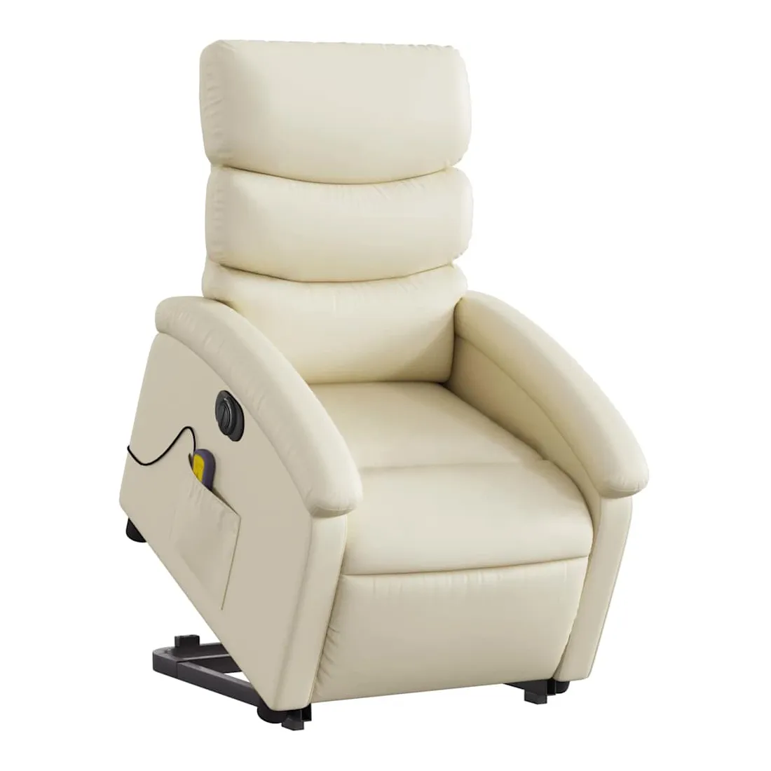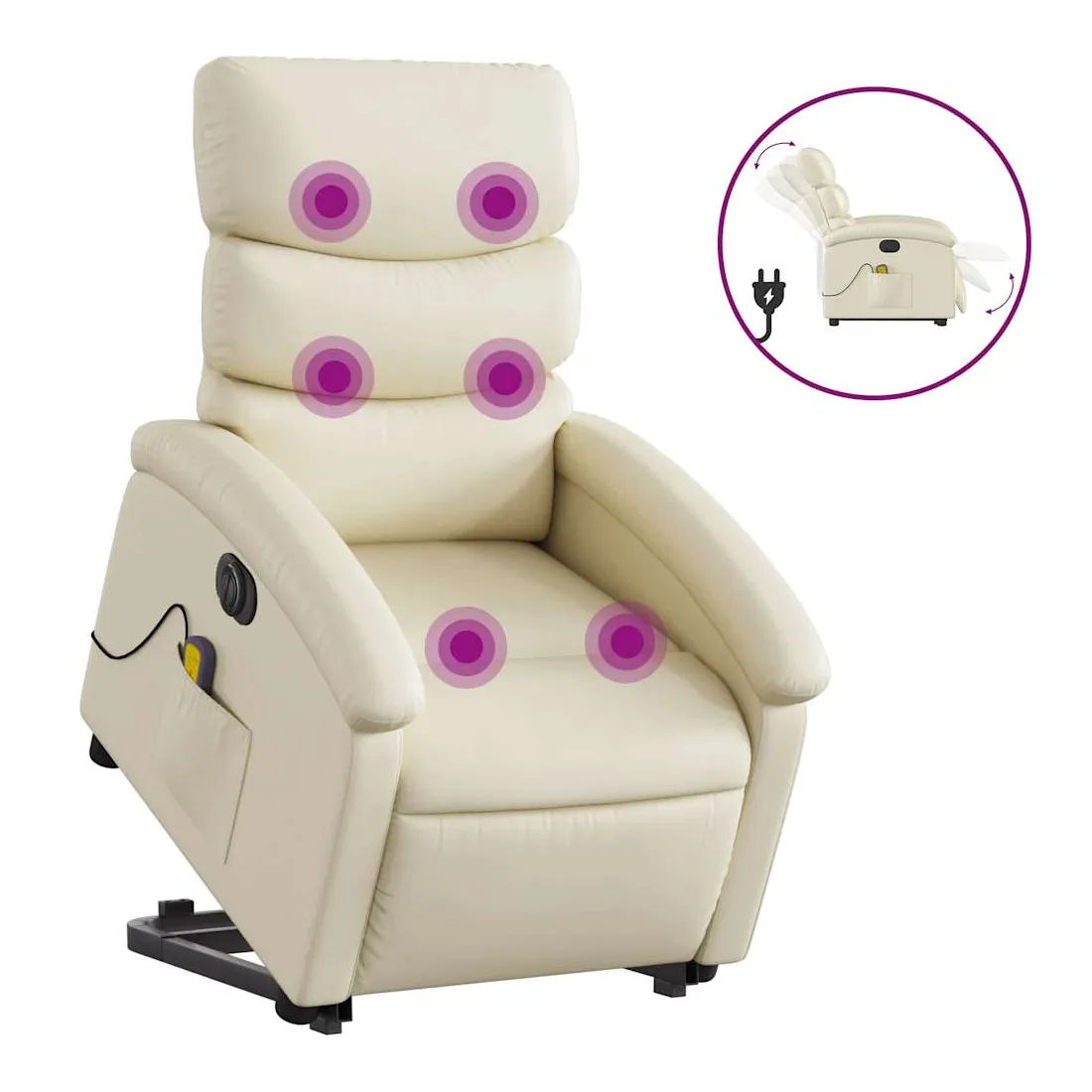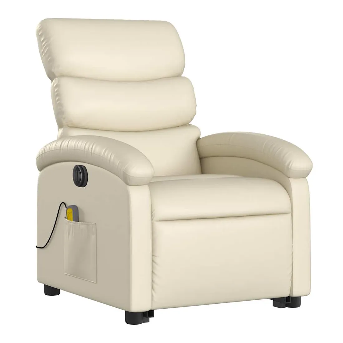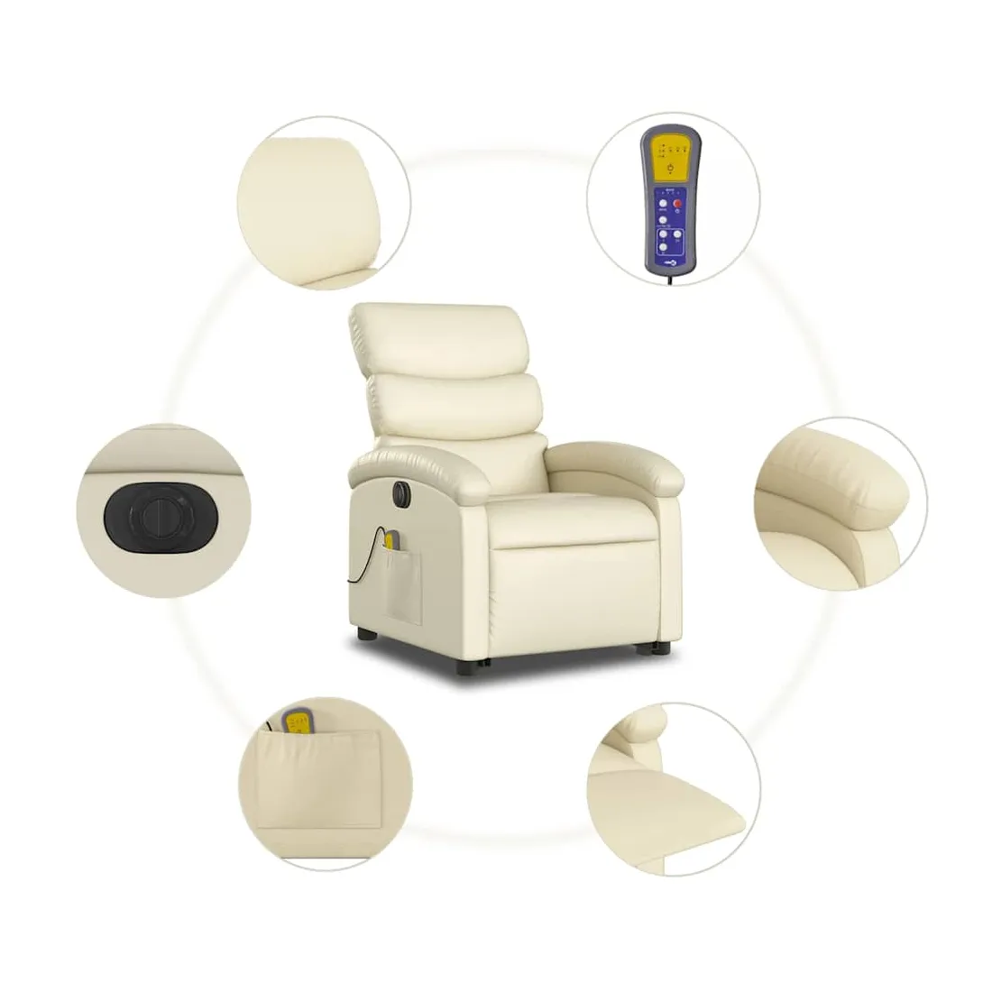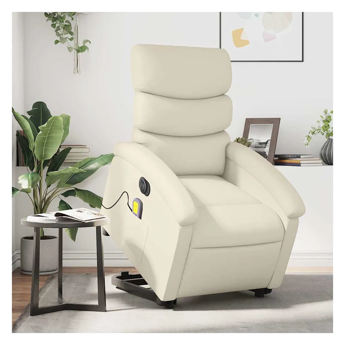 Asseyez-vous et détendez-vous dans ce fauteuil inclinable de massage électrique très confortable ! Fonction de levage électrique : ce fauteuil inclinable pour personnes âgées est équipé d'un moteur électrique pour la fonction de levage. Grâce à la fonction qui pousse toute la chaise vers le haut, vous pouvez facilement vous tenir debout sans stresser votre dos et vos genoux en appuyant simplement sur le bouton.Fonction d'inclinaison électrique : ce fauteuil inclinable est également équipé d'un moteur électrique qui permet de régler automatiquement le repose-pied et le dossier dans n'importe quelle position, selon votre confort, en appuyant simplement sur le bouton situé sur le côté du fauteuil. Cette fonction permet une inclinaison maximale de 135 degrés. En outre, le dossier peut revenir automatiquement à sa position d'origine par une simple pression sur le bouton.Fonction de vibration : les 6 points de massage vous permettent de faire l'expérience d'un massage mieux ciblé. De plus, la télécommande incluse vous permet de choisir différents programmes de massage. La fonction de massage est alimentée par le connecteur USB qui nécessite une source d'alimentation USB certifiée de 5 V (non fournie).Expérience de siège confortable : le siège, le dossier et les larges accoudoirs rembourrés épais recouverts de similicuir procurent une sensation confortable, vous faisant vous sentir enlacé lorsque vous êtes assis. Le similicuir est un matériau très résistant. Il est résistant aux taches, ce qui le rend facile à nettoyer avec un chiffon humide. La surface lisse donne également un aspect luxueux et la beauté du cuir véritable.Poche latérale pratique : ce fauteuil est doté d'une poche latérale pour ranger votre télécommande ou garder vos objets essentiels à portée de main.Cadre solide et stable : le cadre en bois et en métal offre une structure solide et une grande stabilité. Ce fauteuil inclinable est confortable et durable.