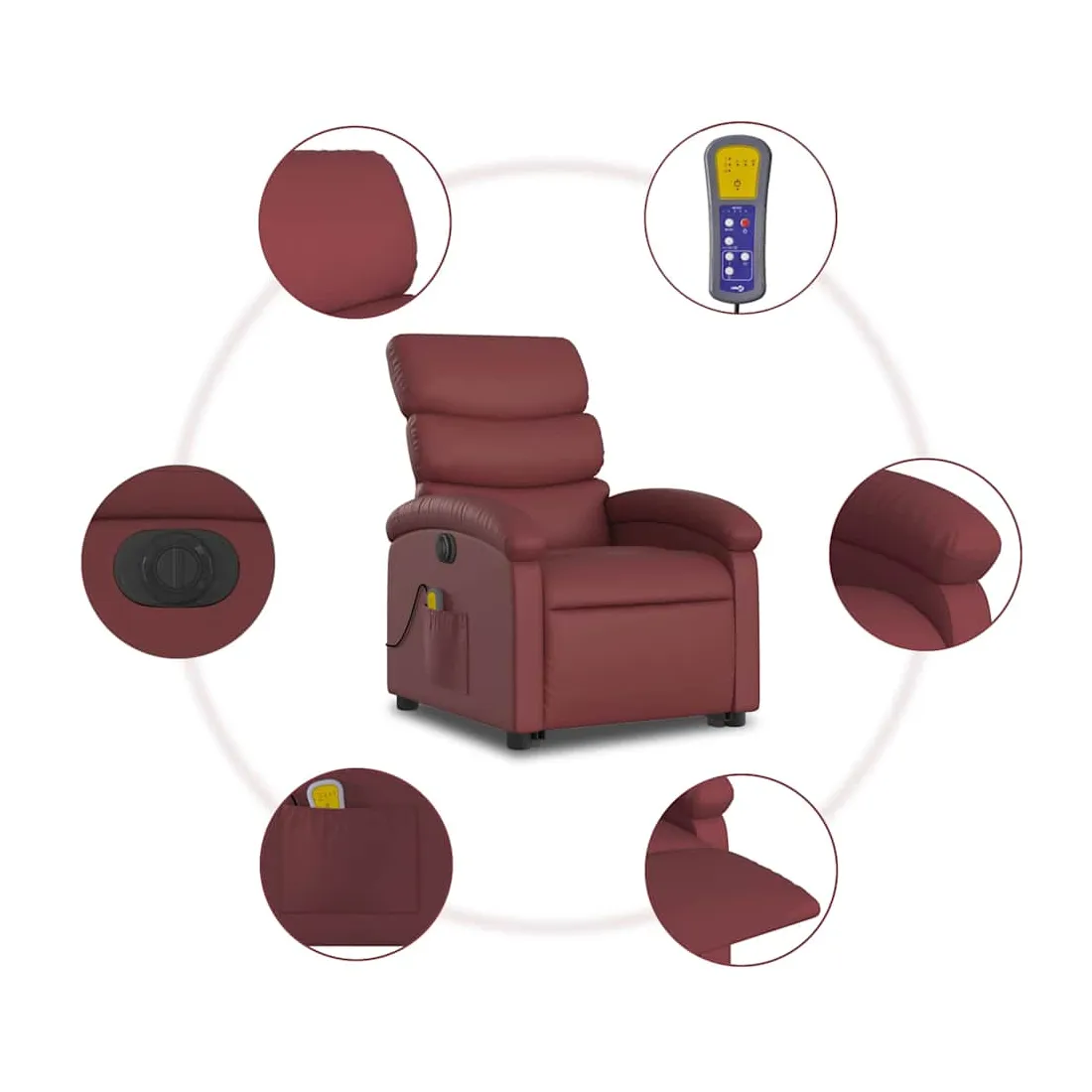 Asseyez-vous et détendez-vous dans ce fauteuil inclinable de massage électrique très confortable ! Fonction de levage électrique : ce fauteuil inclinable pour personnes âgées est équipé d'un moteur électrique pour la fonction de levage. Grâce à la fonction qui pousse toute la chaise vers le haut, vous pouvez facilement vous tenir debout sans stresser votre dos et vos genoux en appuyant simplement sur le bouton.Fonction d'inclinaison électrique : ce fauteuil inclinable est également équipé d'un moteur électrique qui permet de régler automatiquement le repose-pied et le dossier dans n'importe quelle position, selon votre confort, en appuyant simplement sur le bouton situé sur le côté du fauteuil. Cette fonction permet une inclinaison maximale de 135 degrés. En outre, le dossier peut revenir automatiquement à sa position d'origine par une simple pression sur le bouton.Fonction de vibration : les 6 points de massage vous permettent de faire l'expérience d'un massage mieux ciblé. De plus, la télécommande incluse vous permet de choisir différents programmes de massage. La fonction de massage est alimentée par le connecteur USB qui nécessite une source d'alimentation USB certifiée de 5 V (non fournie).Expérience de siège confortable : le siège, le dossier et les larges accoudoirs rembourrés épais recouverts de similicuir procurent une sensation confortable, vous faisant vous sentir enlacé lorsque vous êtes assis. Le similicuir est un matériau très résistant. Il est résistant aux taches, ce qui le rend facile à nettoyer avec un chiffon humide. La surface lisse donne également un aspect luxueux et la beauté du cuir véritable.Poche latérale pratique : ce fauteuil est doté d'une poche latérale pour ranger votre télécommande ou garder vos objets essentiels à portée de main.Cadre solide et stable : le cadre en bois et en métal offre une structure solide et une grande stabilité. Ce fauteuil inclinable est confortable et durable.