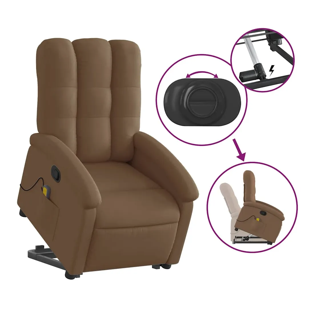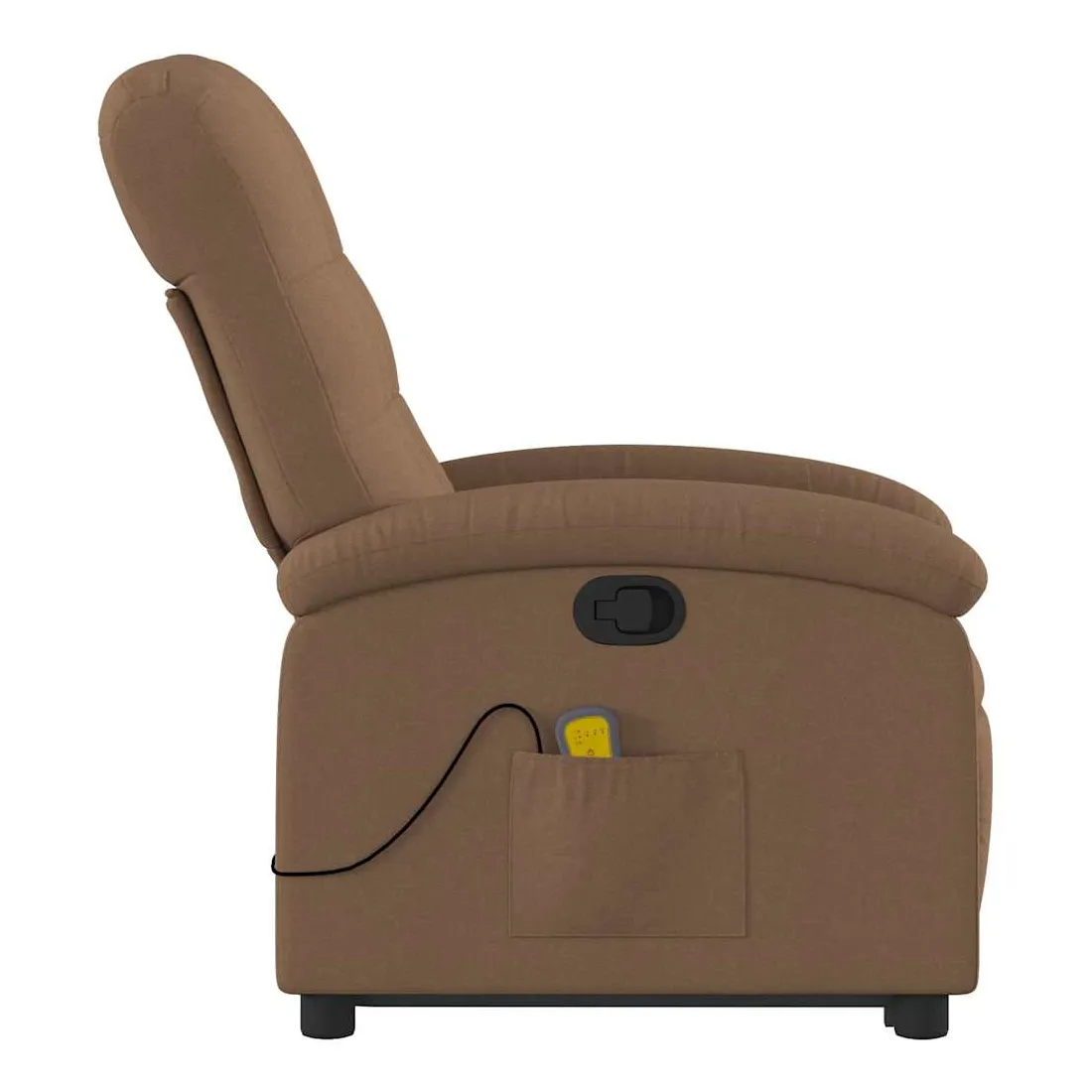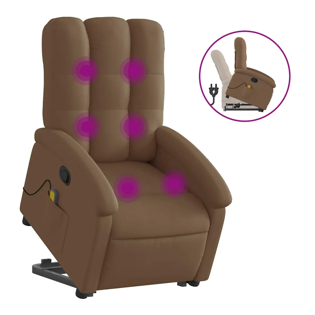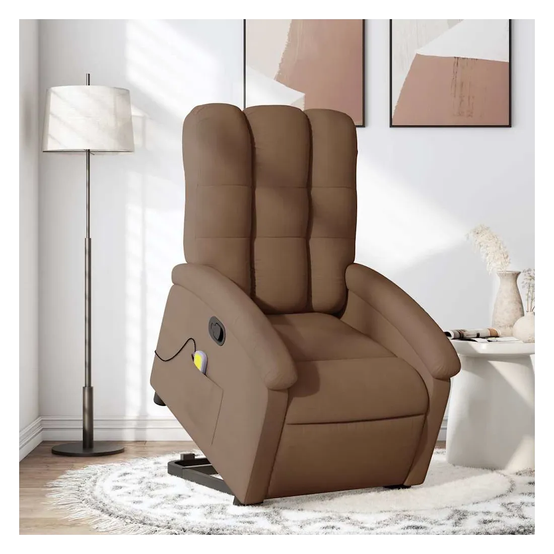 Asseyez-vous et détendez-vous dans ce fauteuil inclinable de massage très confortable ! Fonction de levage électrique : ce fauteuil inclinable pour personnes âgées est équipé d'un moteur électrique pour la fonction de levage. Grâce à la fonction qui pousse toute la chaise vers le haut, vous pouvez facilement vous tenir debout sans stresser votre dos et vos genoux en appuyant simplement sur le bouton.Fonction d'inclinaison manuelle : ce fauteuil inclinable est doté d'une poignée du côté droit. Vous pouvez régler manuellement le repose-pieds et le dossier dans n'importe quelle position selon votre confort en tirant simplement sur la poignée. Cette fonction permet une inclinaison maximale de 135 degrés. De plus, le dossier peut revenir rapidement à sa position d'origine en tirant simplement sur la poignée.Fonction de vibration : les 6 points de massage vous permettent de faire l'expérience d'un massage mieux ciblé. De plus, la télécommande incluse vous permet de choisir différents programmes de massage. La fonction de massage est alimentée par le connecteur USB qui nécessite une source d'alimentation USB certifiée de 5 V (non fournie).Expérience d'assise confortable : le siège, le dossier et les larges accoudoirs bien rembourrés recouverts de tissu procurent une sensation confortable et chaleureuse, vous permettant de vous sentir enveloppé lorsque vous êtes assis. Le tissu présente un aspect simple et épuré et est respirant et durable.Poche latérale pratique : ce fauteuil est doté d'une poche latérale pour ranger votre télécommande ou garder vos objets essentiels à portée de main.Cadre solide et stable : le cadre en bois et en métal offre une structure solide et une grande stabilité. Ce fauteuil inclinable est confortable et durable.