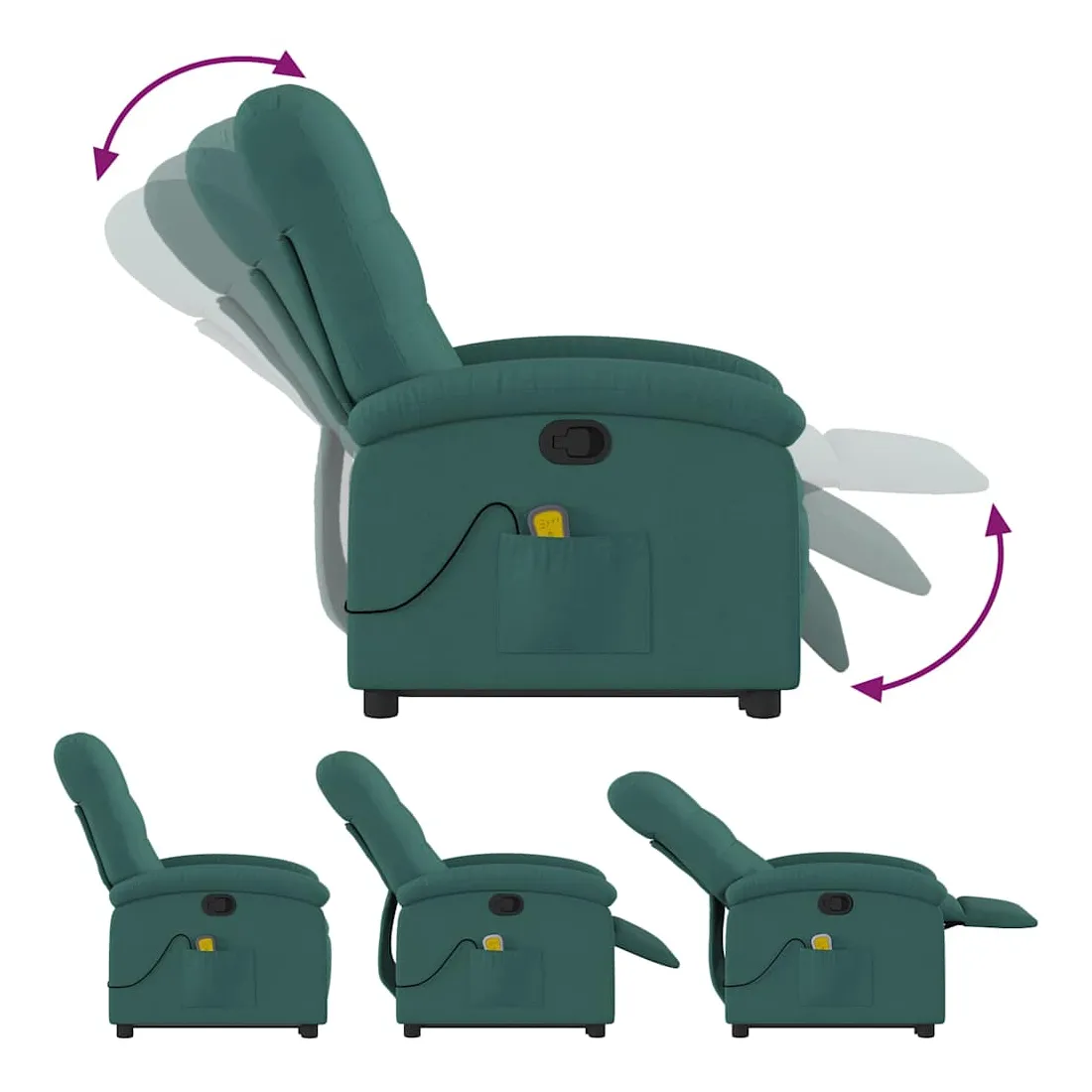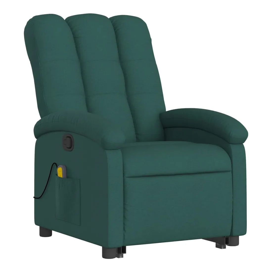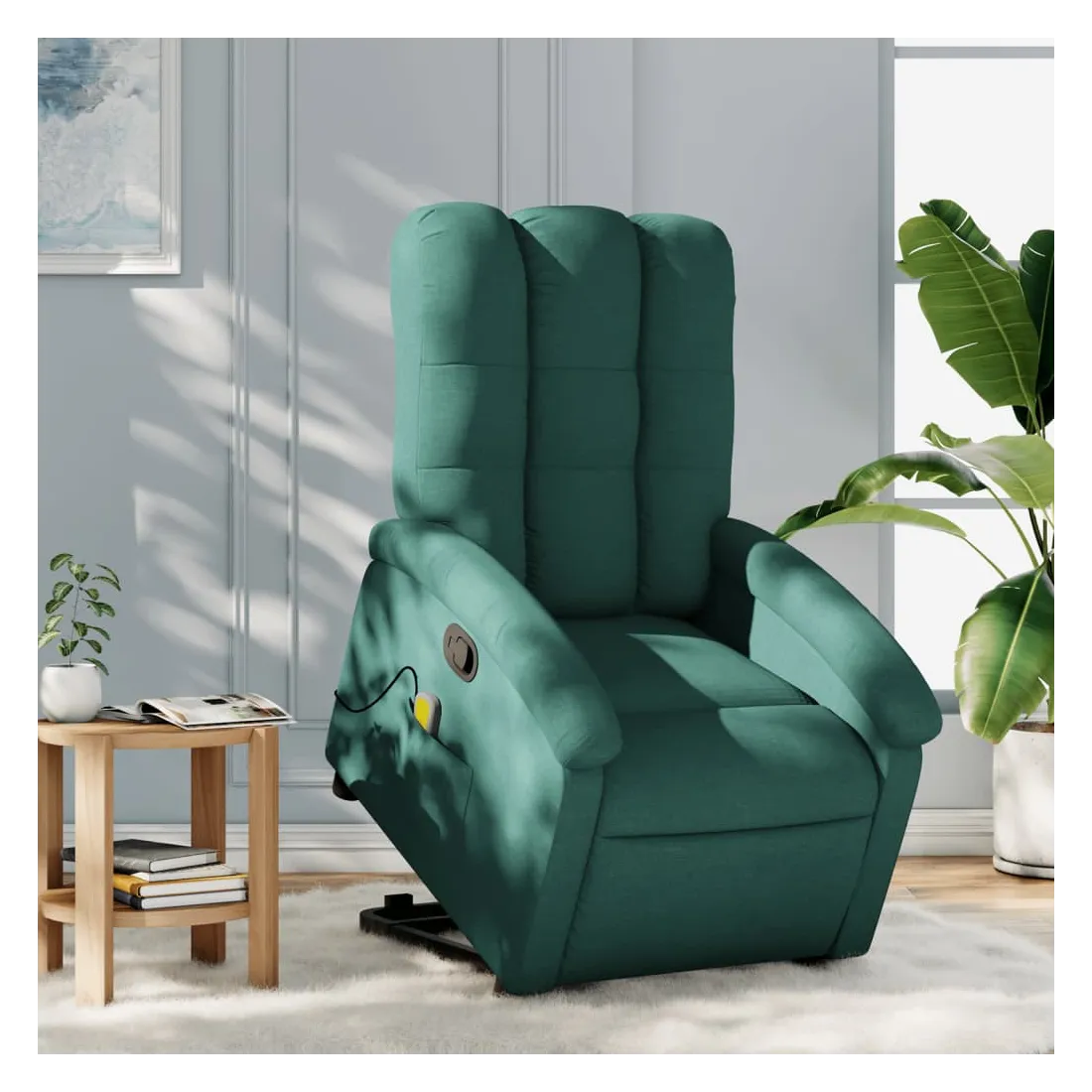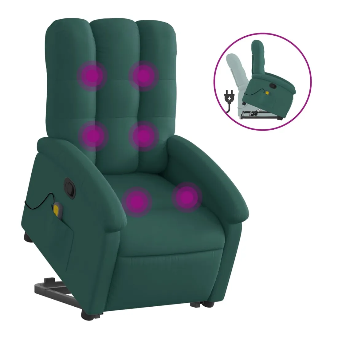 Asseyez-vous et détendez-vous dans ce fauteuil inclinable de massage très confortable ! Fonction de levage électrique : ce fauteuil inclinable pour personnes âgées est équipé d'un moteur électrique pour la fonction de levage. Grâce à la fonction qui pousse toute la chaise vers le haut, vous pouvez facilement vous tenir debout sans stresser votre dos et vos genoux en appuyant simplement sur le bouton.Fonction d'inclinaison manuelle : ce fauteuil inclinable est doté d'une poignée du côté droit. Vous pouvez régler manuellement le repose-pieds et le dossier dans n'importe quelle position selon votre confort en tirant simplement sur la poignée. Cette fonction permet une inclinaison maximale de 135 degrés. De plus, le dossier peut revenir rapidement à sa position d'origine en tirant simplement sur la poignée.Fonction de vibration : les 6 points de massage vous permettent de faire l'expérience d'un massage mieux ciblé. De plus, la télécommande incluse vous permet de choisir différents programmes de massage. La fonction de massage est alimentée par le connecteur USB qui nécessite une source d'alimentation USB certifiée de 5 V (non fournie).Expérience d'assise confortable : le siège, le dossier et les larges accoudoirs bien rembourrés recouverts de tissu procurent une sensation confortable et chaleureuse, vous permettant de vous sentir enveloppé lorsque vous êtes assis. Le tissu présente un aspect simple et épuré et est respirant et durable.Poche latérale pratique : ce fauteuil est doté d'une poche latérale pour ranger votre télécommande ou garder vos objets essentiels à portée de main.Cadre solide et stable : le cadre en bois et en métal offre une structure solide et une grande stabilité. Ce fauteuil inclinable est confortable et durable.