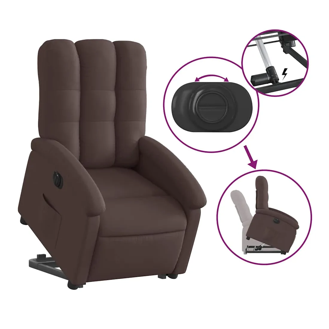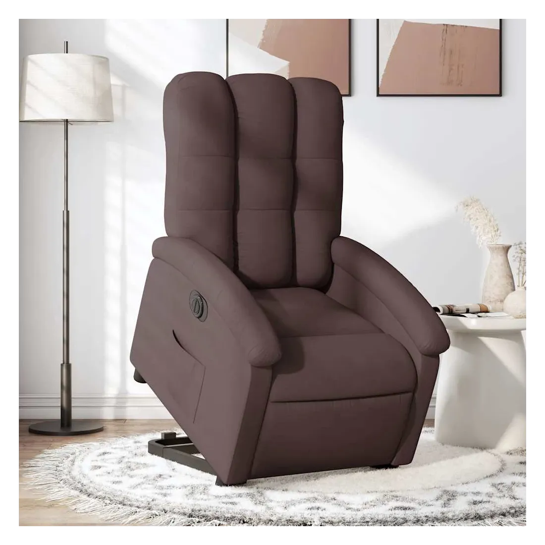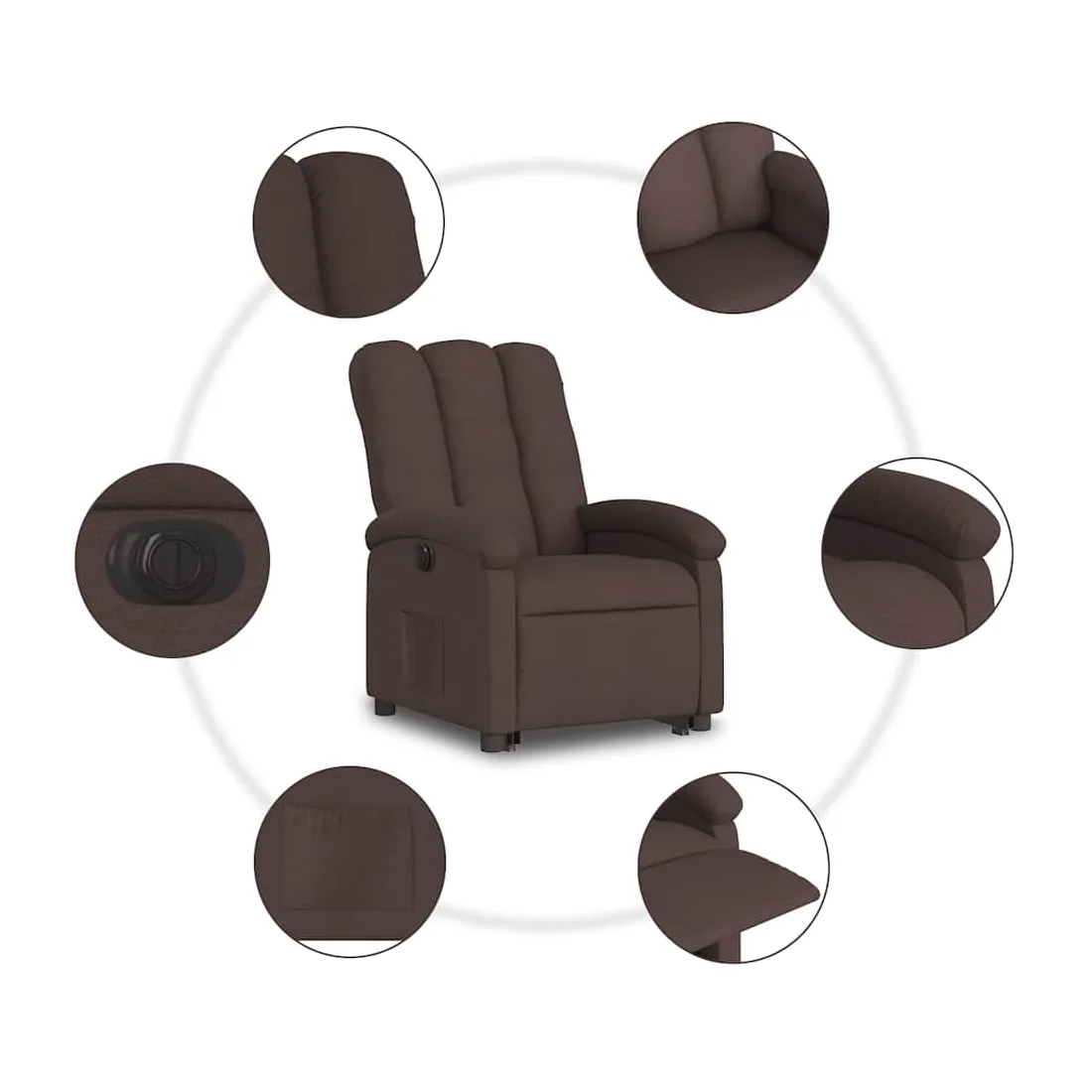 Asseyez-vous et détendez-vous dans ce fauteuil inclinable électrique très confortable ! Fonction de levage électrique : ce fauteuil inclinable pour personnes âgées est équipé d'un moteur électrique pour la fonction de levage. Grâce à la fonction qui pousse toute la chaise vers le haut, vous pouvez facilement vous tenir debout sans stresser votre dos et vos genoux en appuyant simplement sur le bouton.Fonction d'inclinaison électrique : ce fauteuil inclinable est également équipé d'un moteur électrique qui permet de régler automatiquement le repose-pied et le dossier dans n'importe quelle position, selon votre confort, en appuyant simplement sur le bouton situé sur le côté du fauteuil. Cette fonction permet une inclinaison maximale de 135 degrés. En outre, le dossier peut revenir automatiquement à sa position d'origine par une simple pression sur le bouton.Expérience d'assise confortable : le siège, le dossier et les larges accoudoirs bien rembourrés recouverts de tissu procurent une sensation confortable et chaleureuse, vous permettant de vous sentir enveloppé lorsque vous êtes assis. Le tissu présente un aspect simple et épuré et est respirant et durable.Poche latérale pratique : ce fauteuil est doté d'une poche latérale pour vous permettre de garder vos objets essentiels à portée de main.Cadre solide et stable : le cadre en bois et en métal offre une structure solide et une grande stabilité. Ce fauteuil inclinable est confortable et durable.