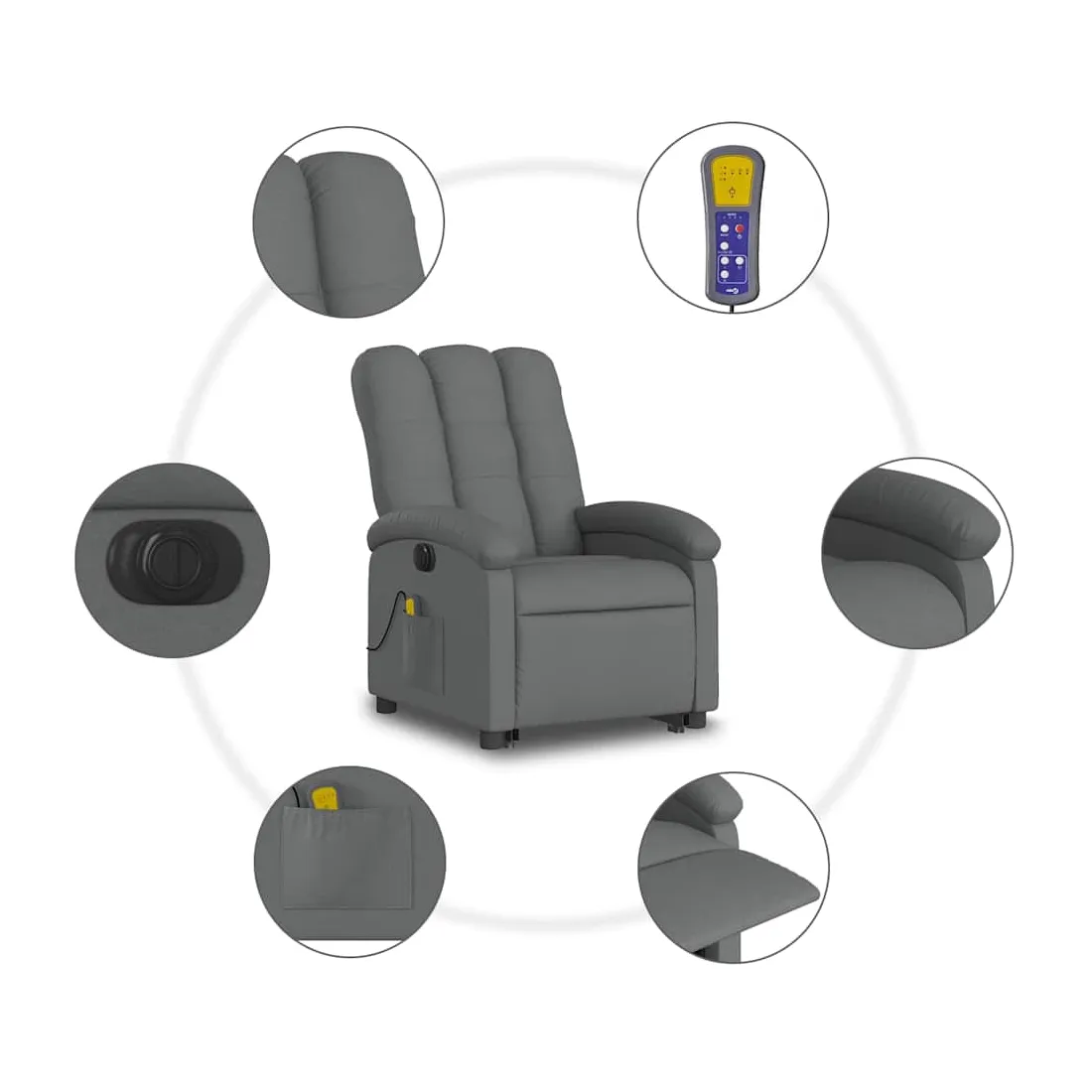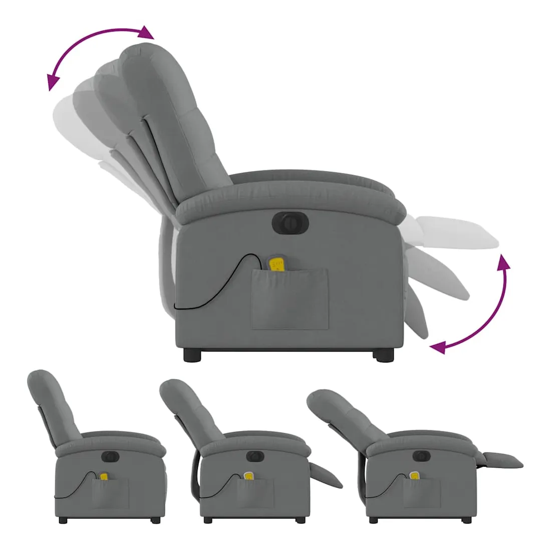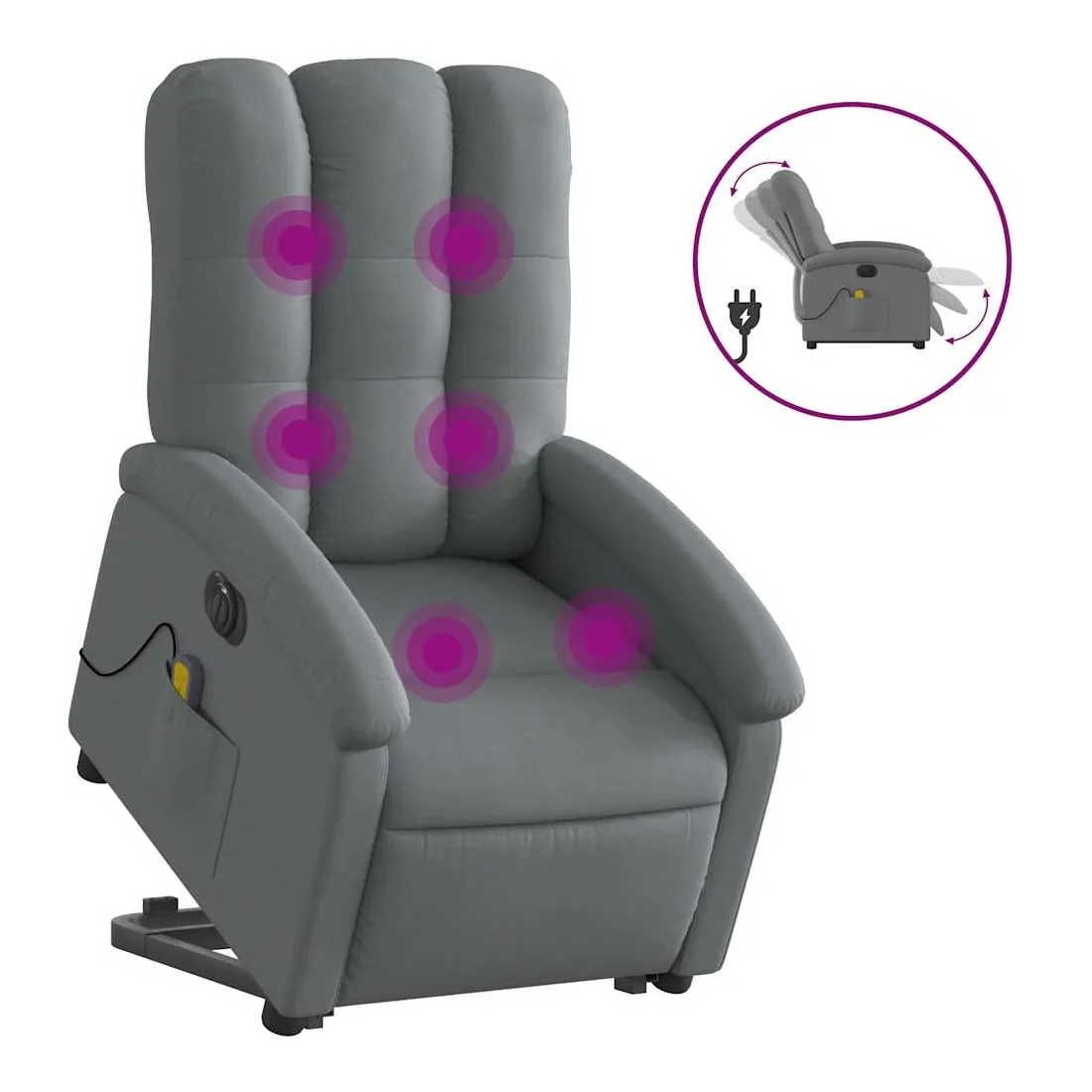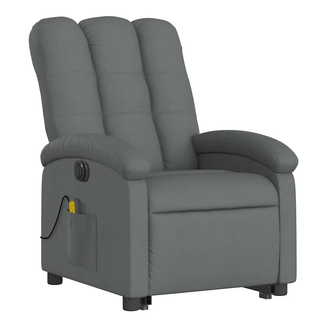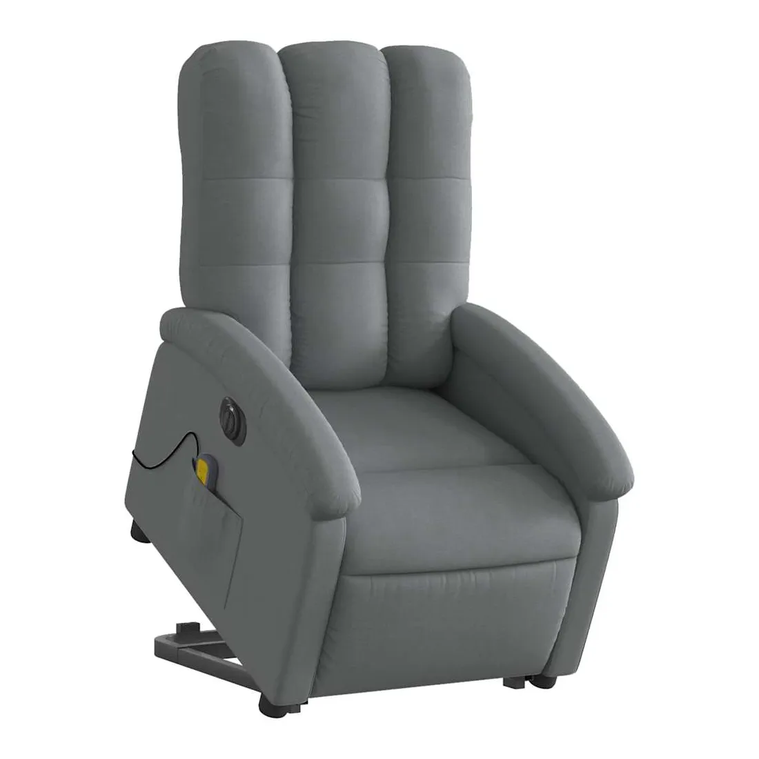 Asseyez-vous et détendez-vous dans ce fauteuil inclinable de massage électrique très confortable ! Fonction de levage électrique : ce fauteuil inclinable pour personnes âgées est équipé d'un moteur électrique pour la fonction de levage. Grâce à la fonction qui pousse toute la chaise vers le haut, vous pouvez facilement vous tenir debout sans stresser votre dos et vos genoux en appuyant simplement sur le bouton.Fonction d'inclinaison électrique : ce fauteuil inclinable est également équipé d'un moteur électrique qui permet de régler automatiquement le repose-pied et le dossier dans n'importe quelle position, selon votre confort, en appuyant simplement sur le bouton situé sur le côté du fauteuil. Cette fonction permet une inclinaison maximale de 135 degrés. En outre, le dossier peut revenir automatiquement à sa position d'origine par une simple pression sur le bouton.Fonction de vibration : les 6 points de massage vous permettent de faire l'expérience d'un massage mieux ciblé. De plus, la télécommande incluse vous permet de choisir différents programmes de massage. La fonction de massage est alimentée par le connecteur USB qui nécessite une source d'alimentation USB certifiée de 5 V (non fournie).Expérience d'assise confortable : le siège, le dossier et les larges accoudoirs bien rembourrés recouverts de tissu procurent une sensation confortable et chaleureuse, vous permettant de vous sentir enveloppé lorsque vous êtes assis. Le tissu présente un aspect simple et épuré et est respirant et durable.Poche latérale pratique : ce fauteuil est doté d'une poche latérale pour ranger votre télécommande ou garder vos objets essentiels à portée de main.Cadre solide et stable : le cadre en bois et en métal offre une structure solide et une grande stabilité. Ce fauteuil inclinable est confortable et durable.