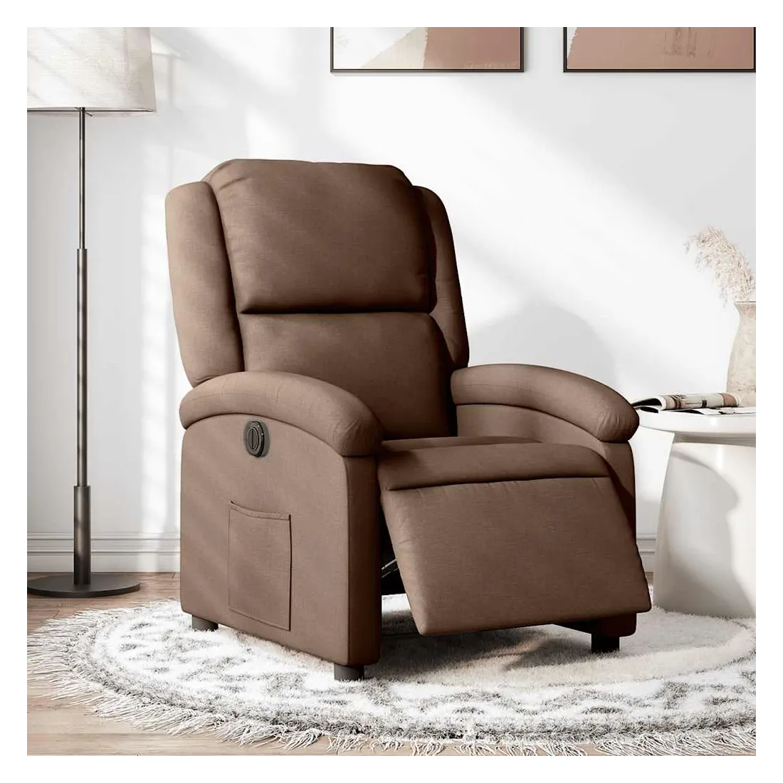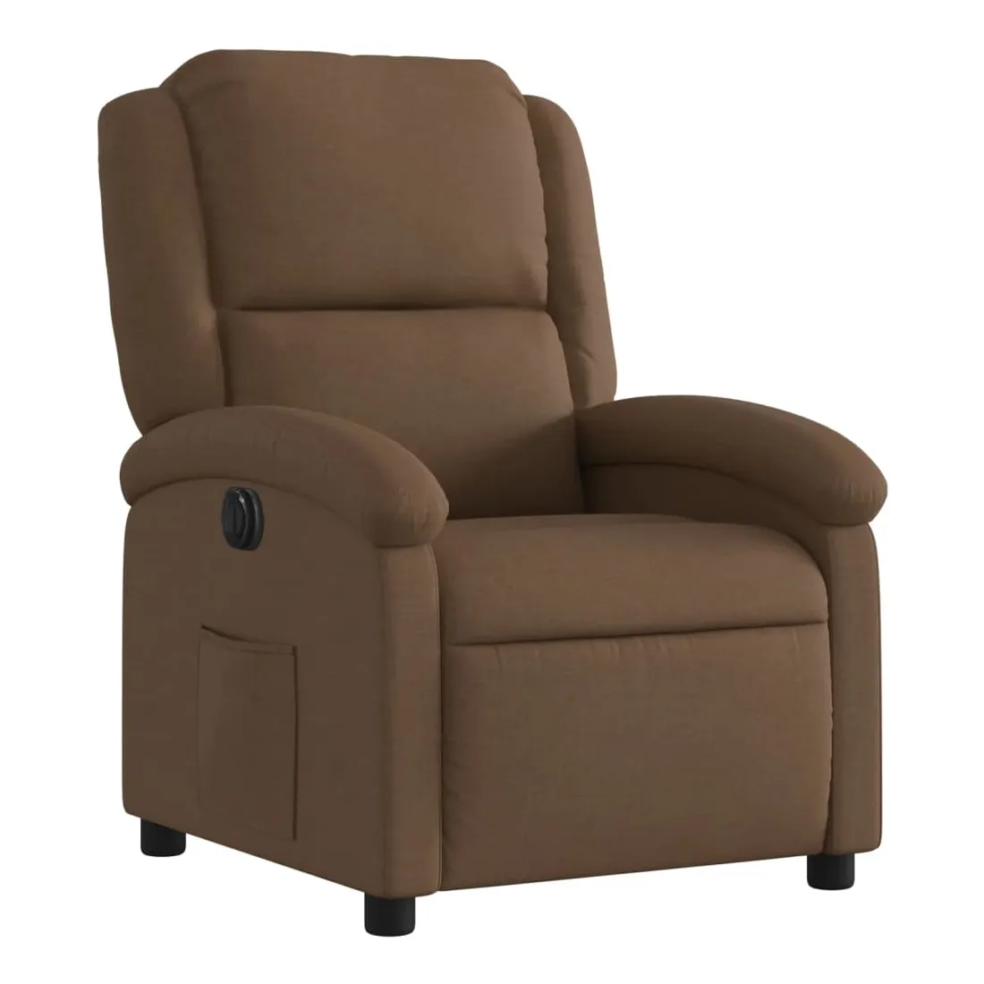 Asseyez-vous et détendez-vous dans ce fauteuil inclinable électrique très confortable ! Fonction d'inclinaison électrique : ce fauteuil inclinable est équipé d'un moteur électrique qui permet de régler automatiquement le repose-pied et le dossier dans n'importe quelle position, selon votre confort, en appuyant simplement sur le bouton situé sur le côté du fauteuil. Cette fonction permet une inclinaison maximale de 135 degrés. En outre, le dossier peut revenir automatiquement à sa position d'origine par une simple pression sur le bouton.Expérience d'assise confortable : le siège, le dossier et les larges accoudoirs bien rembourrés recouverts de tissu procurent une sensation confortable et chaleureuse, vous permettant de vous sentir enveloppé lorsque vous êtes assis. Le tissu présente un aspect simple et épuré et est respirant et durable.Poche latérale pratique : ce fauteuil est doté d'une poche latérale pour vous permettre de garder vos objets essentiels à portée de main.Cadre solide et stable : le cadre en bois et en métal offre une structure solide et une grande stabilité. Ce fauteuil inclinable est confortable et durable.