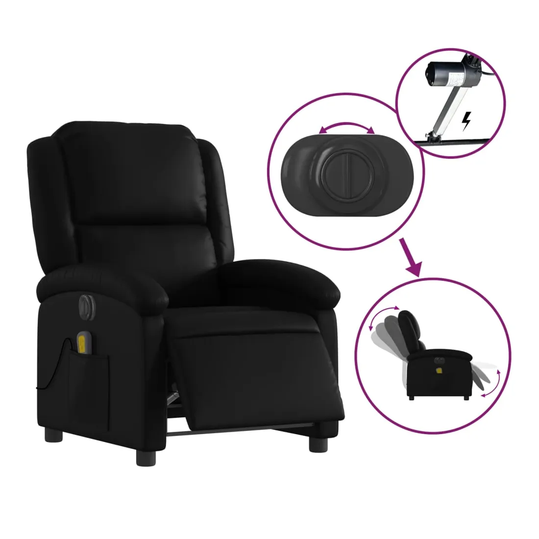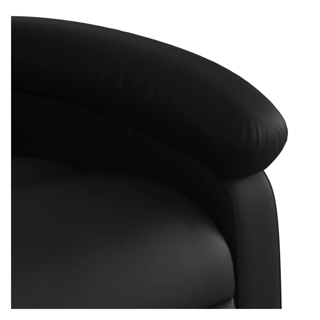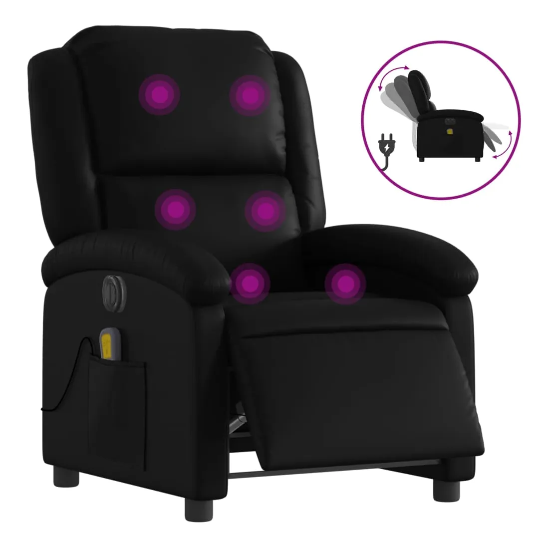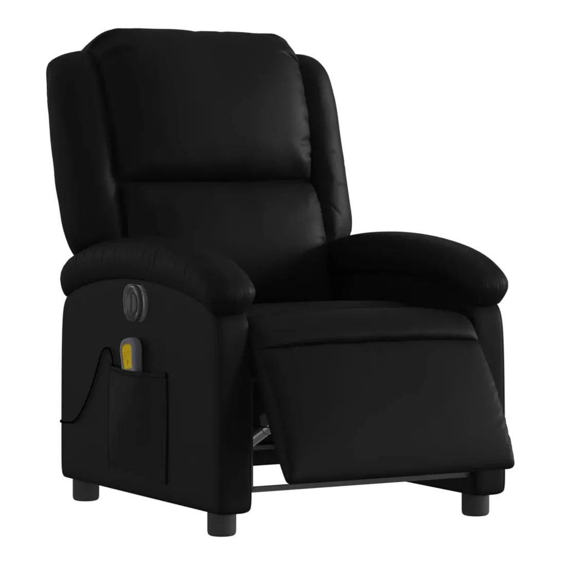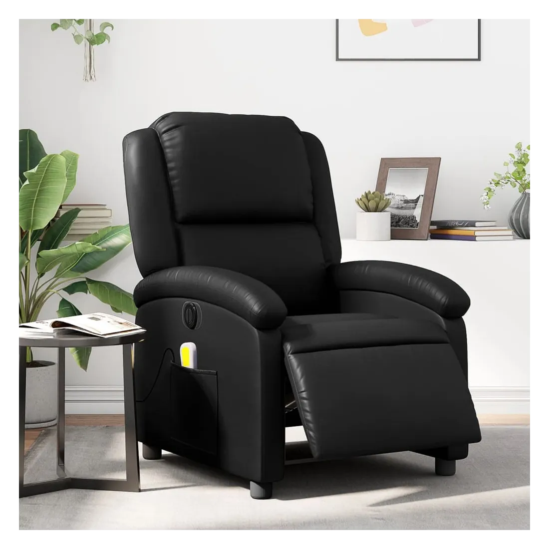 Asseyez-vous et détendez-vous dans ce fauteuil inclinable de massage électrique très confortable ! Fonction d'inclinaison électrique : ce fauteuil inclinable est équipé d'un moteur électrique qui permet de régler automatiquement le repose-pied et le dossier dans n'importe quelle position, selon votre confort, en appuyant simplement sur le bouton situé sur le côté du fauteuil. Cette fonction permet une inclinaison maximale de 135 degrés. En outre, le dossier peut revenir automatiquement à sa position d'origine par une simple pression sur le bouton.Fonction de vibration : les 6 points de massage vous permettent de faire l'expérience d'un massage mieux ciblé. De plus, la télécommande incluse vous permet de choisir différents programmes de massage. La fonction de massage est alimentée par le connecteur USB qui nécessite une source d'alimentation USB certifiée de 5 V (non fournie).Expérience de siège confortable : le siège, le dossier et les larges accoudoirs rembourrés épais recouverts de similicuir procurent une sensation confortable, vous faisant vous sentir enlacé lorsque vous êtes assis. Le similicuir est un matériau très résistant. Il est résistant aux taches, ce qui le rend facile à nettoyer avec un chiffon humide. La surface lisse donne également un aspect luxueux et la beauté du cuir véritable.Poche latérale pratique : ce fauteuil est doté d'une poche latérale pour ranger votre télécommande ou garder vos objets essentiels à portée de main.Cadre solide et stable : le cadre en bois et en métal offre une structure solide et une grande stabilité. Ce fauteuil inclinable est confortable et durable.