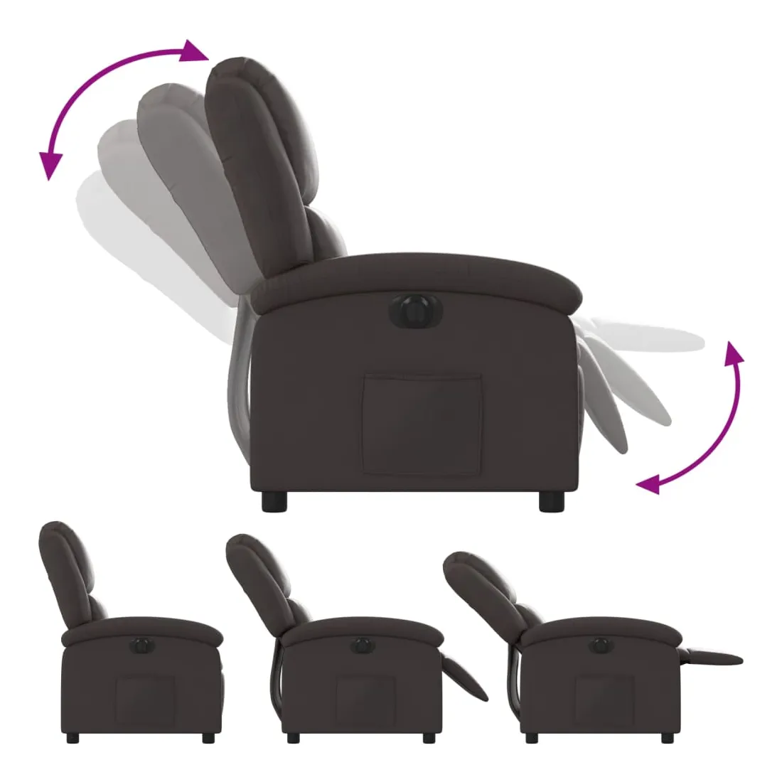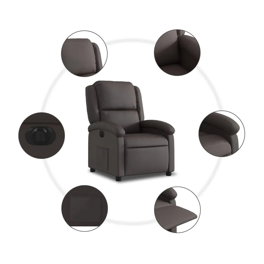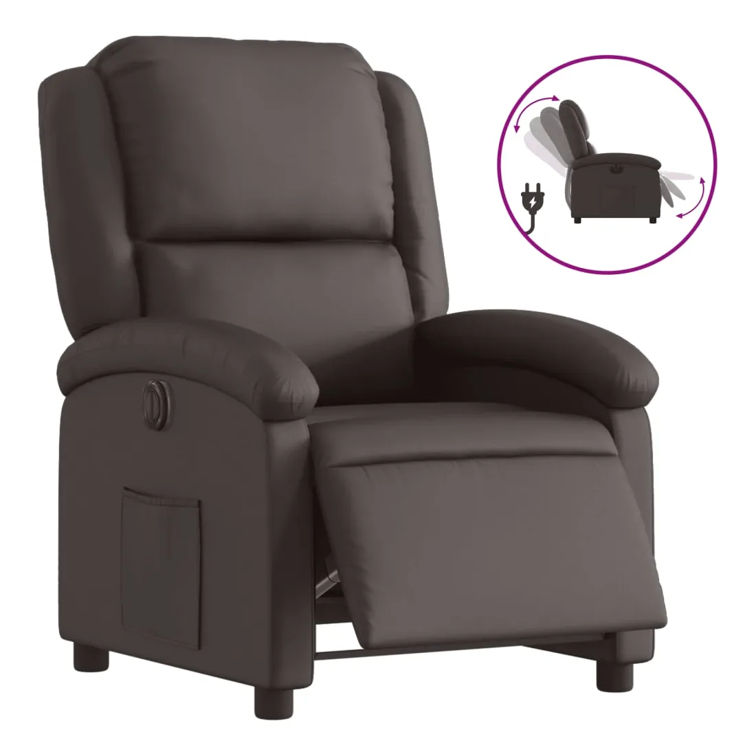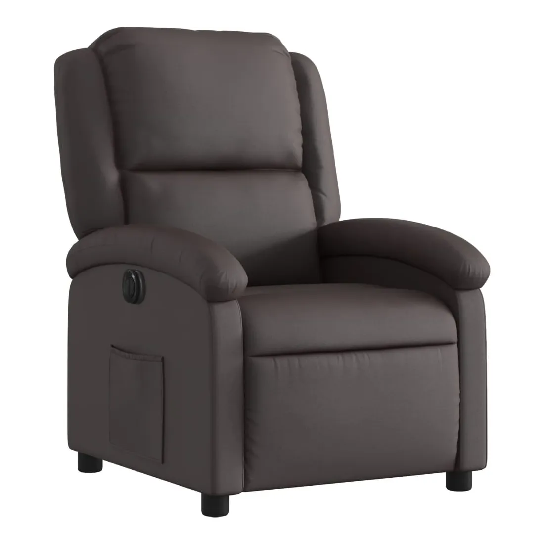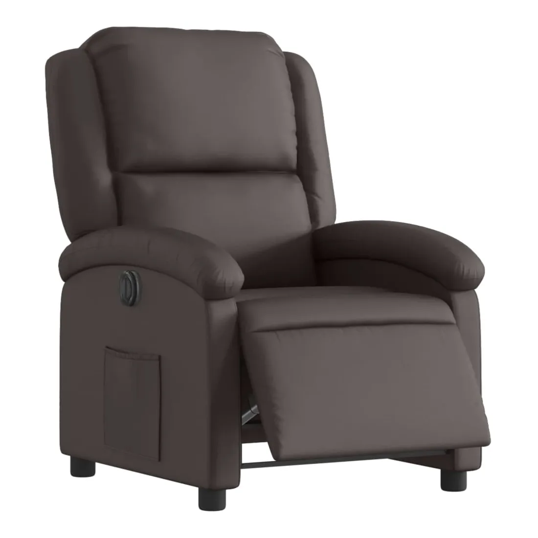Asseyez-vous et détendez-vous dans ce fauteuil inclinable électrique très confortable ! Fonction d'inclinaison électrique : ce fauteuil inclinable est équipé d'un moteur électrique qui permet de régler automatiquement le repose-pied et le dossier dans n'importe quelle position, selon votre confort, en appuyant simplement sur le bouton situé sur le côté du fauteuil. Cette fonction permet une inclinaison maximale de 135 degrés. En outre, le dossier peut revenir automatiquement à sa position d'origine par une simple pression sur le bouton.Expérience de siège confortable : le siège, le dossier et les larges accoudoirs rembourrés épais recouverts de cuir véritable procurent une sensation confortable et chaleureuse, vous faisant vous sentir enlacé lorsque vous êtes assis. Le cuir véritable est un matériau naturellement intemporel. Il peut durer toute une vie avec des soins et un entretien appropriés. La surface lisse lui donne également un aspect élégant tout en garantissant un confort optimal.Poche latérale pratique : ce fauteuil est doté d'une poche latérale pour vous permettre de garder vos objets essentiels à portée de main.Cadre solide et stable : le cadre en bois et en métal offre une structure solide et une grande stabilité. Ce fauteuil inclinable est confortable et durable.