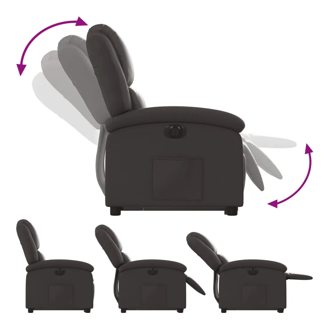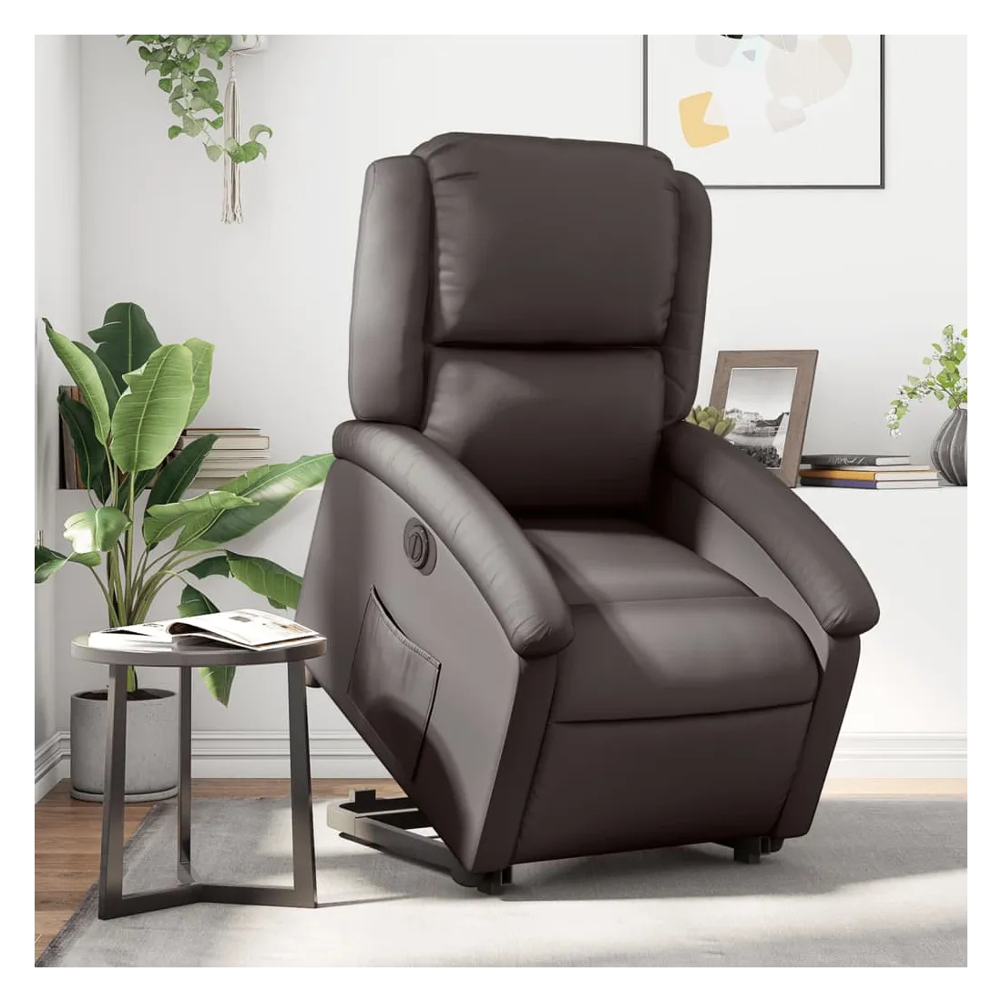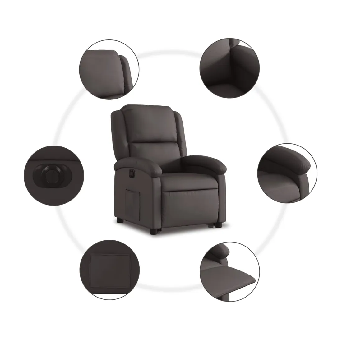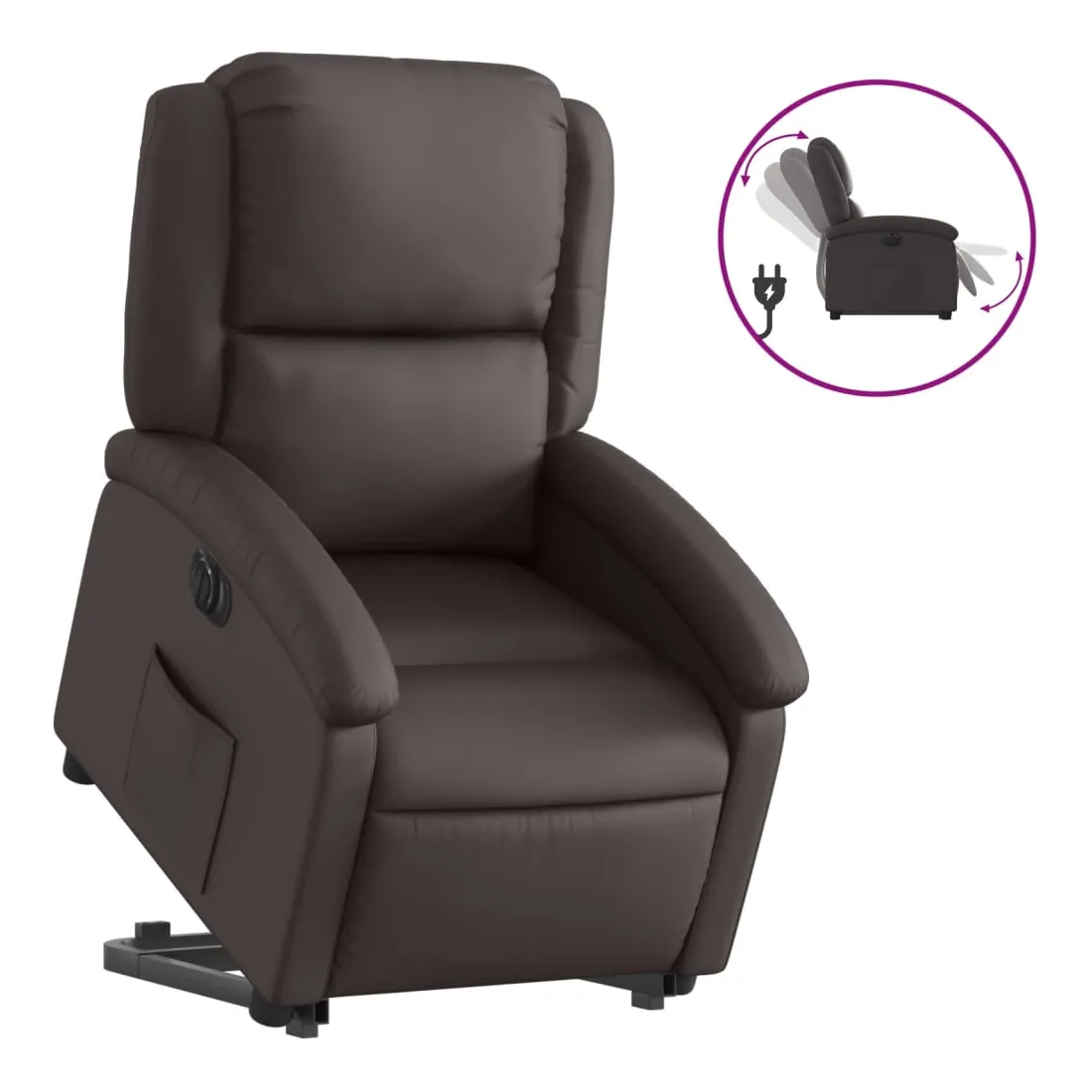 Asseyez-vous et détendez-vous dans ce fauteuil inclinable électrique très confortable ! Fonction de levage électrique : ce fauteuil inclinable pour personnes âgées est équipé d'un moteur électrique pour la fonction de levage. Grâce à la fonction qui pousse toute la chaise vers le haut, vous pouvez facilement vous tenir debout sans stresser votre dos et vos genoux en appuyant simplement sur le bouton.Fonction d'inclinaison électrique : ce fauteuil inclinable est également équipé d'un moteur électrique qui permet de régler automatiquement le repose-pied et le dossier dans n'importe quelle position, selon votre confort, en appuyant simplement sur le bouton situé sur le côté du fauteuil. Cette fonction permet une inclinaison maximale de 135 degrés. En outre, le dossier peut revenir automatiquement à sa position d'origine par une simple pression sur le bouton.Expérience de siège confortable : le siège, le dossier et les larges accoudoirs rembourrés épais recouverts de cuir véritable procurent une sensation confortable et chaleureuse, vous faisant vous sentir enlacé lorsque vous êtes assis. Le cuir véritable est un matériau naturellement intemporel. Il peut durer toute une vie avec des soins et un entretien appropriés. La surface lisse lui donne également un aspect élégant tout en garantissant un confort optimal.Poche latérale pratique : ce fauteuil est doté d'une poche latérale pour vous permettre de garder vos objets essentiels à portée de main.Cadre solide et stable : le cadre en bois et en métal offre une structure solide et une grande stabilité. Ce fauteuil inclinable est confortable et durable.
