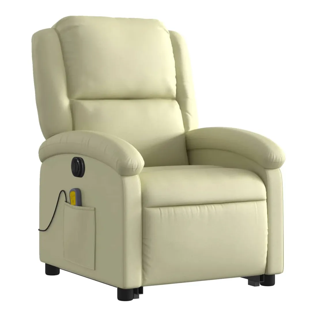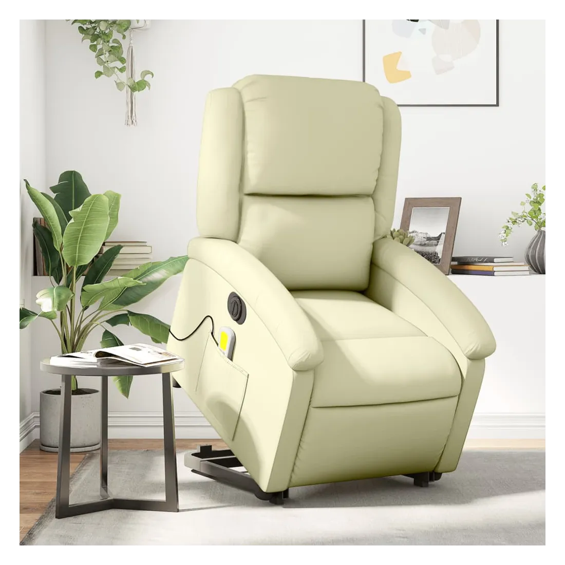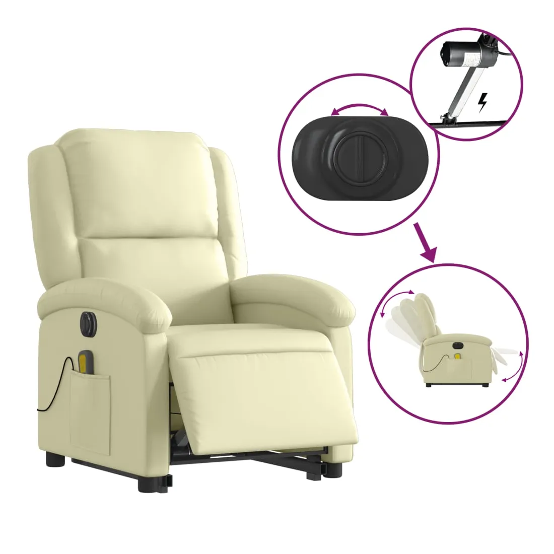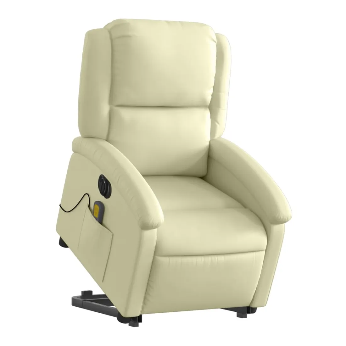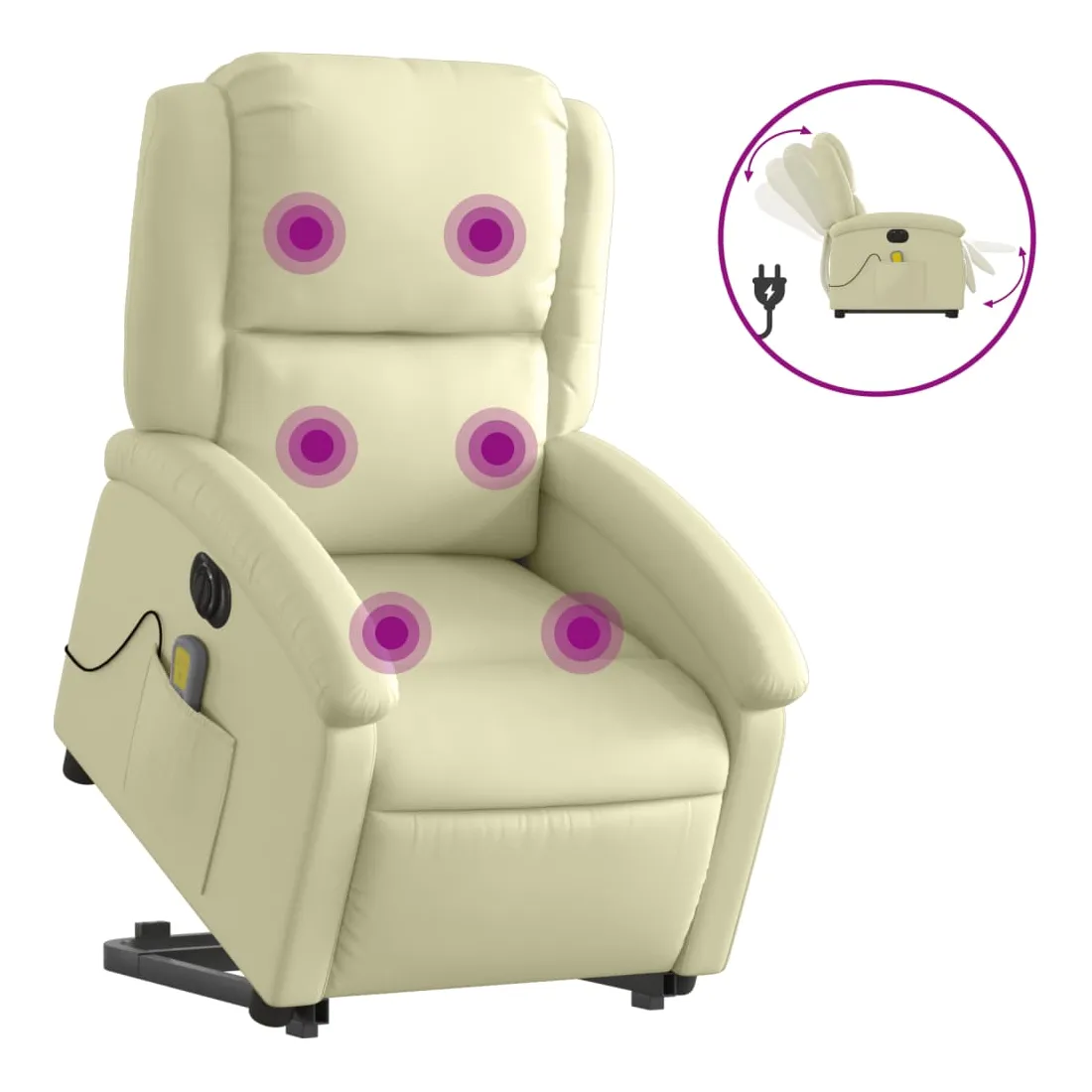 Asseyez-vous et détendez-vous dans ce fauteuil inclinable de massage électrique très confortable ! Fonction de levage électrique : ce fauteuil inclinable pour personnes âgées est équipé d'un moteur électrique pour la fonction de levage. Grâce à la fonction qui pousse toute la chaise vers le haut, vous pouvez facilement vous tenir debout sans stresser votre dos et vos genoux en appuyant simplement sur le bouton.Fonction d'inclinaison électrique : ce fauteuil inclinable est également équipé d'un moteur électrique qui permet de régler automatiquement le repose-pied et le dossier dans n'importe quelle position, selon votre confort, en appuyant simplement sur le bouton situé sur le côté du fauteuil. Cette fonction permet une inclinaison maximale de 135 degrés. En outre, le dossier peut revenir automatiquement à sa position d'origine par une simple pression sur le bouton.Fonction de vibration : les 6 points de massage vous permettent de faire l'expérience d'un massage mieux ciblé. De plus, la télécommande incluse vous permet de choisir différents programmes de massage. La fonction de massage est alimentée par le connecteur USB qui nécessite une source d'alimentation USB certifiée de 5 V (non fournie).Expérience de siège confortable : le siège, le dossier et les larges accoudoirs rembourrés épais recouverts de cuir véritable procurent une sensation confortable et chaleureuse, vous faisant vous sentir enlacé lorsque vous êtes assis. Le cuir véritable est un matériau naturellement intemporel. Il peut durer toute une vie avec des soins et un entretien appropriés. La surface lisse lui donne également un aspect élégant tout en garantissant un confort optimal.Poche latérale pratique : ce fauteuil est doté d'une poche latérale pour ranger votre télécommande ou garder vos objets essentiels à portée de main.Cadre solide et stable : le cadre en bois et en métal offre une structure solide et une grande stabilité. Ce fauteuil inclinable est confortable et durable.
