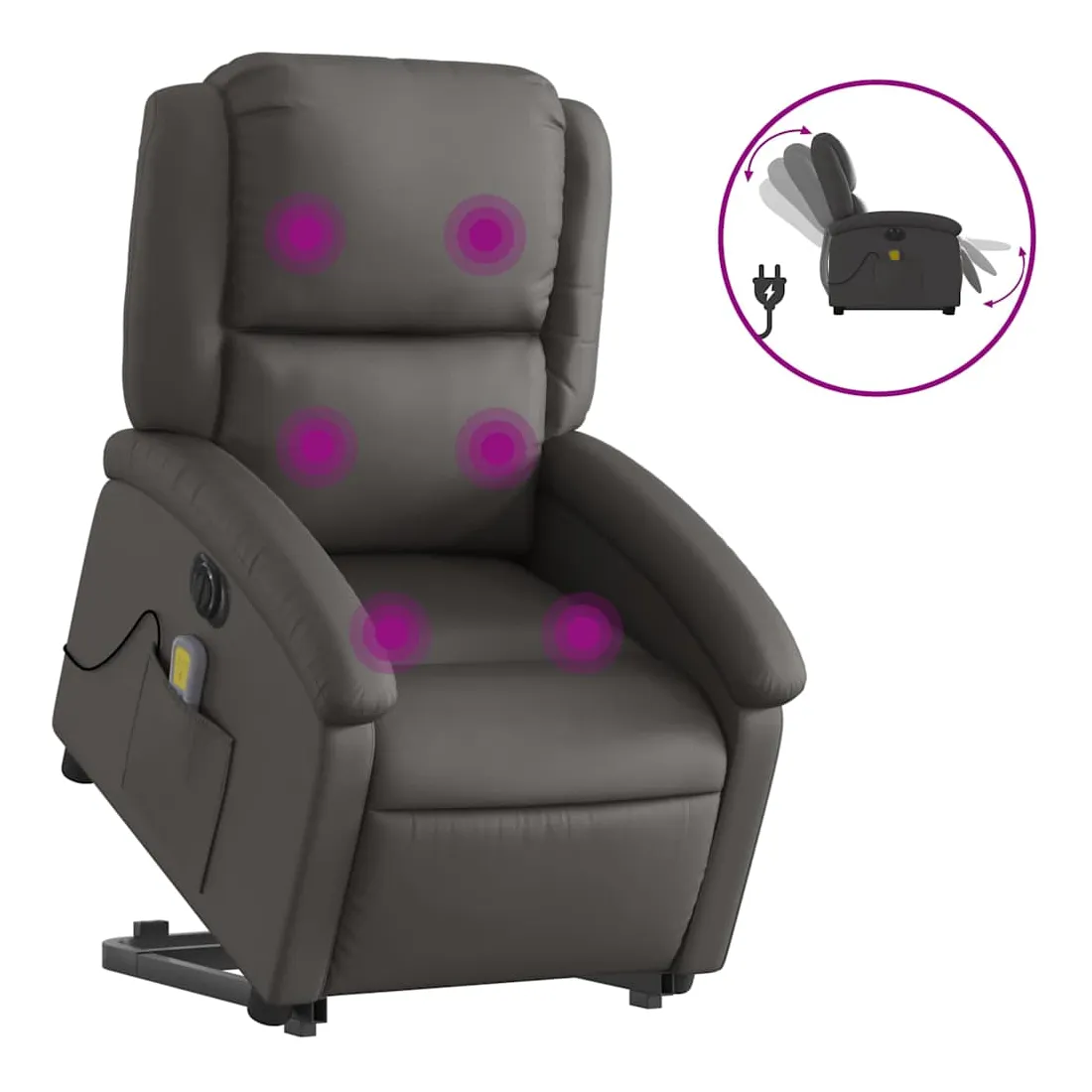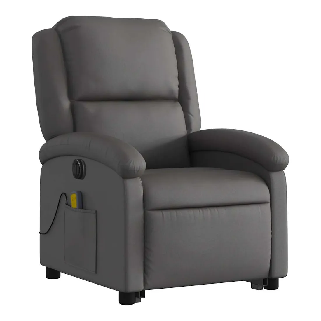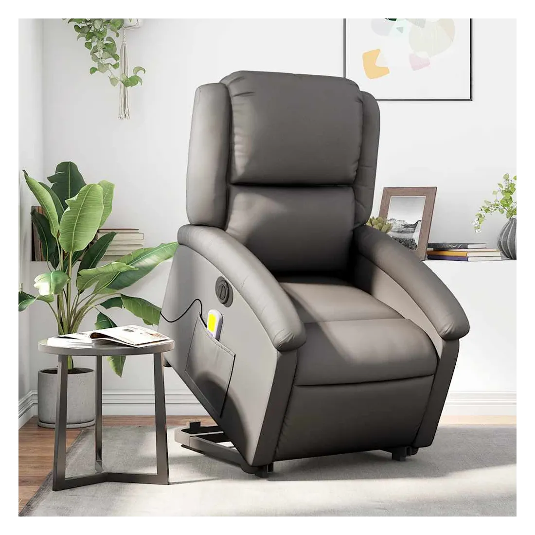 Asseyez-vous et détendez-vous dans ce fauteuil inclinable de massage électrique très confortable ! Fonction de levage électrique : ce fauteuil inclinable pour personnes âgées est équipé d'un moteur électrique pour la fonction de levage. Grâce à la fonction qui pousse toute la chaise vers le haut, vous pouvez facilement vous tenir debout sans stresser votre dos et vos genoux en appuyant simplement sur le bouton.Fonction d'inclinaison électrique : ce fauteuil inclinable est également équipé d'un moteur électrique qui permet de régler automatiquement le repose-pied et le dossier dans n'importe quelle position, selon votre confort, en appuyant simplement sur le bouton situé sur le côté du fauteuil. Cette fonction permet une inclinaison maximale de 135 degrés. En outre, le dossier peut revenir automatiquement à sa position d'origine par une simple pression sur le bouton.Fonction de vibration : les 6 points de massage vous permettent de faire l'expérience d'un massage mieux ciblé. De plus, la télécommande incluse vous permet de choisir différents programmes de massage. La fonction de massage est alimentée par le connecteur USB qui nécessite une source d'alimentation USB certifiée de 5 V (non fournie).Expérience de siège confortable : le siège, le dossier et les larges accoudoirs rembourrés épais recouverts de cuir véritable procurent une sensation confortable et chaleureuse, vous faisant vous sentir enlacé lorsque vous êtes assis. Le cuir véritable est un matériau naturellement intemporel. Il peut durer toute une vie avec des soins et un entretien appropriés. La surface lisse lui donne également un aspect élégant tout en garantissant un confort optimal.Poche latérale pratique : ce fauteuil est doté d'une poche latérale pour ranger votre télécommande ou garder vos objets essentiels à portée de main.Cadre solide et stable : le cadre en bois et en métal offre une structure solide et une grande stabilité. Ce fauteuil inclinable est confortable et durable.