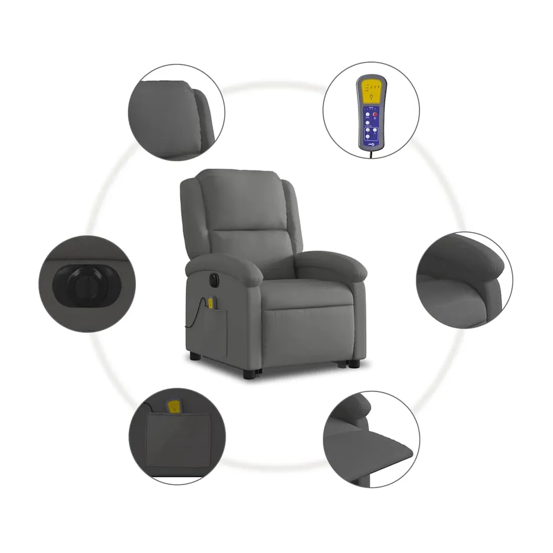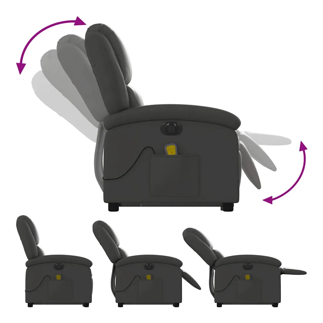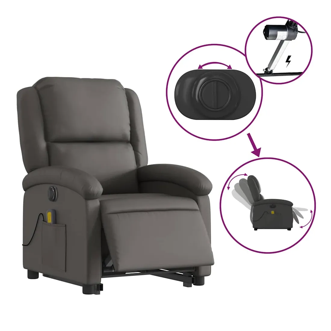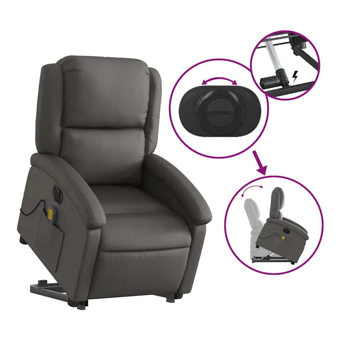 Asseyez-vous et détendez-vous dans ce fauteuil inclinable de massage électrique très confortable ! Fonction de levage électrique : ce fauteuil inclinable pour personnes âgées est équipé d'un moteur électrique pour la fonction de levage. Grâce à la fonction qui pousse toute la chaise vers le haut, vous pouvez facilement vous tenir debout sans stresser votre dos et vos genoux en appuyant simplement sur le bouton.Fonction d'inclinaison électrique : ce fauteuil inclinable est également équipé d'un moteur électrique qui permet de régler automatiquement le repose-pied et le dossier dans n'importe quelle position, selon votre confort, en appuyant simplement sur le bouton situé sur le côté du fauteuil. Cette fonction permet une inclinaison maximale de 135 degrés. En outre, le dossier peut revenir automatiquement à sa position d'origine par une simple pression sur le bouton.Fonction de vibration : les 6 points de massage vous permettent de faire l'expérience d'un massage mieux ciblé. De plus, la télécommande incluse vous permet de choisir différents programmes de massage. La fonction de massage est alimentée par le connecteur USB qui nécessite une source d'alimentation USB certifiée de 5 V (non fournie).Expérience de siège confortable : le siège, le dossier et les larges accoudoirs rembourrés épais recouverts de cuir véritable procurent une sensation confortable et chaleureuse, vous faisant vous sentir enlacé lorsque vous êtes assis. Le cuir véritable est un matériau naturellement intemporel. Il peut durer toute une vie avec des soins et un entretien appropriés. La surface lisse lui donne également un aspect élégant tout en garantissant un confort optimal.Poche latérale pratique : ce fauteuil est doté d'une poche latérale pour ranger votre télécommande ou garder vos objets essentiels à portée de main.Cadre solide et stable : le cadre en bois et en métal offre une structure solide et une grande stabilité. Ce fauteuil inclinable est confortable et durable.