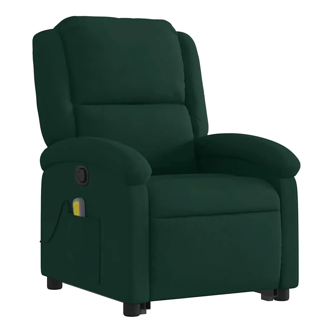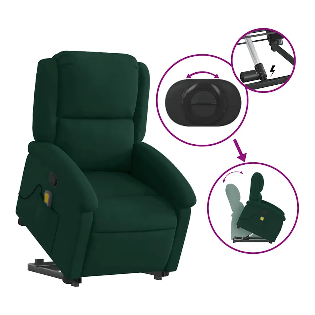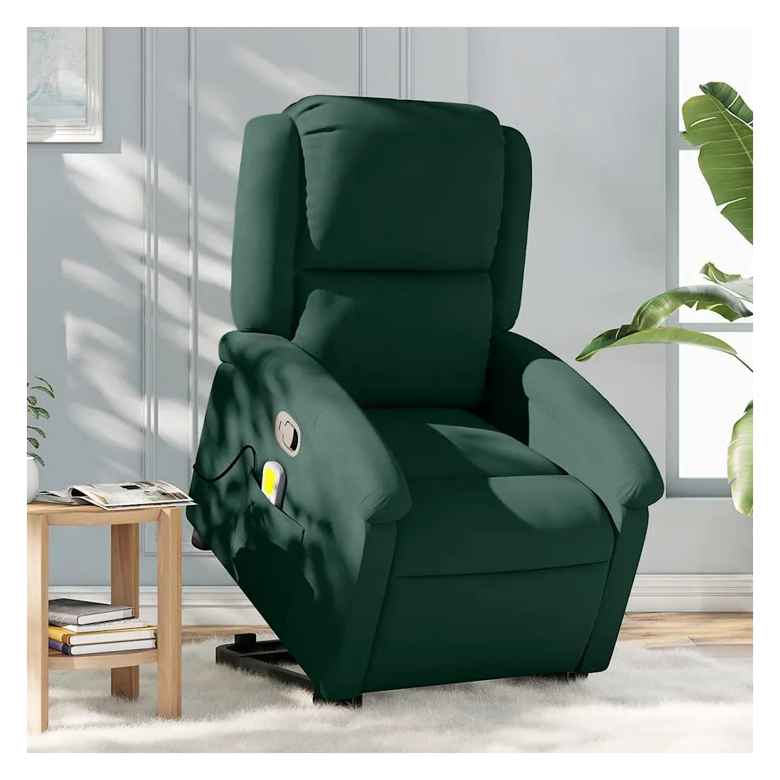 Asseyez-vous et détendez-vous dans ce fauteuil inclinable de massage très confortable ! Fonction de levage électrique : ce fauteuil inclinable pour personnes âgées est équipé d'un moteur électrique pour la fonction de levage. Grâce à la fonction qui pousse toute la chaise vers le haut, vous pouvez facilement vous tenir debout sans stresser votre dos et vos genoux en appuyant simplement sur le bouton.Fonction d'inclinaison manuelle : ce fauteuil inclinable est doté d'une poignée du côté droit. Vous pouvez régler manuellement le repose-pieds et le dossier dans n'importe quelle position selon votre confort en tirant simplement sur la poignée. Cette fonction permet une inclinaison maximale de 135 degrés. De plus, le dossier peut revenir rapidement à sa position d'origine en tirant simplement sur la poignée.Fonction de vibration : les 6 points de massage vous permettent de faire l'expérience d'un massage mieux ciblé. De plus, la télécommande incluse vous permet de choisir différents programmes de massage. La fonction de massage est alimentée par le connecteur USB qui nécessite une source d'alimentation USB certifiée de 5 V (non fournie).Expérience d'assise confortable : le siège, le dossier et les larges accoudoirs rembourrés épais recouverts de velours procurent une sensation confortable et chaleureuse, vous faisant vous sentir enlacé lorsque vous êtes assis. Le velours est un tissu doux et confortable qui est agréable sur la peau.Poche latérale pratique : ce fauteuil est doté d'une poche latérale pour ranger votre télécommande ou garder vos objets essentiels à portée de main.Cadre solide et stable : le cadre en bois et en métal offre une structure solide et une grande stabilité. Ce fauteuil inclinable est confortable et durable.